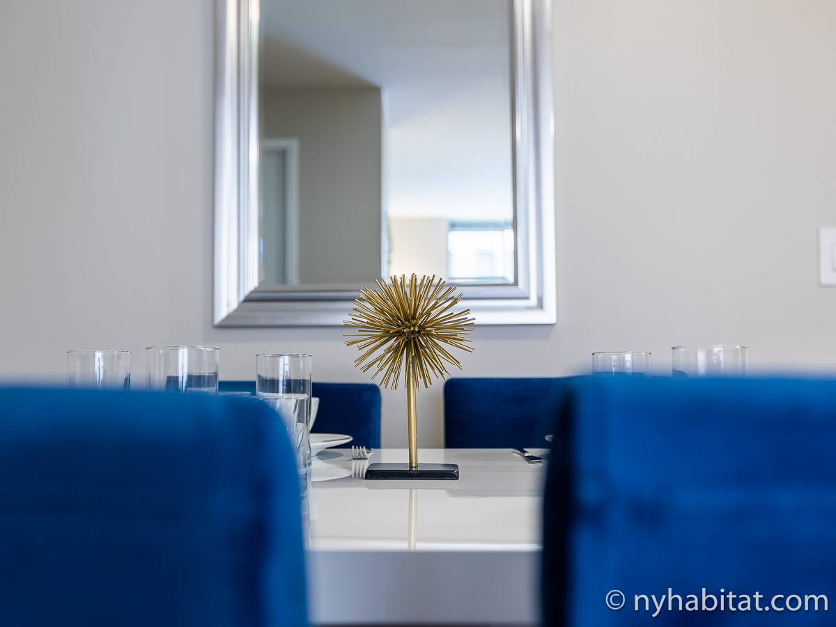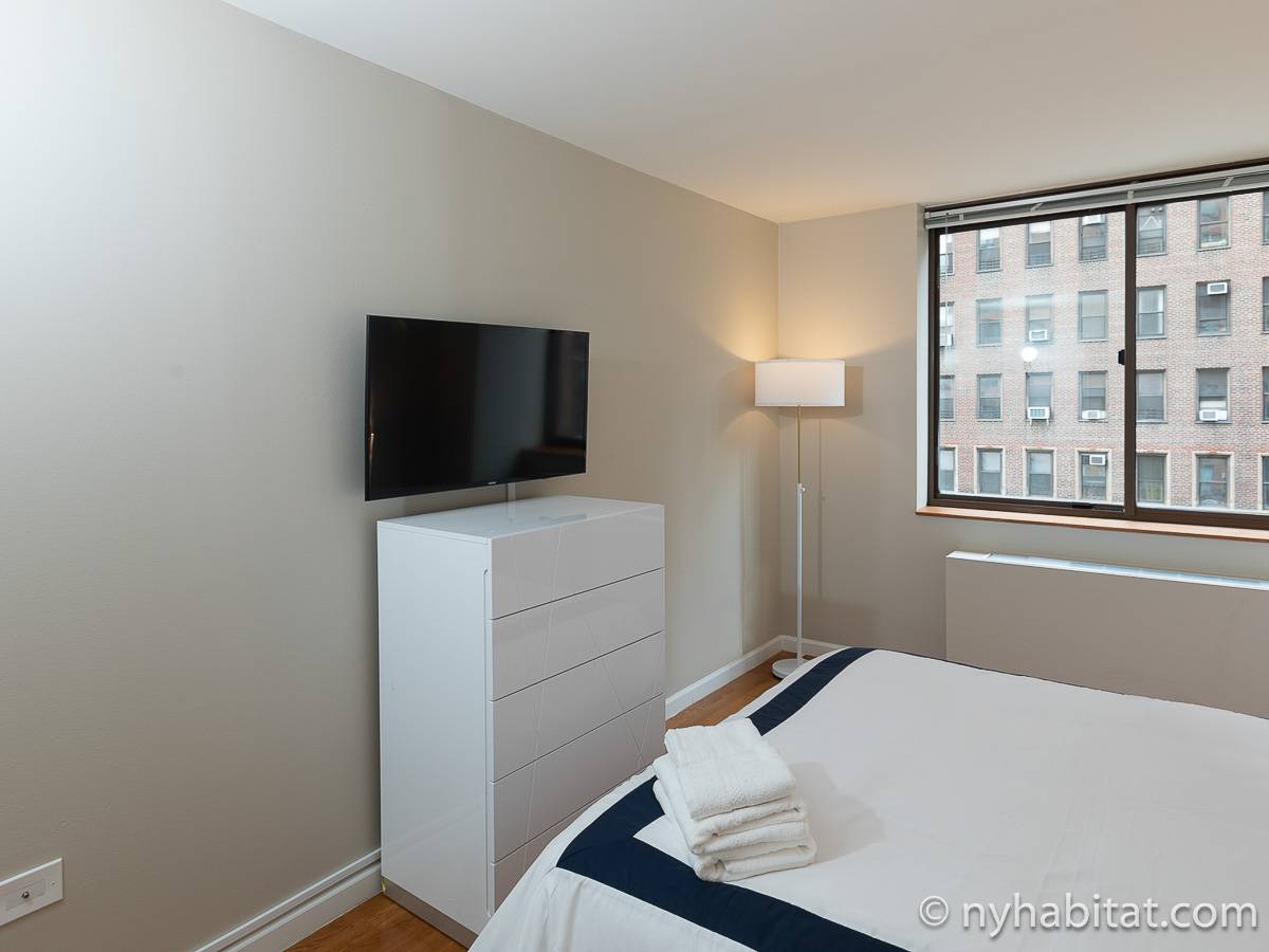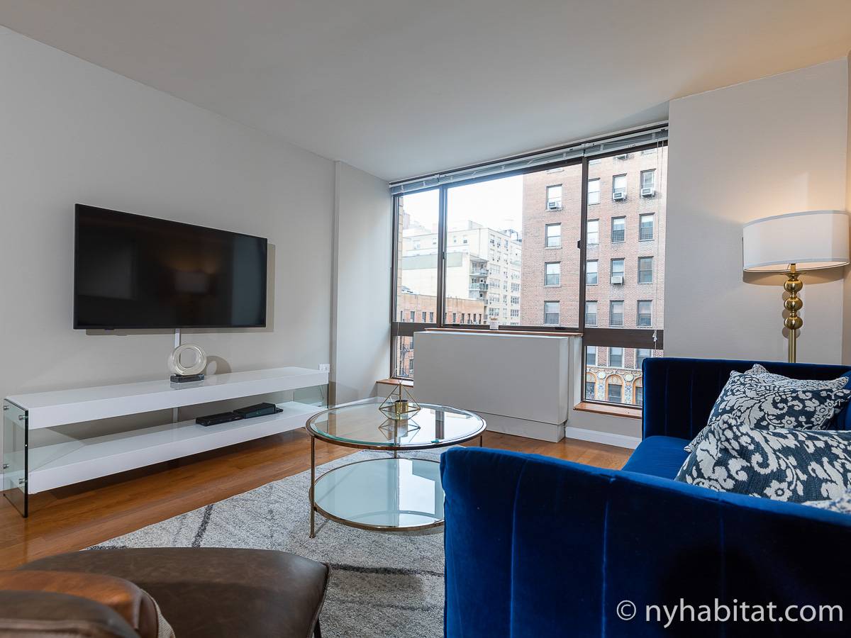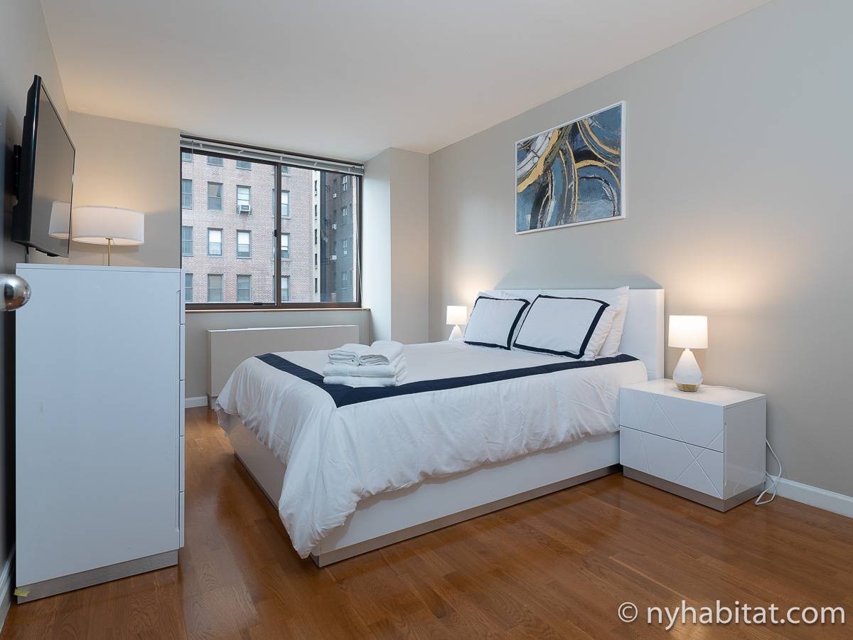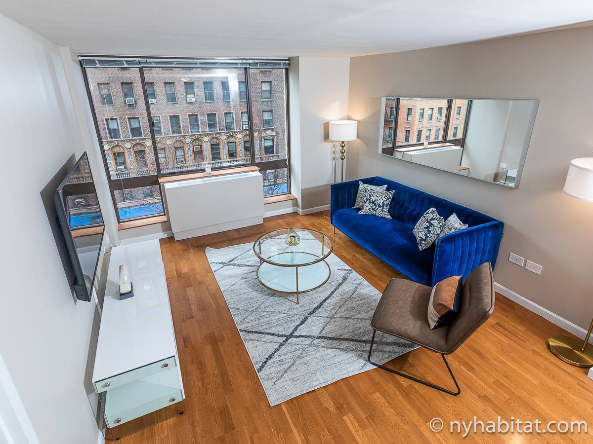 Die möblierte New Yorker Mietwohnung ist modern eingerichtet und bietet einen Hartholzboden. Die Fenster im Wohnzimmer bieten einen Blick auf die Stadt. Das Wohnzimmer ist mit einem Sofa, gepolsterten Stuhl, Couchtisch sowie wandmontierten Flachbildfernseher mit Kabelanschluss ausgestattet. Ein Esstisch mit sechs Stühlen befindet sich neben der offenen Küche. Die Küche ist mit Schränken samt Granitarbeitsflächen und Elektrogeräten aus Edelstahl einschließlich einem Herd, Toaster, Kühlschrank, Geschirrspüler und einer Mikrowelle ausgestattet. Beide Schlafzimmer verfügen über Queensize-Betten, Nachttische mit Lampen und Kommoden. Das Schlafzimmer 2 bietet zusätzlich einen Fernseher. In den beiden Badezimmern der 3-Zimmer-Wohnung sind jeweils eine Duschbadewanne, ein Spiegel und Waschtisch vorhanden. Möglichkeiten zum Waschen von Kleidung befinden sich im Gebäude.