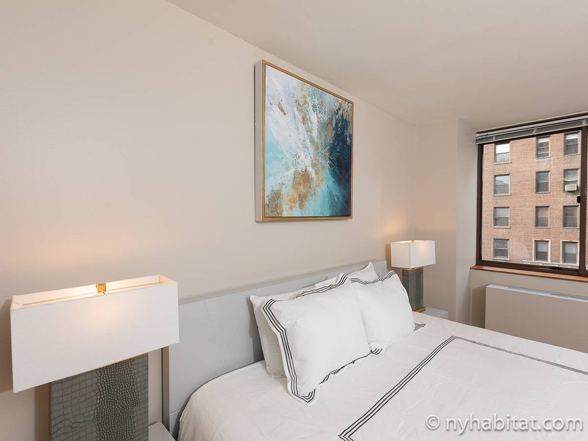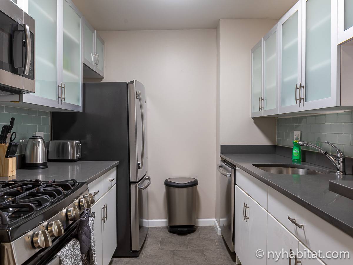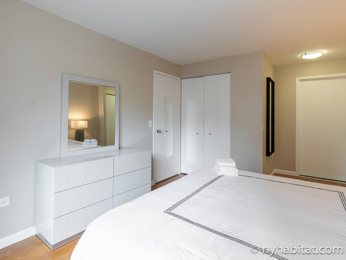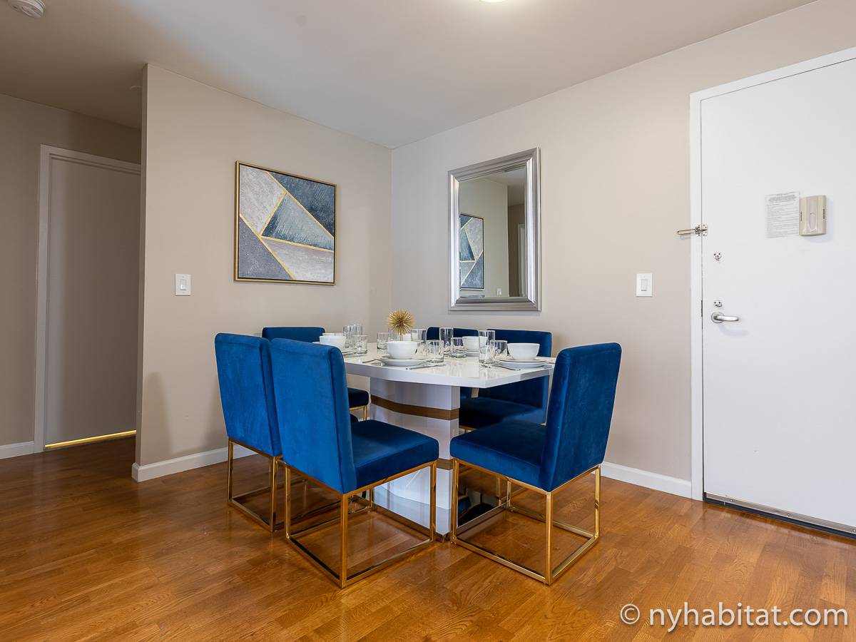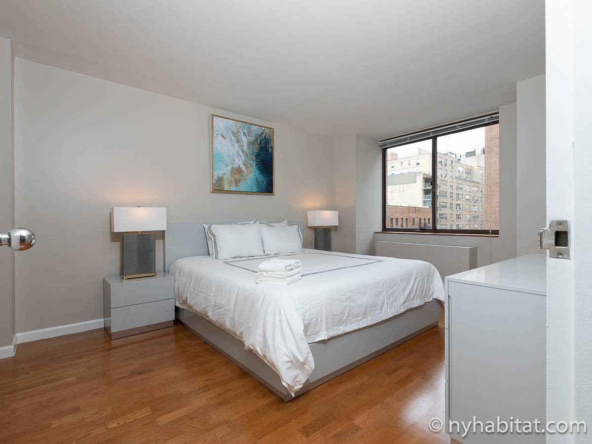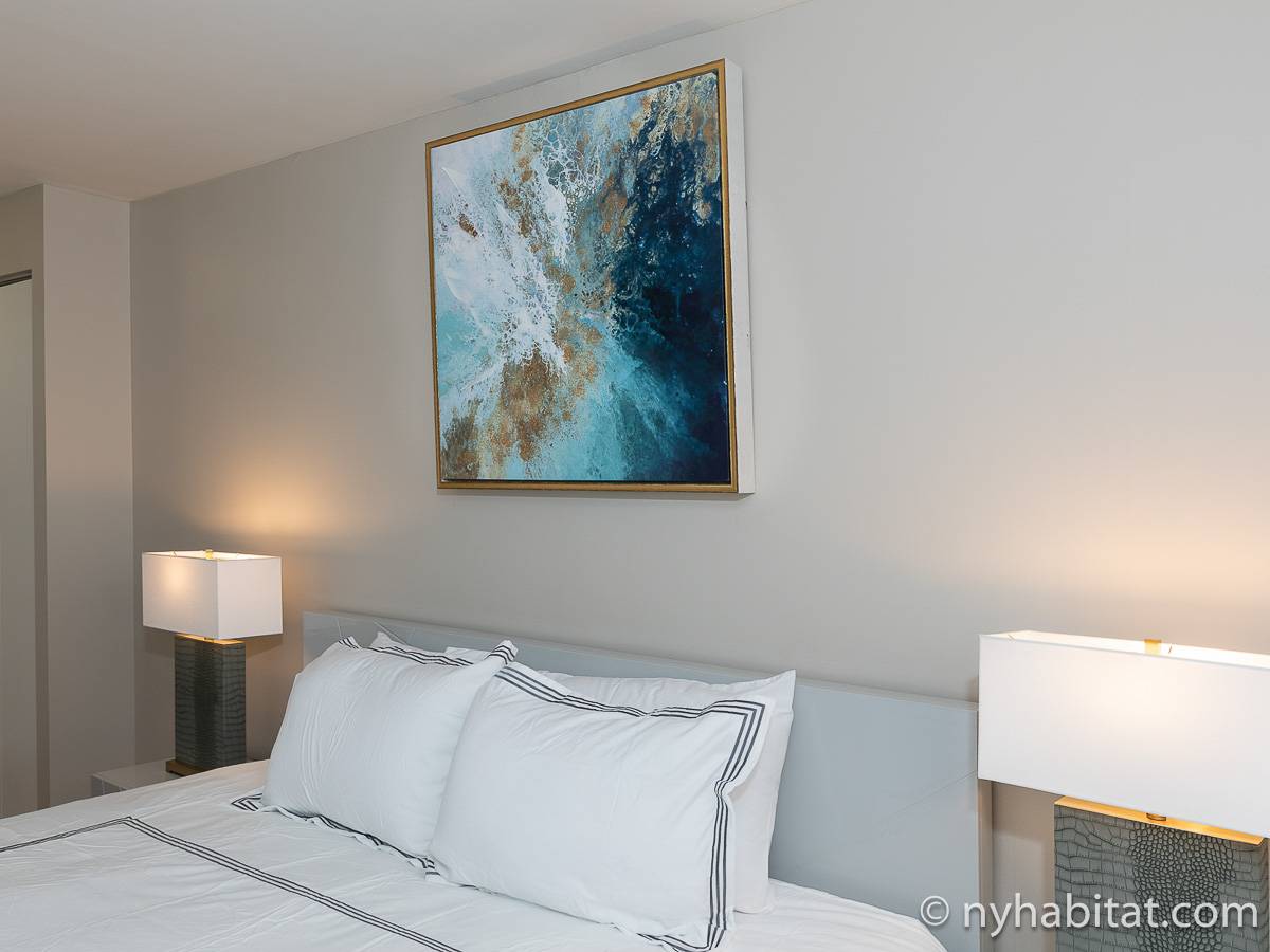 Die möblierte New Yorker Mietwohnung ist modern eingerichtet und bietet einen Hartholzboden. Die Fenster im Wohnzimmer bieten einen Blick auf die Stadt. Das Wohnzimmer ist mit einem Sofa, gepolsterten Stuhl, Couchtisch sowie wandmontierten Flachbildfernseher mit Kabelanschluss ausgestattet. Ein Esstisch mit sechs Stühlen befindet sich neben der offenen Küche. Die Küche ist mit Schränken samt Granitarbeitsflächen und Elektrogeräten aus Edelstahl einschließlich einem Herd, Toaster, Kühlschrank, Geschirrspüler und einer Mikrowelle ausgestattet. Beide Schlafzimmer verfügen über Queensize-Betten, Nachttische mit Lampen und Kommoden. Das Schlafzimmer 2 bietet zusätzlich einen Fernseher. In den beiden Badezimmern der 3-Zimmer-Wohnung sind jeweils eine Duschbadewanne, ein Spiegel und Waschtisch vorhanden. Möglichkeiten zum Waschen von Kleidung befinden sich im Gebäude.