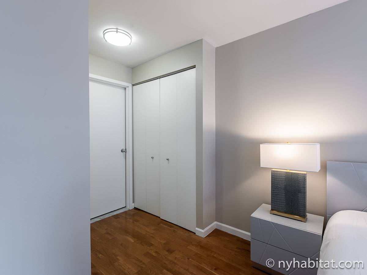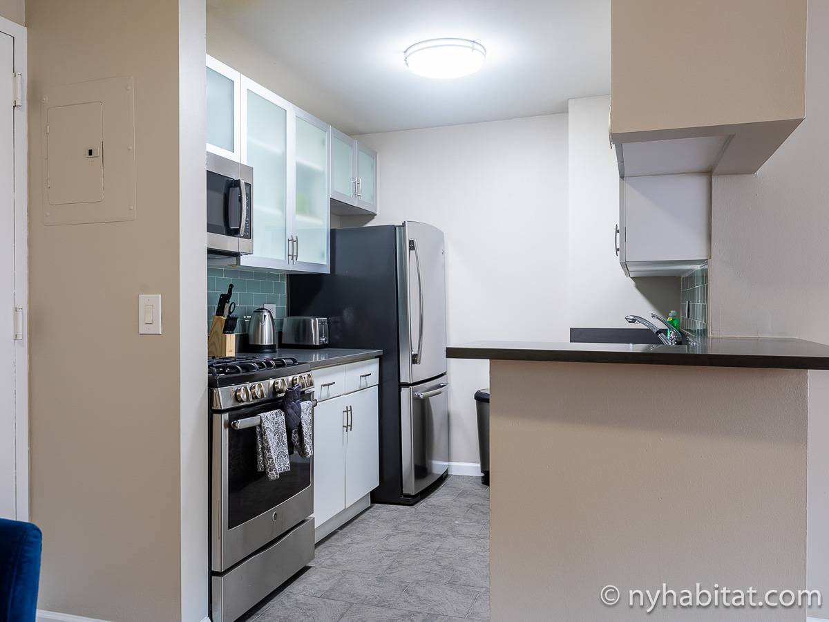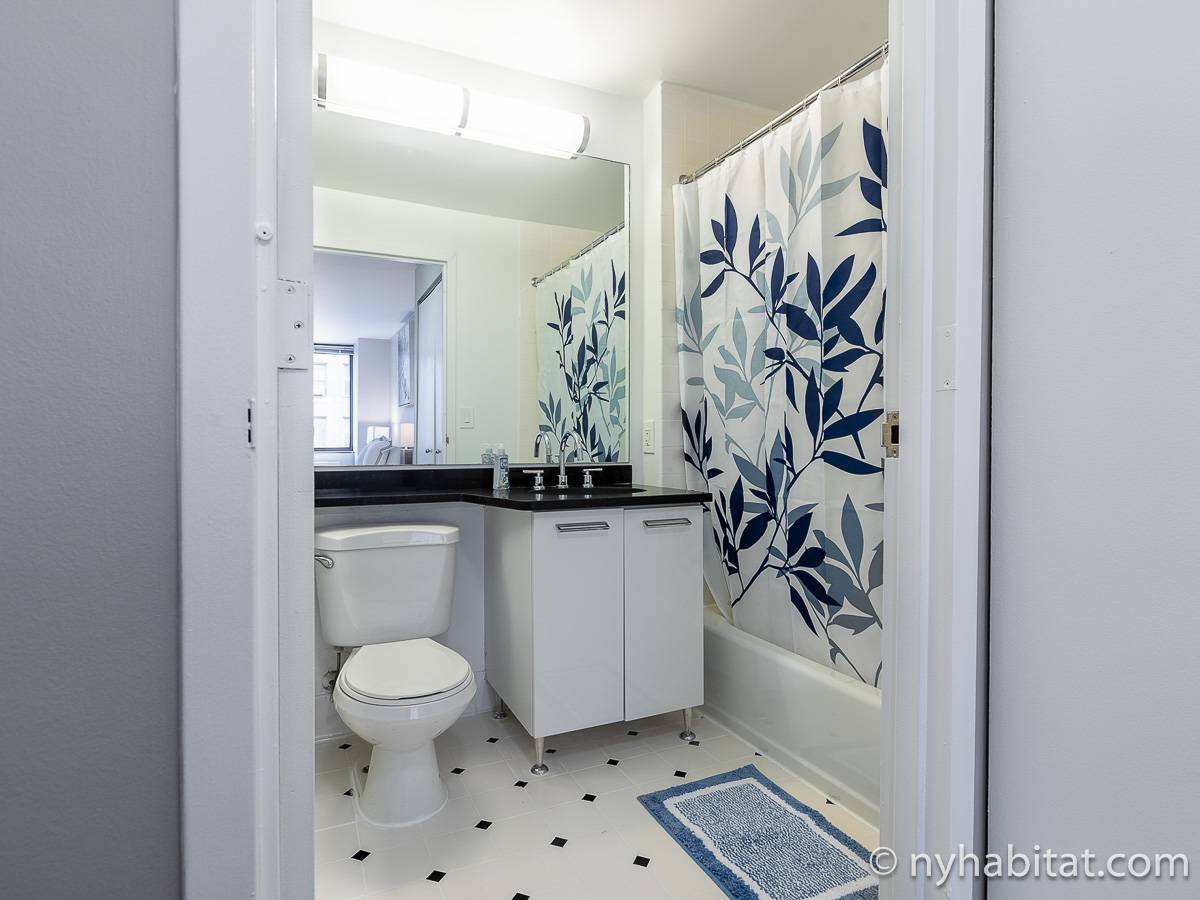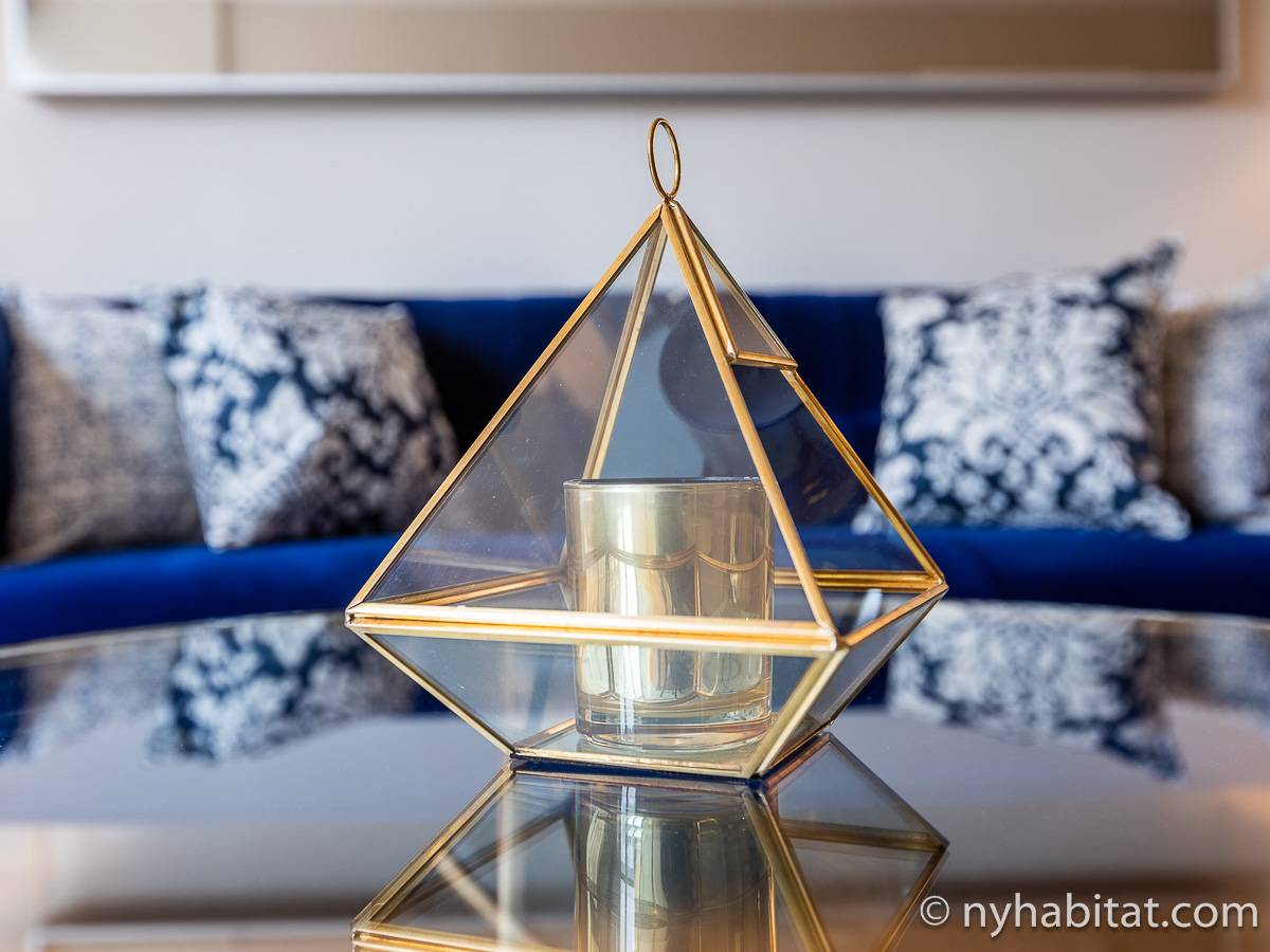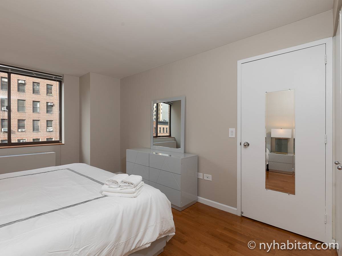 Die möblierte New Yorker Mietwohnung ist modern eingerichtet und bietet einen Hartholzboden. Die Fenster im Wohnzimmer bieten einen Blick auf die Stadt. Das Wohnzimmer ist mit einem Sofa, gepolsterten Stuhl, Couchtisch sowie wandmontierten Flachbildfernseher mit Kabelanschluss ausgestattet. Ein Esstisch mit sechs Stühlen befindet sich neben der offenen Küche. Die Küche ist mit Schränken samt Granitarbeitsflächen und Elektrogeräten aus Edelstahl einschließlich einem Herd, Toaster, Kühlschrank, Geschirrspüler und einer Mikrowelle ausgestattet. Beide Schlafzimmer verfügen über Queensize-Betten, Nachttische mit Lampen und Kommoden. Das Schlafzimmer 2 bietet zusätzlich einen Fernseher. In den beiden Badezimmern der 3-Zimmer-Wohnung sind jeweils eine Duschbadewanne, ein Spiegel und Waschtisch vorhanden. Möglichkeiten zum Waschen von Kleidung befinden sich im Gebäude.