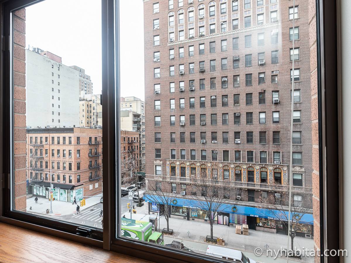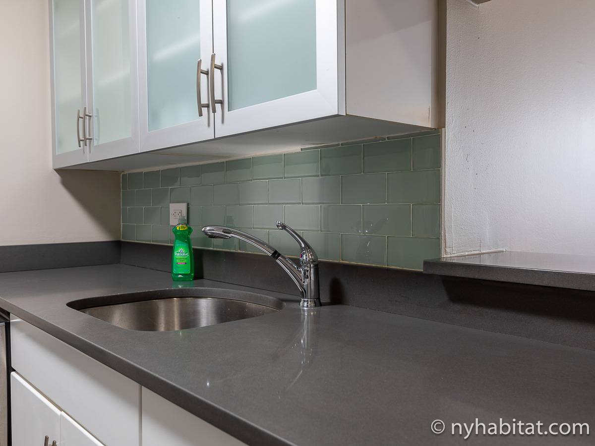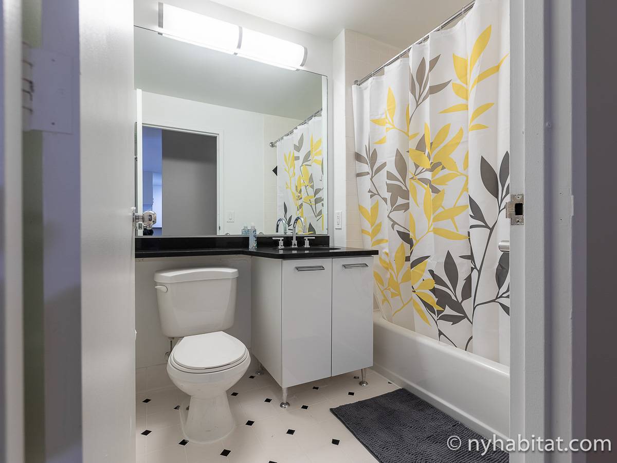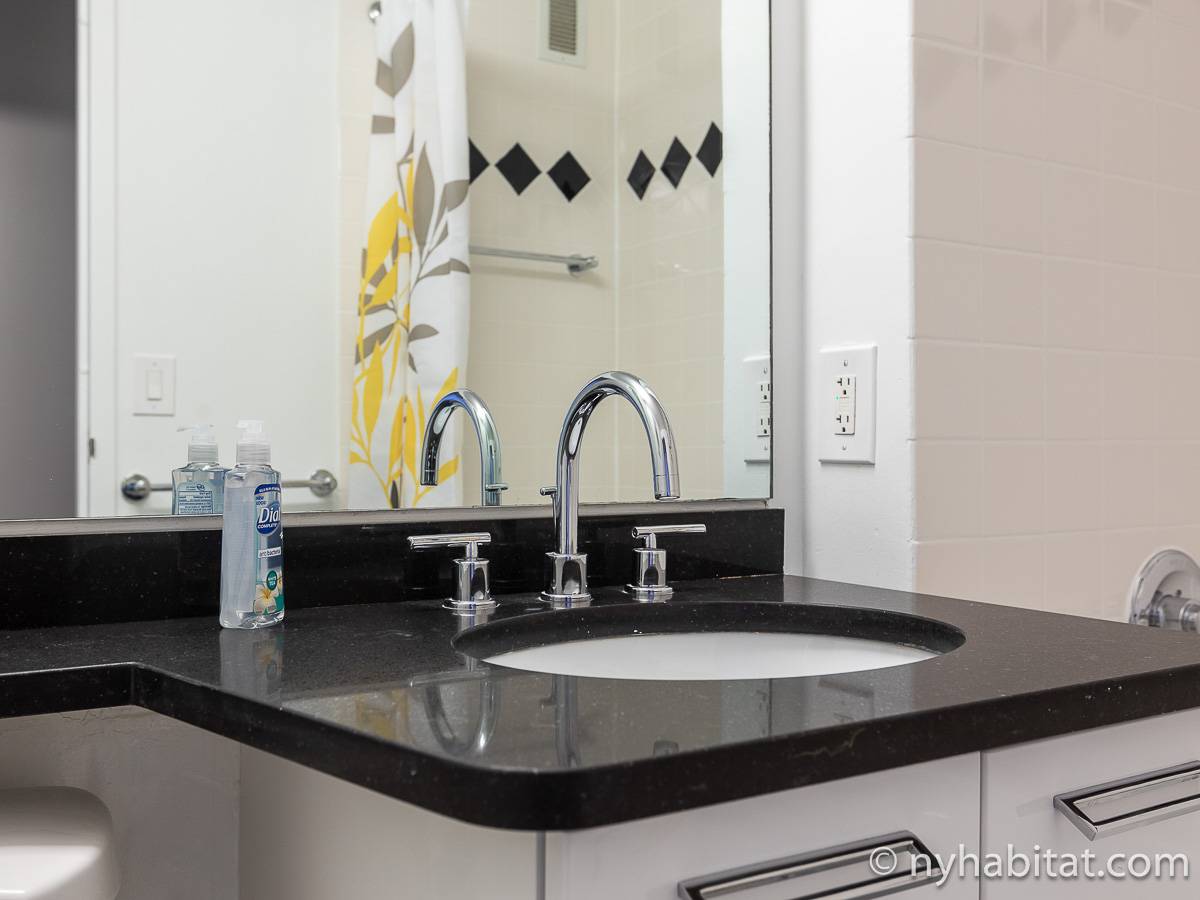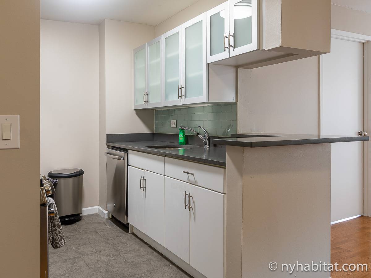 Die möblierte New Yorker Mietwohnung ist modern eingerichtet und bietet einen Hartholzboden. Die Fenster im Wohnzimmer bieten einen Blick auf die Stadt. Das Wohnzimmer ist mit einem Sofa, gepolsterten Stuhl, Couchtisch sowie wandmontierten Flachbildfernseher mit Kabelanschluss ausgestattet. Ein Esstisch mit sechs Stühlen befindet sich neben der offenen Küche. Die Küche ist mit Schränken samt Granitarbeitsflächen und Elektrogeräten aus Edelstahl einschließlich einem Herd, Toaster, Kühlschrank, Geschirrspüler und einer Mikrowelle ausgestattet. Beide Schlafzimmer verfügen über Queensize-Betten, Nachttische mit Lampen und Kommoden. Das Schlafzimmer 2 bietet zusätzlich einen Fernseher. In den beiden Badezimmern der 3-Zimmer-Wohnung sind jeweils eine Duschbadewanne, ein Spiegel und Waschtisch vorhanden. Möglichkeiten zum Waschen von Kleidung befinden sich im Gebäude.