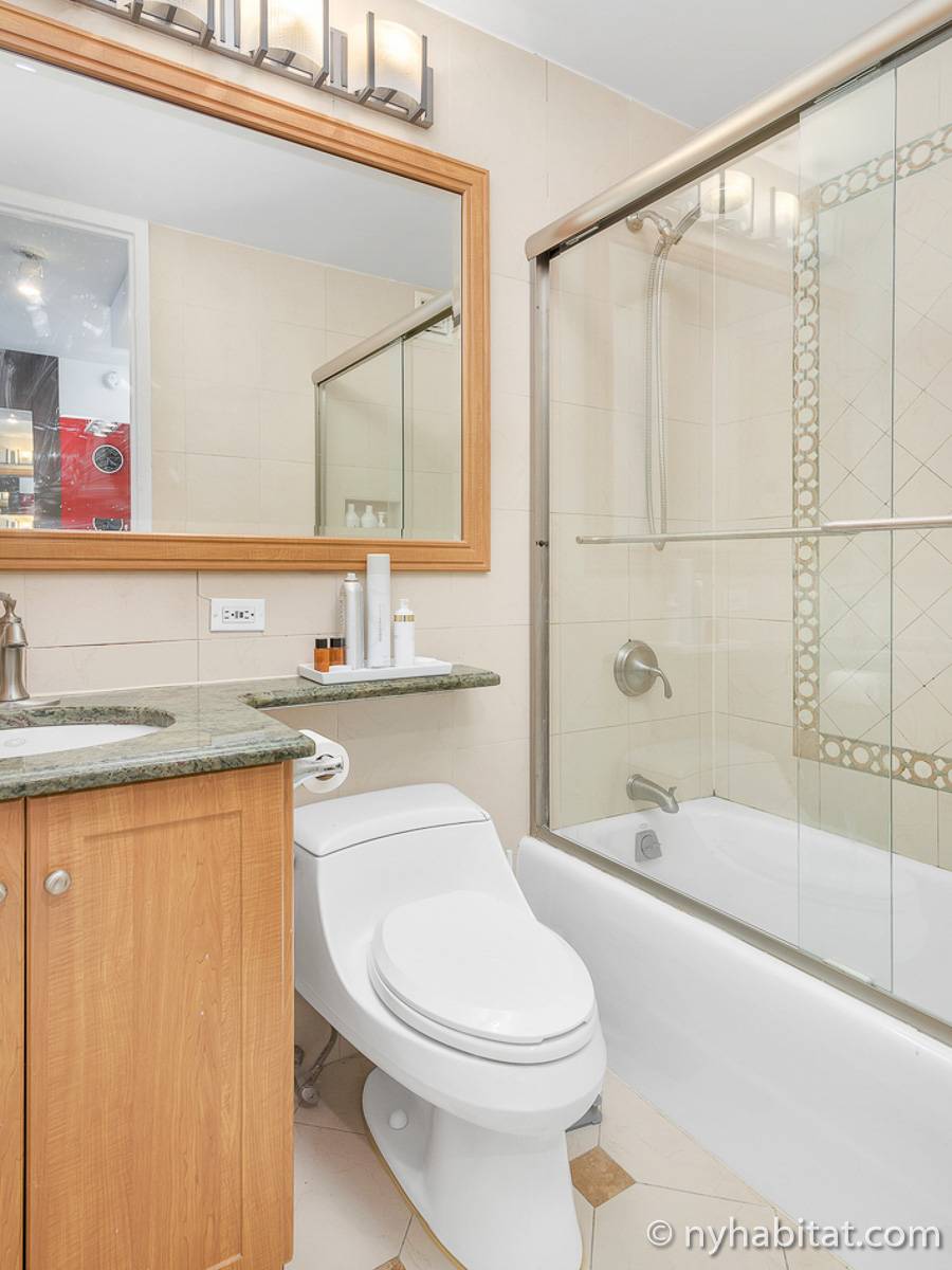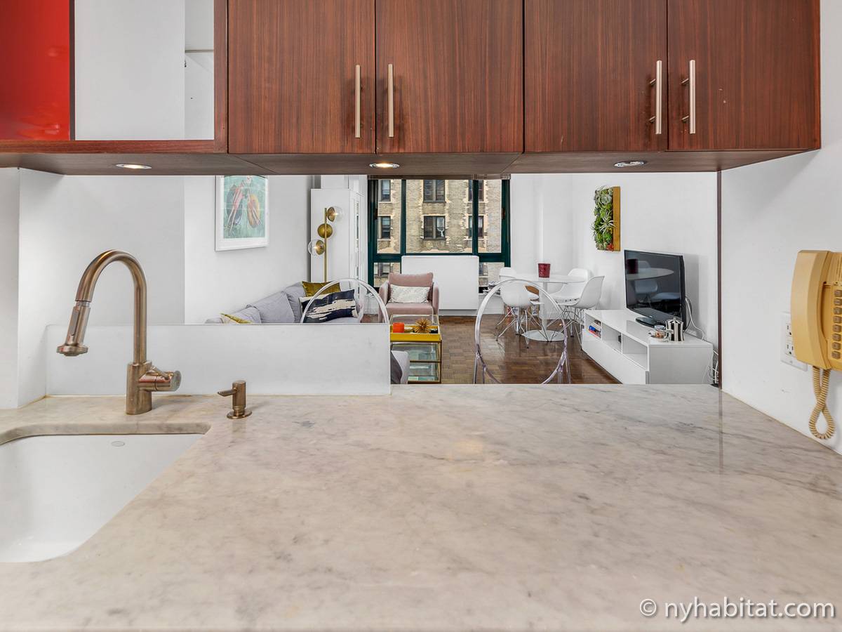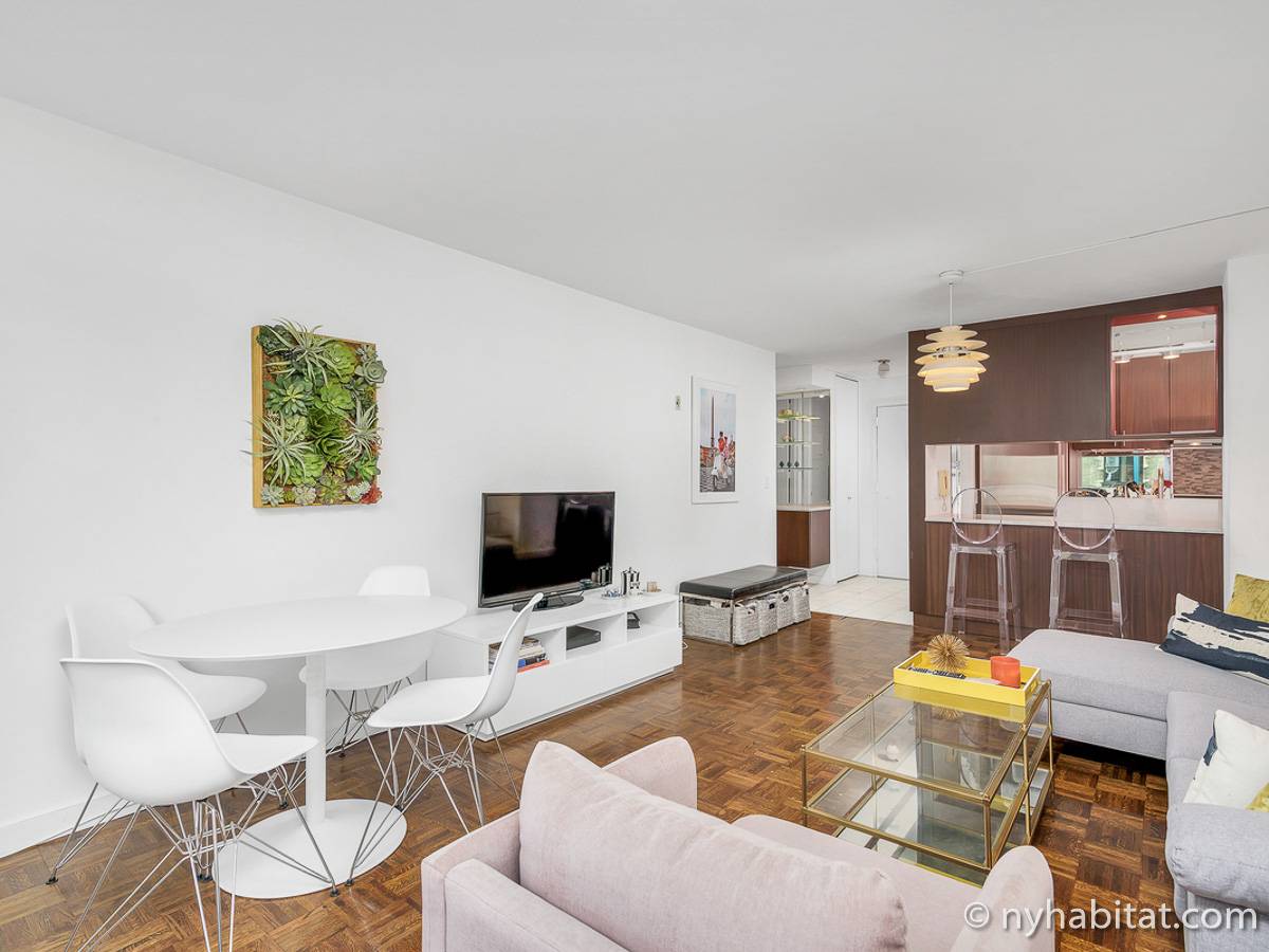 Diese 2-Zimmer-Wohnung in einem privaten Hochhaus in Manhattan liegt im 7. Stock (entspricht in Europa dem 6. Stock) und ist für Besucher geeignet, die zur Untermiete wohnen möchten. Beim Betreten des Wohnzimmers werden Ihnen Hartholzböden und ein großes Fenster (fast bis zur Decke) auffallen, durch das Tageslicht in den Raum fällt. Ein Sofa und ein Sessel bieten reichlich Platz für die Gäste. Im Wohnzimmer befindet sich zudem ein Breitbildfernseher, genügend Stauraum und ein Essbereich, der bequem Platz für 4 Personen bietet. Obwohl die Küche vom Wohnzimmer abgetrennt ist, ermöglicht eine kleine Durchreiche mit Barstühlen den Gästen in beiden Räumen, miteinander zu kommunizieren. Zusätzlich bietet die Küche viel Stauraum. Das Schlafzimmer hat ein weiteres großes Fenster, durch das Tageslicht in den Raum fällt. Ein Queensize-Bett und ein Schreibtisch vervollständigen den Raum. Im eigenen Bad gibt es geflieste Böden und Duschwände und eine Kombination aus Badewanne und Dusche. Zu den Besonderheiten des Gebäudes gehören ein Aufzug, ein Waschservice vor Ort, ein Fitnessstudio, ein Schwimmbad, ein Whirlpool, Yogakurse für Gäste und Mieter, eine gemeinsame Dachterrasse, ein Spielzimmer für Kinder und ein Parkplatz.