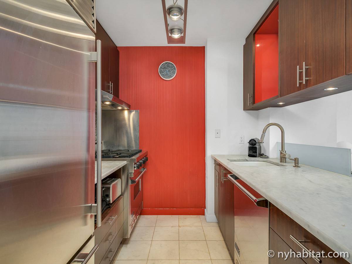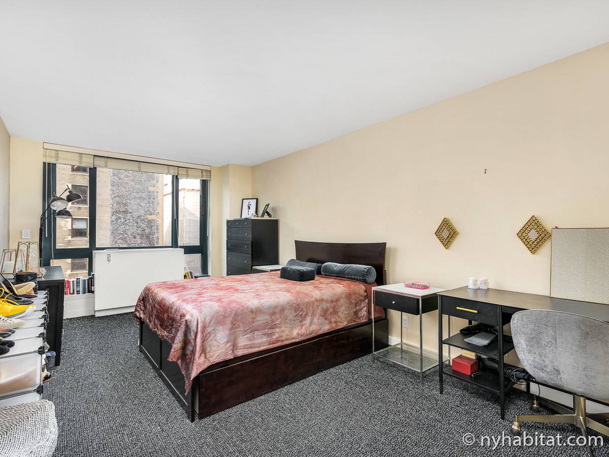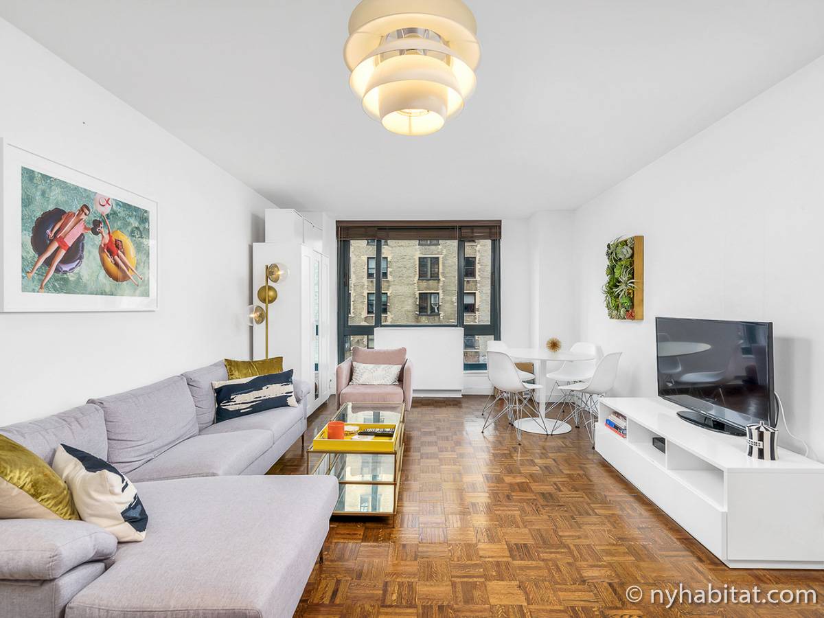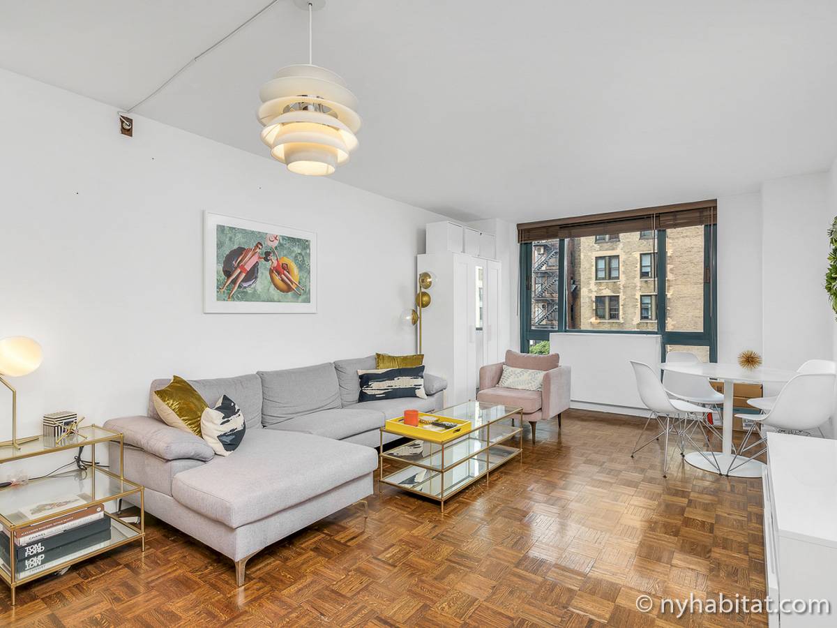 Diese 2-Zimmer-Wohnung in einem privaten Hochhaus in Manhattan liegt im 7. Stock (entspricht in Europa dem 6. Stock) und ist für Besucher geeignet, die zur Untermiete wohnen möchten. Beim Betreten des Wohnzimmers werden Ihnen Hartholzböden und ein großes Fenster (fast bis zur Decke) auffallen, durch das Tageslicht in den Raum fällt. Ein Sofa und ein Sessel bieten reichlich Platz für die Gäste. Im Wohnzimmer befindet sich zudem ein Breitbildfernseher, genügend Stauraum und ein Essbereich, der bequem Platz für 4 Personen bietet. Obwohl die Küche vom Wohnzimmer abgetrennt ist, ermöglicht eine kleine Durchreiche mit Barstühlen den Gästen in beiden Räumen, miteinander zu kommunizieren. Zusätzlich bietet die Küche viel Stauraum. Das Schlafzimmer hat ein weiteres großes Fenster, durch das Tageslicht in den Raum fällt. Ein Queensize-Bett und ein Schreibtisch vervollständigen den Raum. Im eigenen Bad gibt es geflieste Böden und Duschwände und eine Kombination aus Badewanne und Dusche. Zu den Besonderheiten des Gebäudes gehören ein Aufzug, ein Waschservice vor Ort, ein Fitnessstudio, ein Schwimmbad, ein Whirlpool, Yogakurse für Gäste und Mieter, eine gemeinsame Dachterrasse, ein Spielzimmer für Kinder und ein Parkplatz.