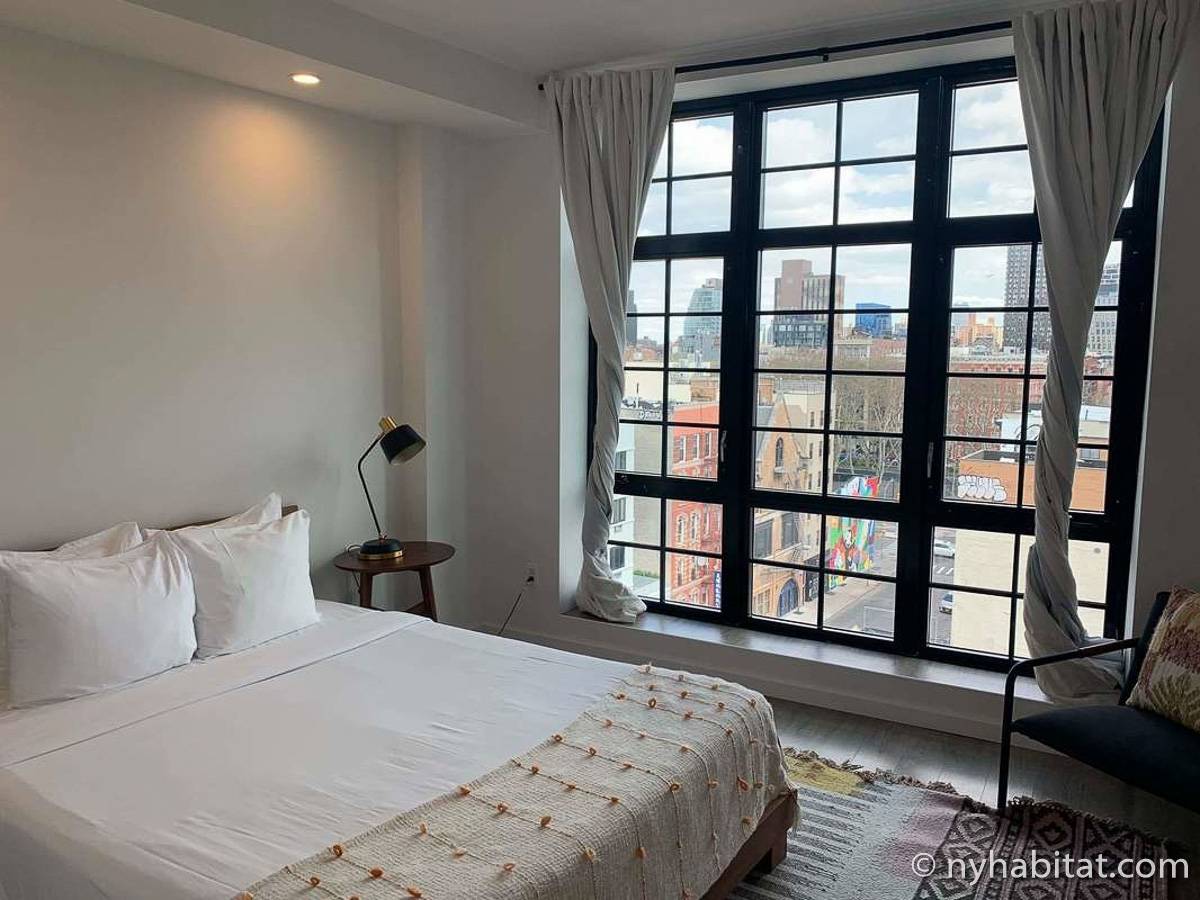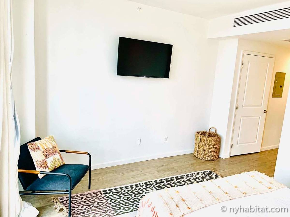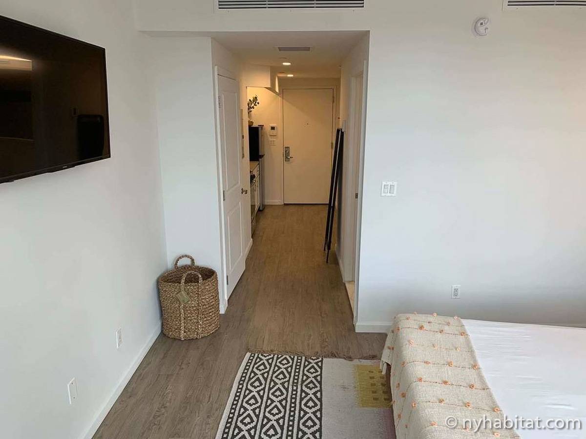 Die Studiowohnung liegt in einem Gebäude mit Aufzug, der Sie bis zu Ihrer Mietwohnung bringt, in der Sie als Erstes die Küche betreten. In der Küche finden Sie weiße Küchenschränke in modernem Design. Sie ist mit einem Kühlschrank, einer Mikrowelle, einer Kaffeemaschine und einem Herd mit Backofen ausgestattet. Hinter der Küche betreten Sie nun das Wohn- und Schlafzimmer. Als Erstes wird Ihnen das riesige Fabrikfenster auffallen, durch das Tageslicht in den Raum fällt. Hier steht ein Doppelbett mit einer passenden Tagesdecke und einem Teppich darunter. Es gibt auch zwei Nachttische mit modernen schwarz/goldenen Nachttischlampen. Der Wohnbereich besitzt einen blauen Lesesessel und einen an der Wand montierten Fernseher gegenüber dem Bett. In allen Räumen gibt es helle Holzböden und Deckenleuchten. Das Badezimmer ist mit einer Badewanne, einem WC und Handtüchern ausgestattet.