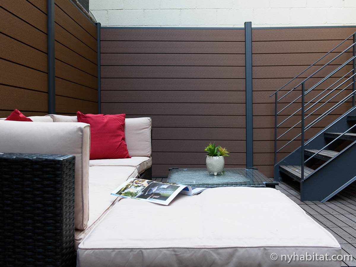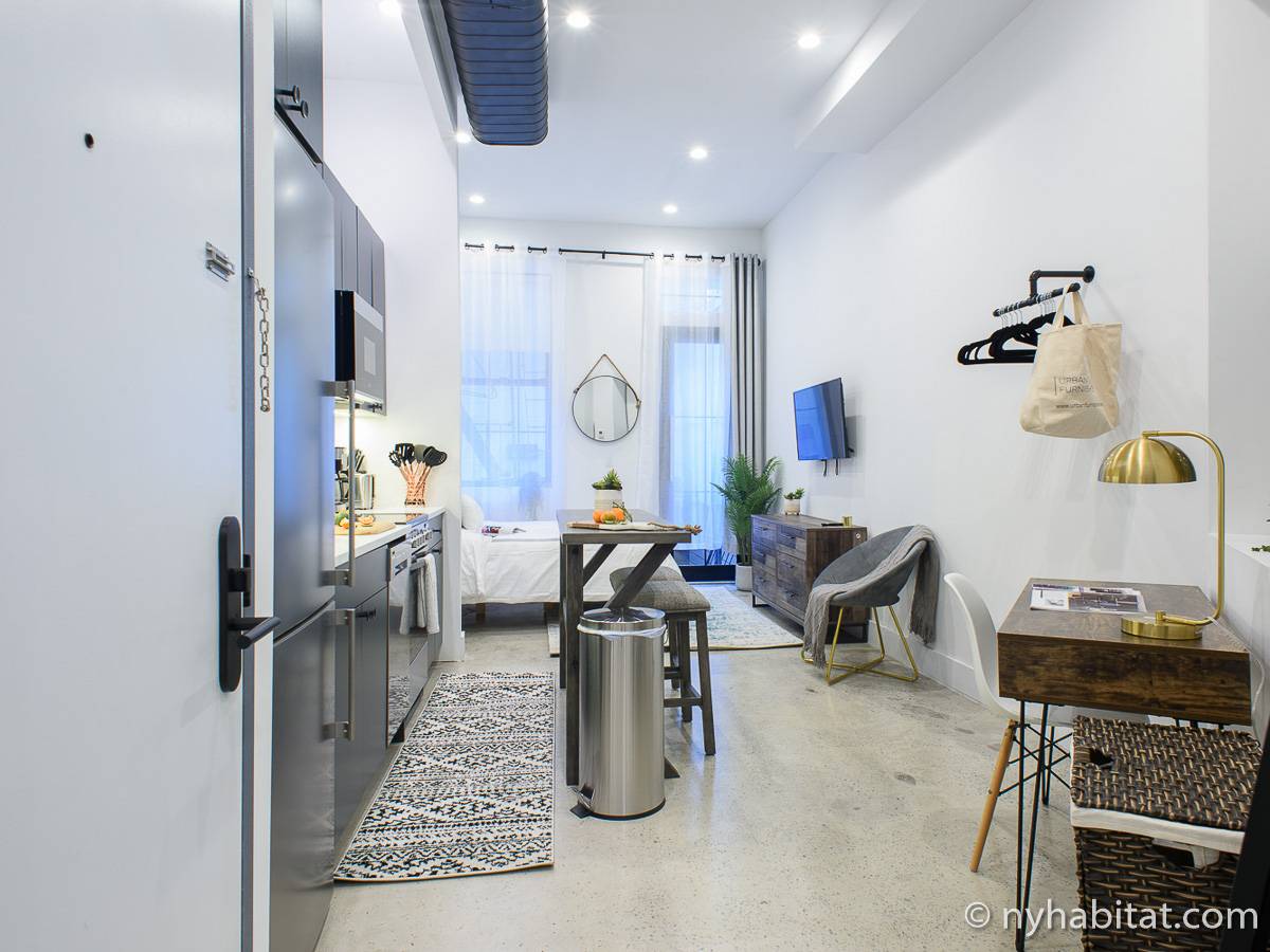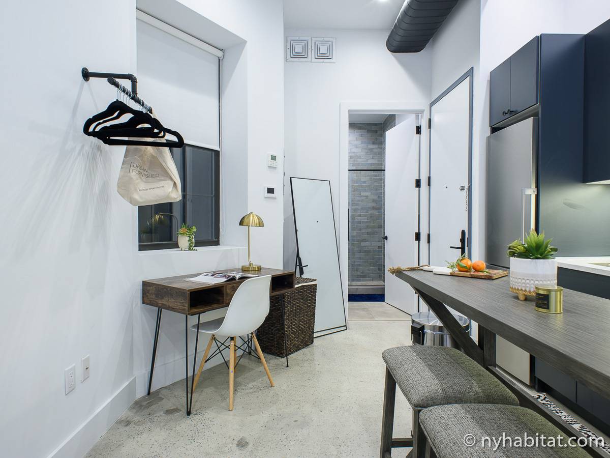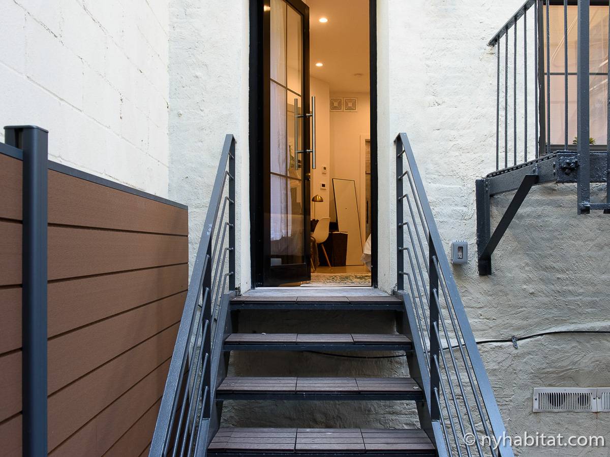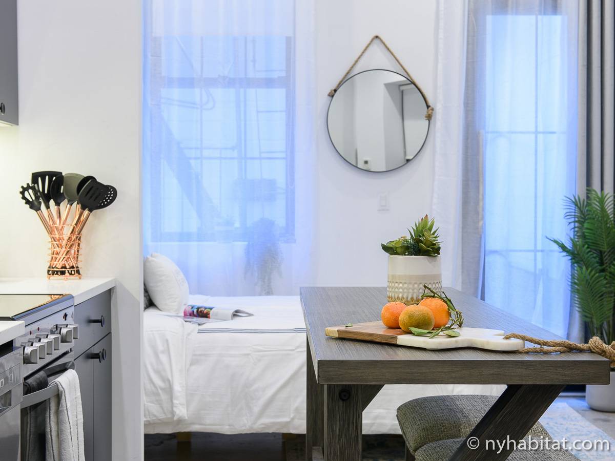 Erleben Sie das Leben in Downtown Manhattan in dieser Studiowohnung mit einer Fläche von rund 39 m2. Diese möblierte Mietwohnung befindet sich in einem Gebäude ohne Aufzug in der Nähe der Kreuzung East 3rd Street und 1st Avenue im East Village von New York City und verfügt über hohe Decken, Einbauleuchten und eine Terrasse.