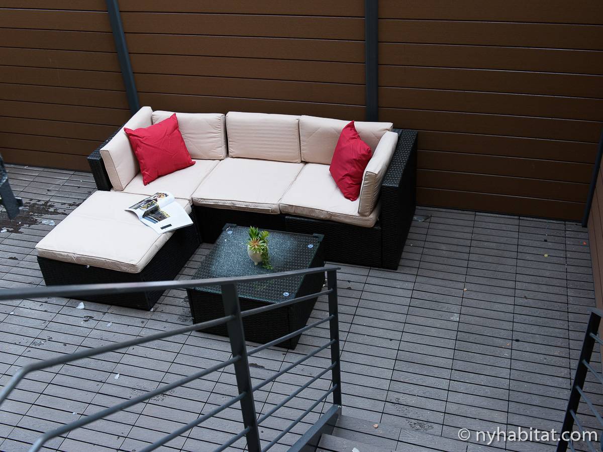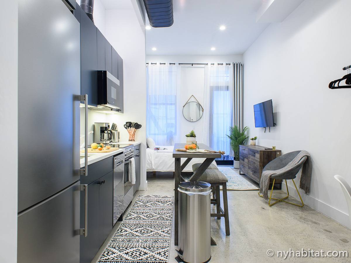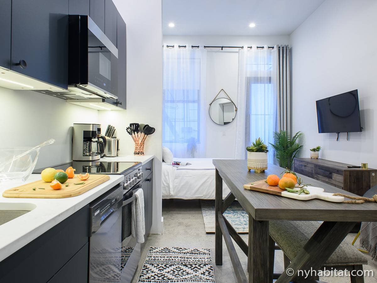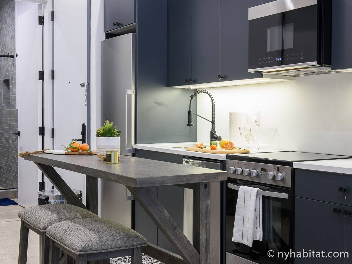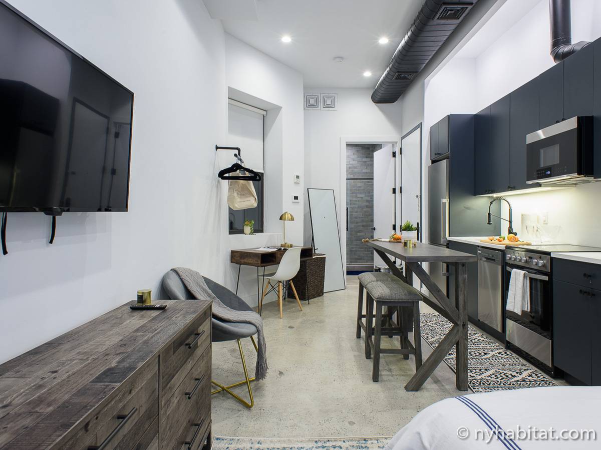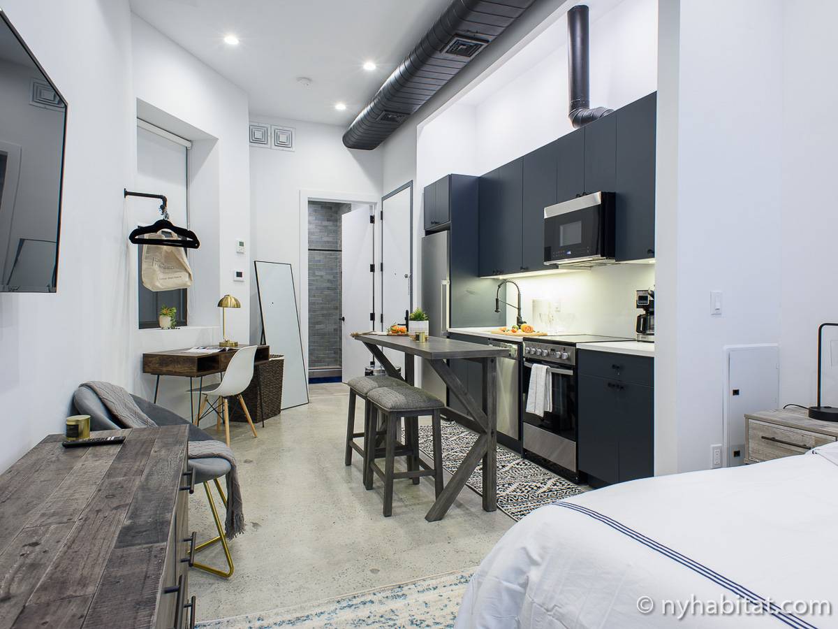 Erleben Sie das Leben in Downtown Manhattan in dieser Studiowohnung mit einer Fläche von rund 39 m2. Diese möblierte Mietwohnung befindet sich in einem Gebäude ohne Aufzug in der Nähe der Kreuzung East 3rd Street und 1st Avenue im East Village von New York City und verfügt über hohe Decken, Einbauleuchten und eine Terrasse.