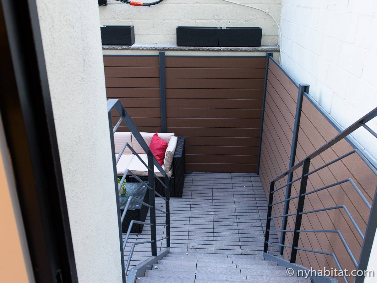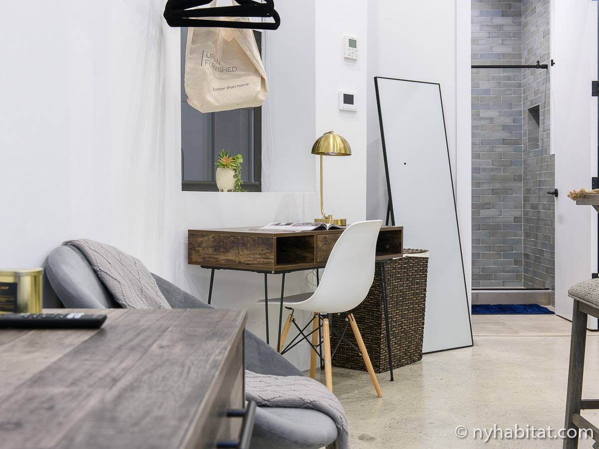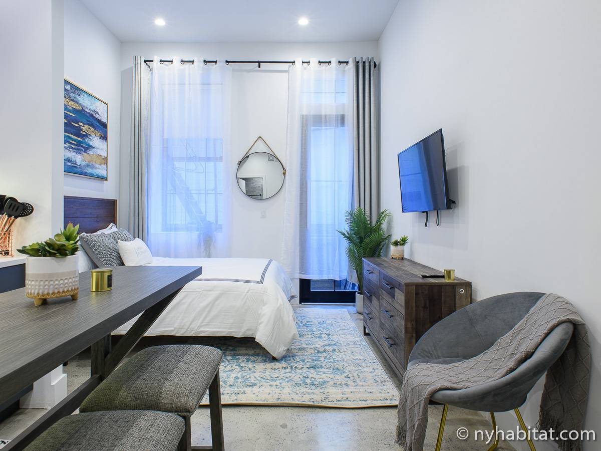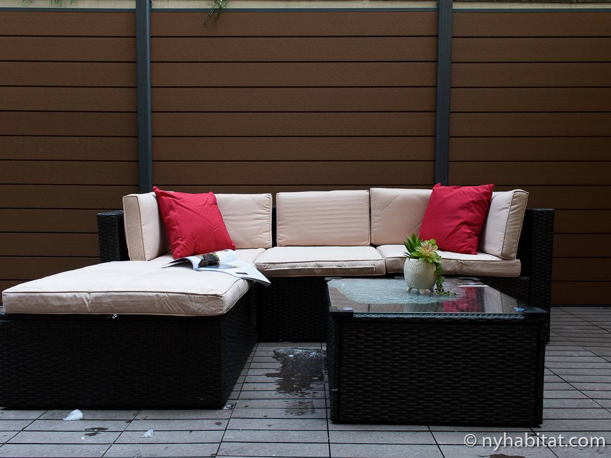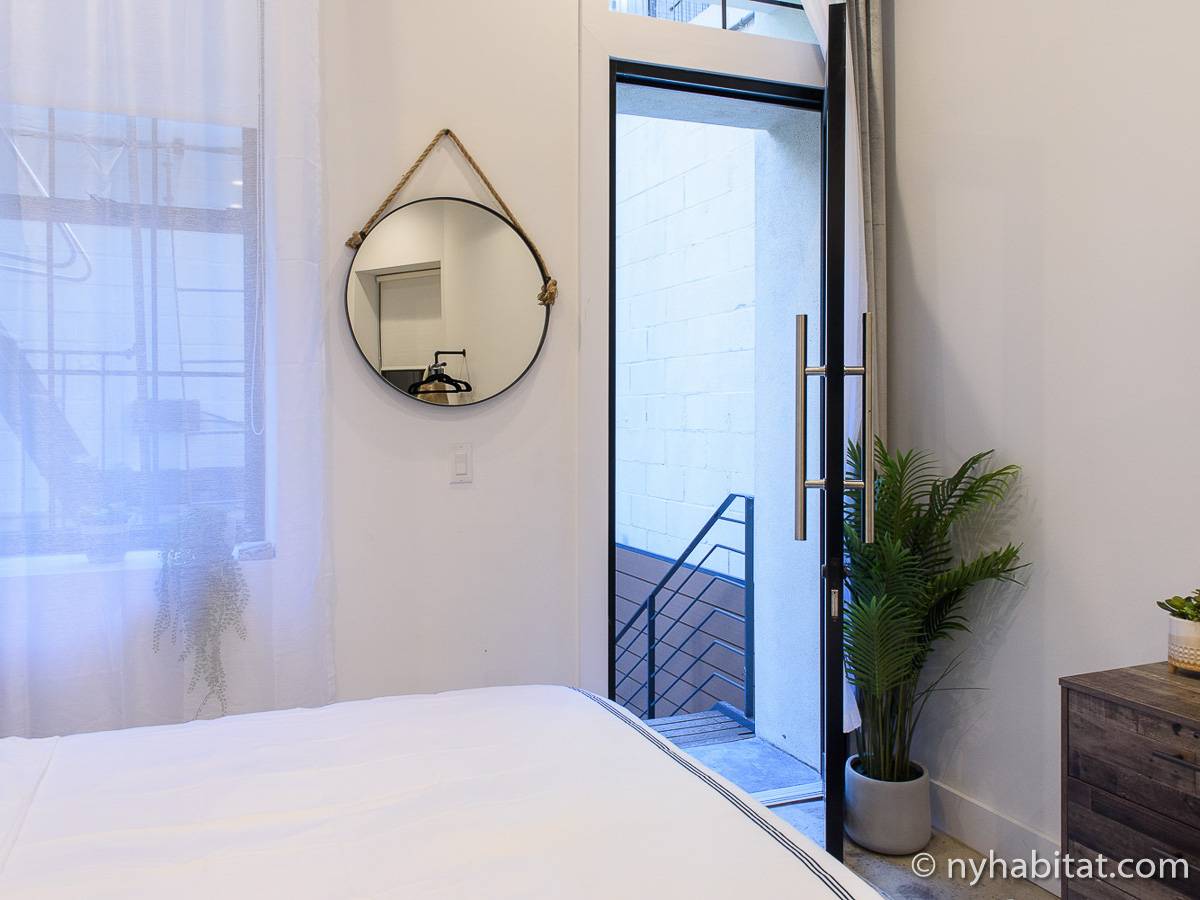 Erleben Sie das Leben in Downtown Manhattan in dieser Studiowohnung mit einer Fläche von rund 39 m2. Diese möblierte Mietwohnung befindet sich in einem Gebäude ohne Aufzug in der Nähe der Kreuzung East 3rd Street und 1st Avenue im East Village von New York City und verfügt über hohe Decken, Einbauleuchten und eine Terrasse.