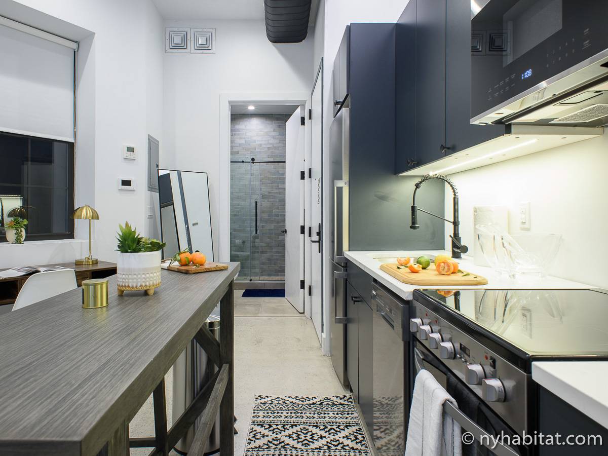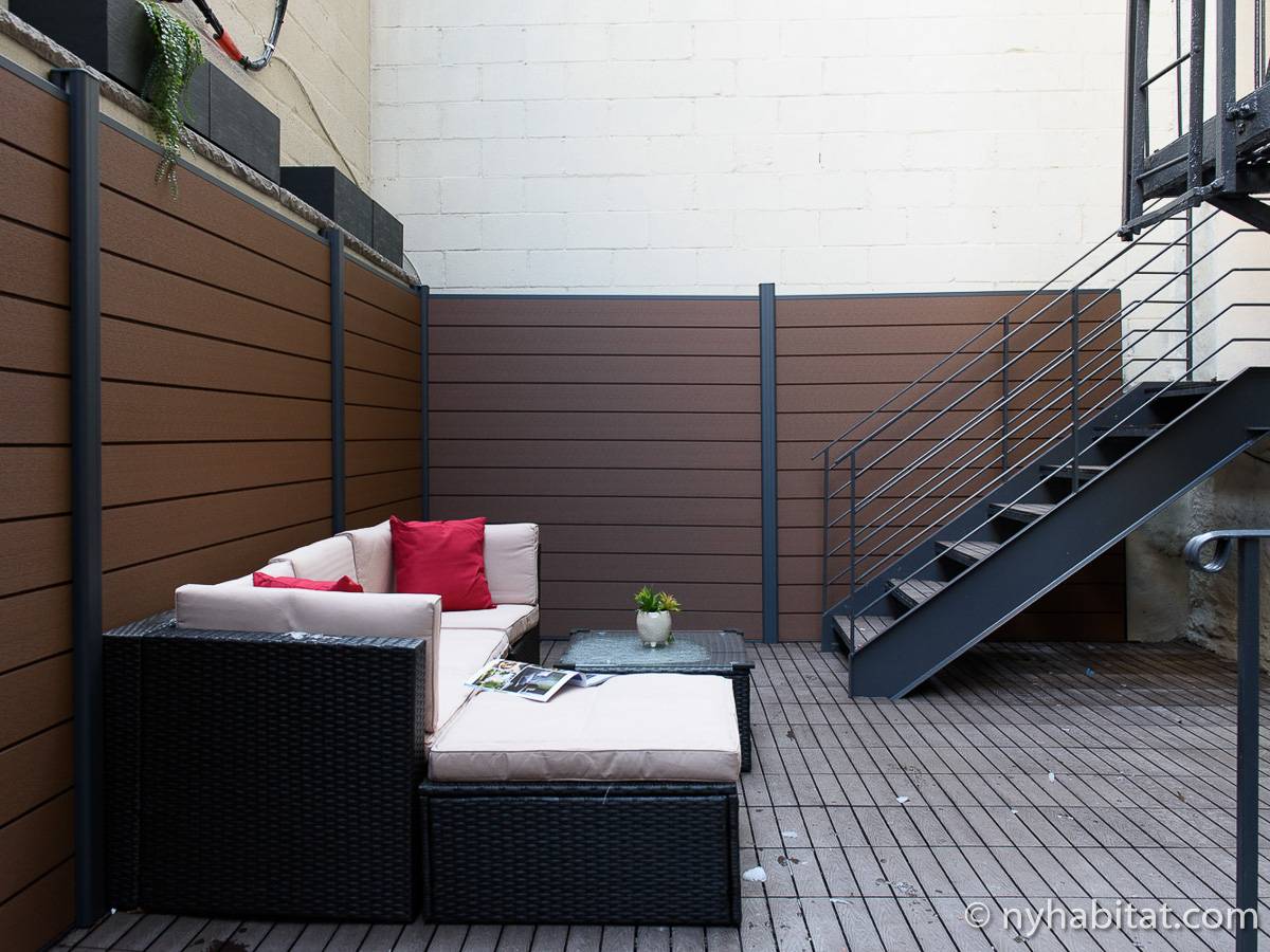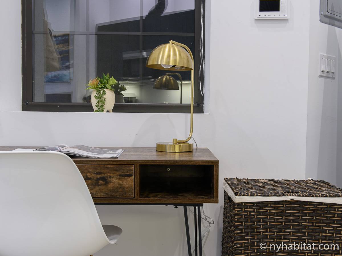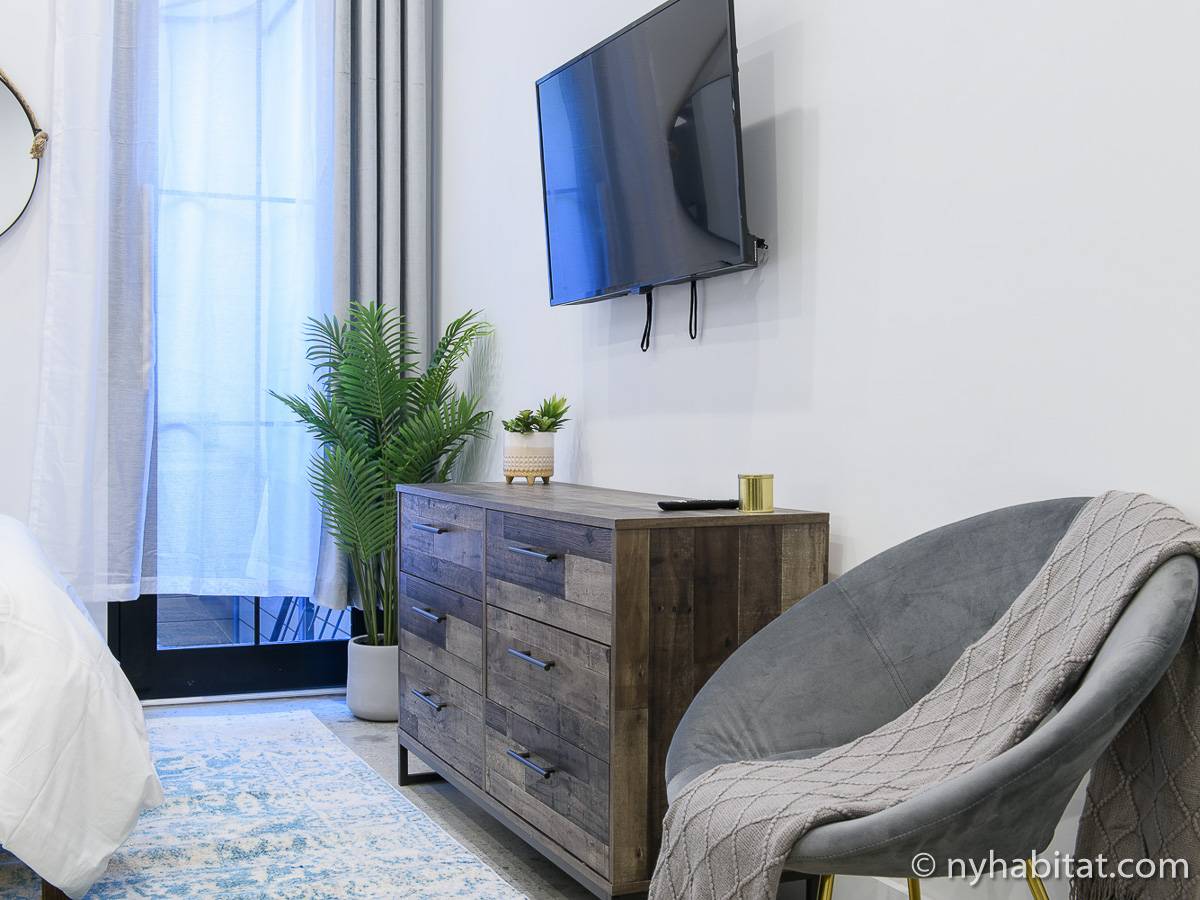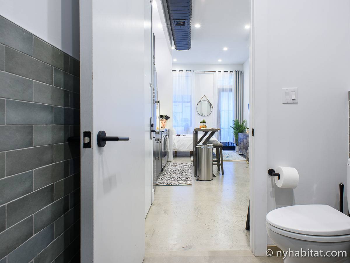 Erleben Sie das Leben in Downtown Manhattan in dieser Studiowohnung mit einer Fläche von rund 39 m2. Diese möblierte Mietwohnung befindet sich in einem Gebäude ohne Aufzug in der Nähe der Kreuzung East 3rd Street und 1st Avenue im East Village von New York City und verfügt über hohe Decken, Einbauleuchten und eine Terrasse.