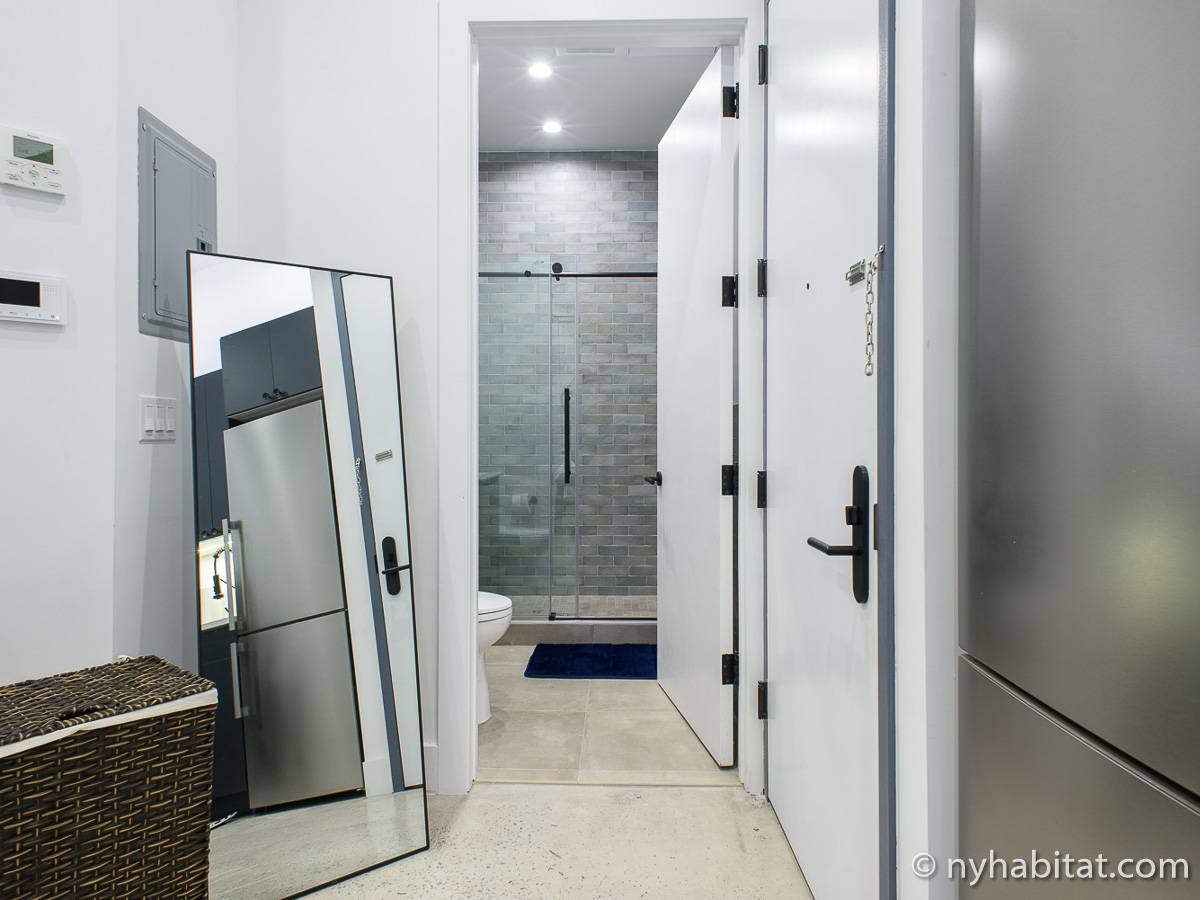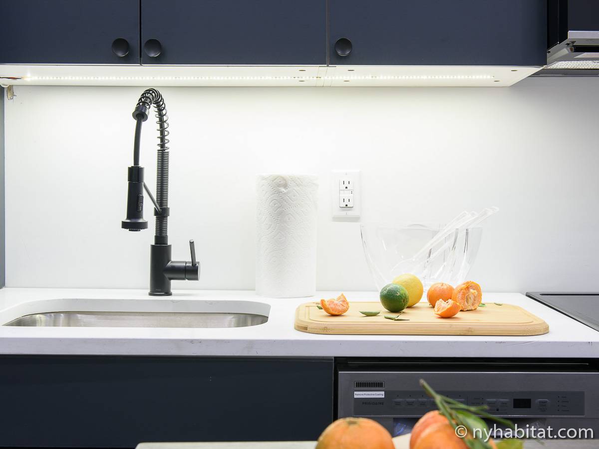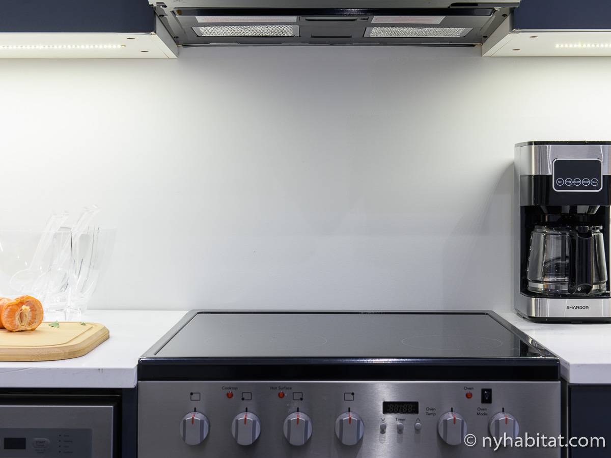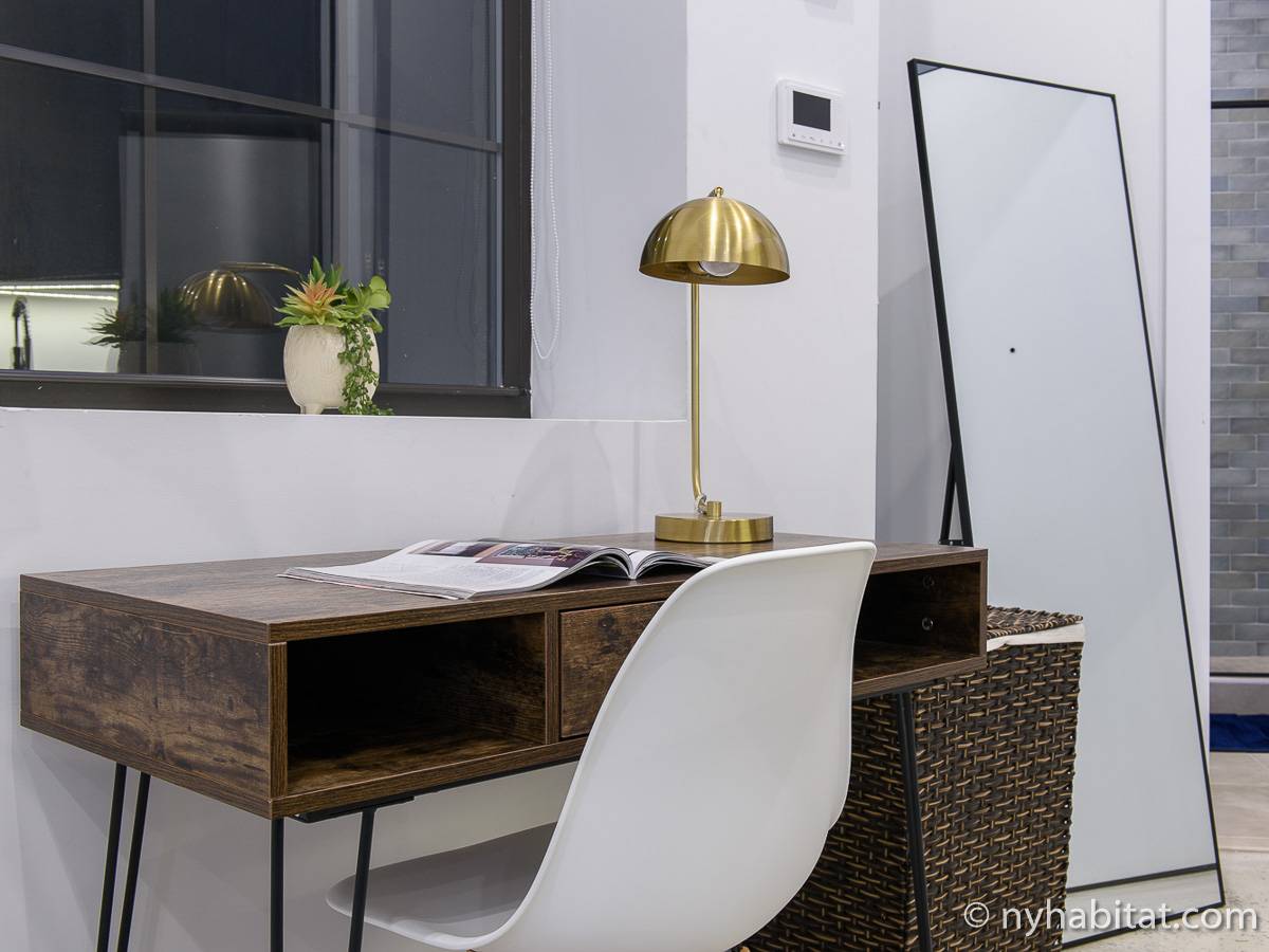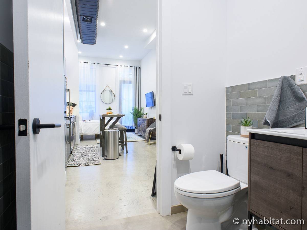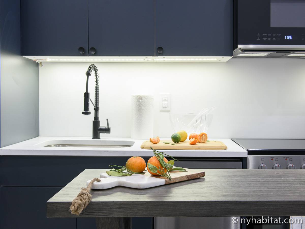 Erleben Sie das Leben in Downtown Manhattan in dieser Studiowohnung mit einer Fläche von rund 39 m2. Diese möblierte Mietwohnung befindet sich in einem Gebäude ohne Aufzug in der Nähe der Kreuzung East 3rd Street und 1st Avenue im East Village von New York City und verfügt über hohe Decken, Einbauleuchten und eine Terrasse.