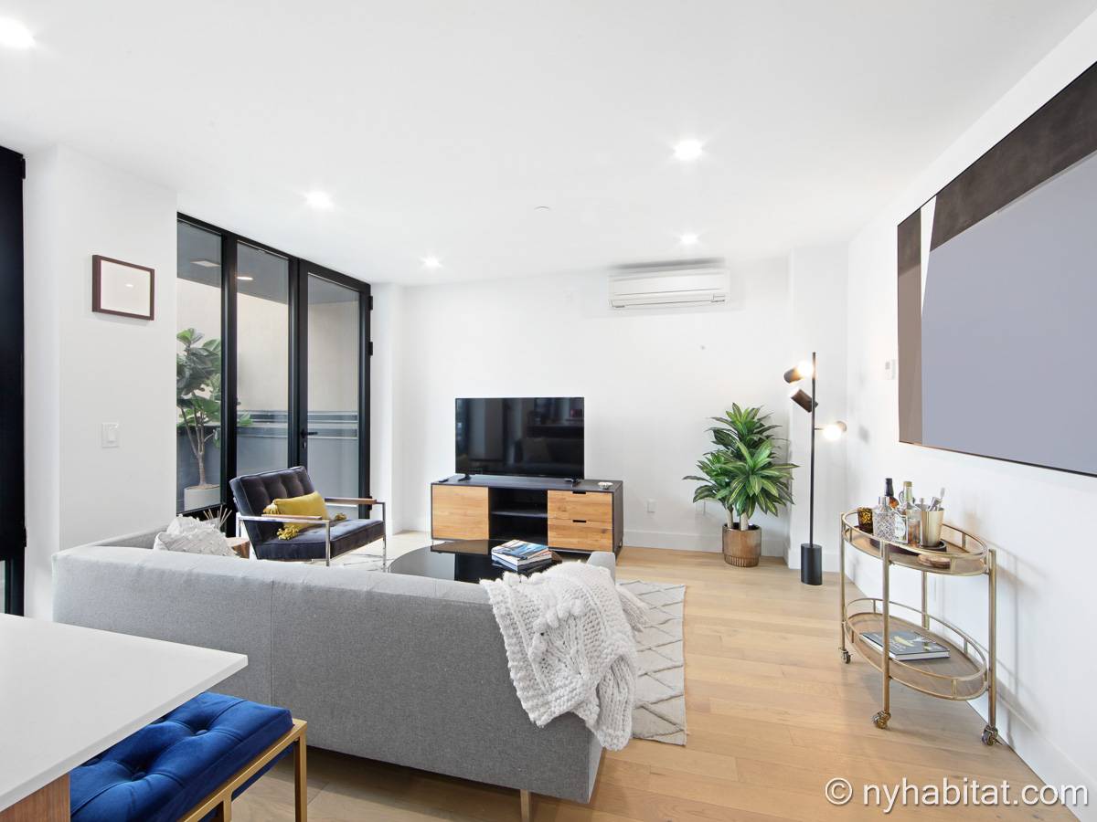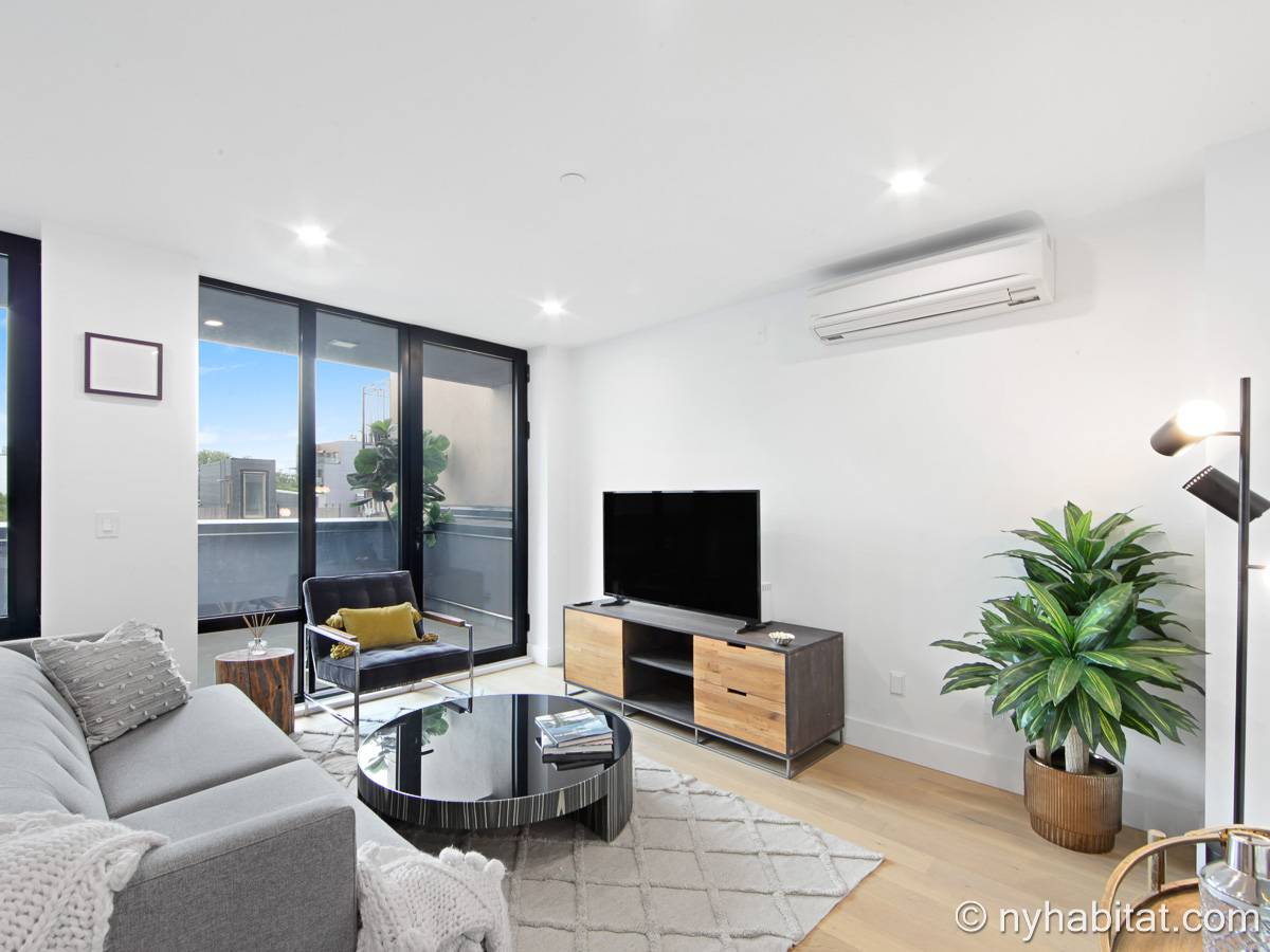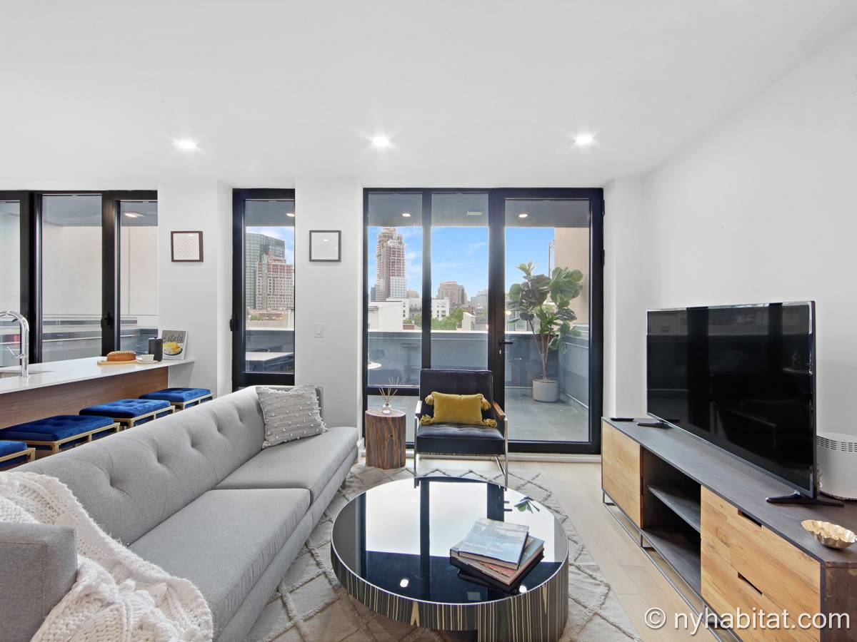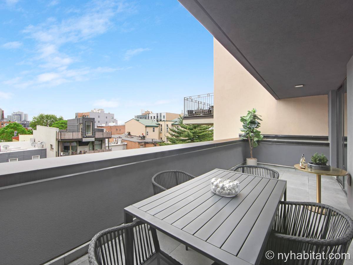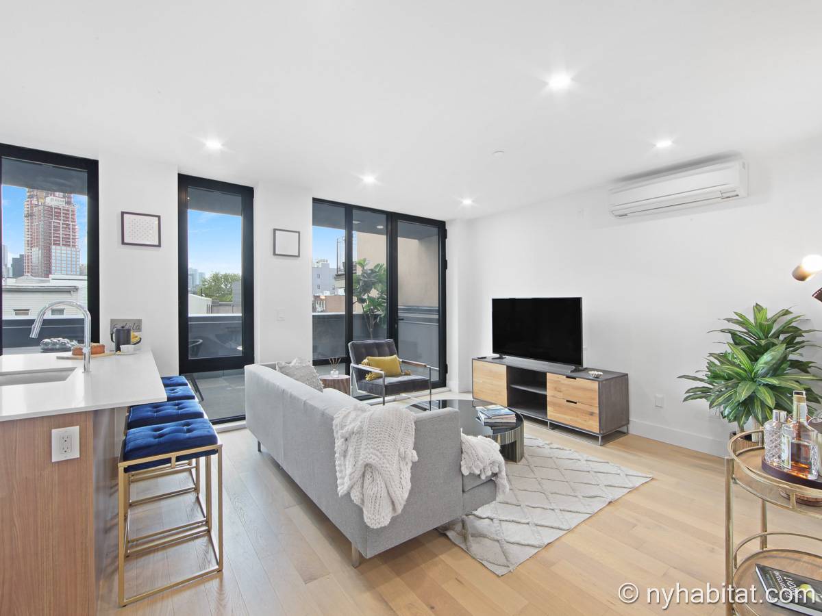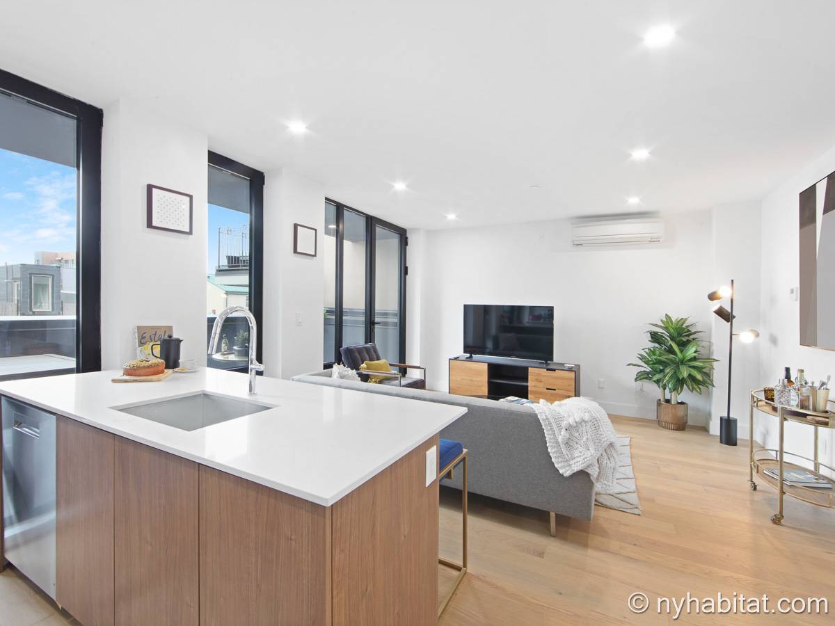 Diese lichtdurchflutete möblierte 3-Zimmer-Wohnung mit 1 Badezimmer in Brooklyn bietet vom Wohnzimmer und einer großen Terrasse aus einen erhöhten Blick über die Stadt. Diese New Yorker Mietwohnung befindet sich in einem Gebäude mit Aufzug an der Kreuzung Green Street und Manhattan Avenue im Viertel Greenpoint.