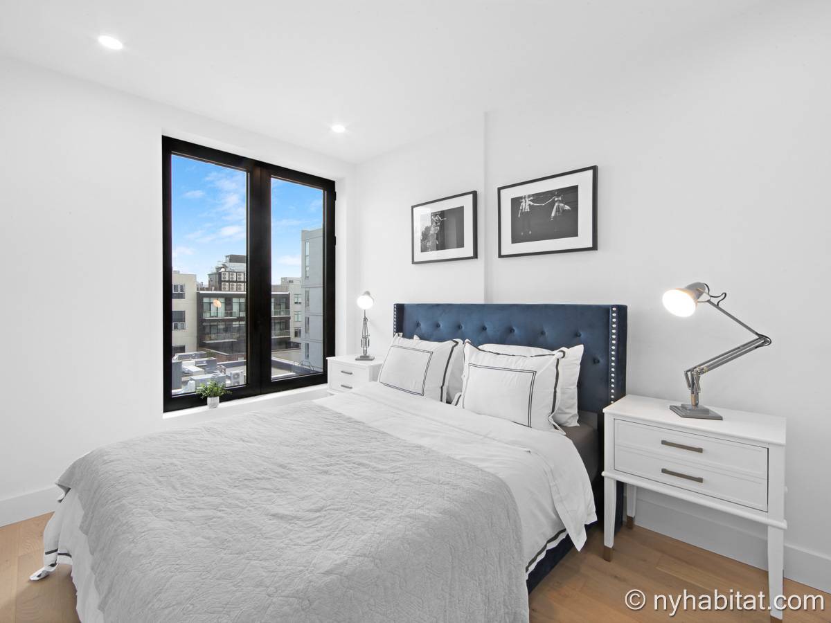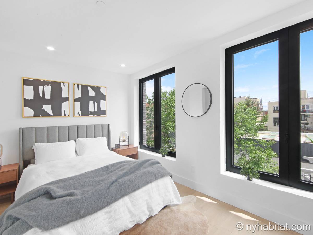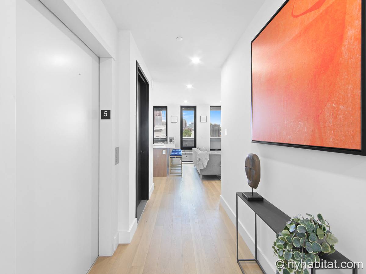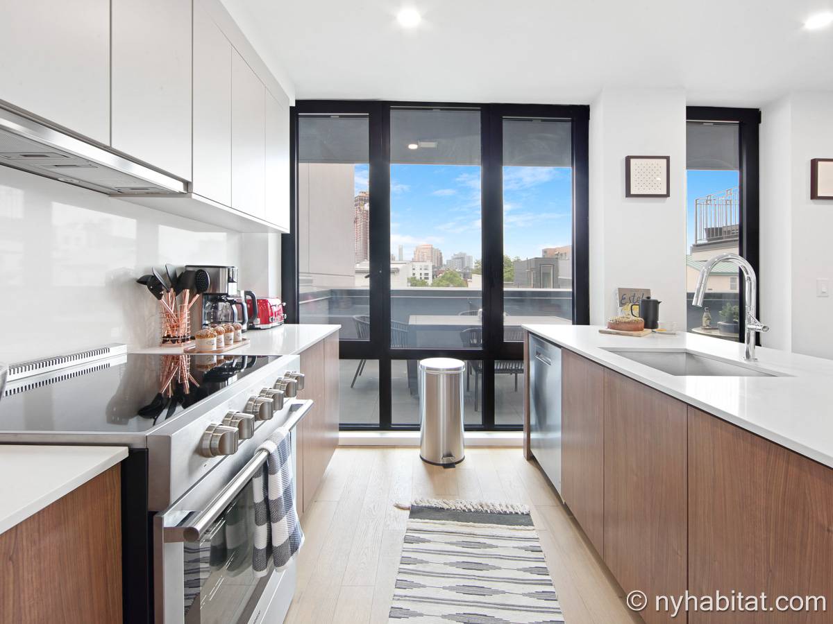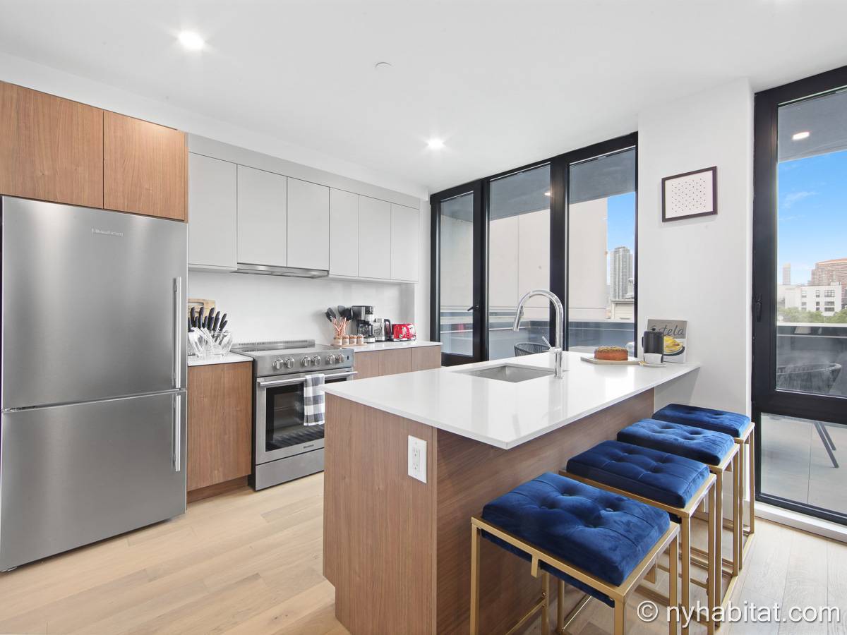 Diese lichtdurchflutete möblierte 3-Zimmer-Wohnung mit 1 Badezimmer in Brooklyn bietet vom Wohnzimmer und einer großen Terrasse aus einen erhöhten Blick über die Stadt. Diese New Yorker Mietwohnung befindet sich in einem Gebäude mit Aufzug an der Kreuzung Green Street und Manhattan Avenue im Viertel Greenpoint.