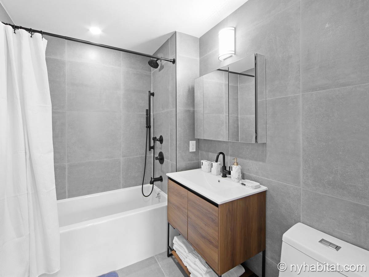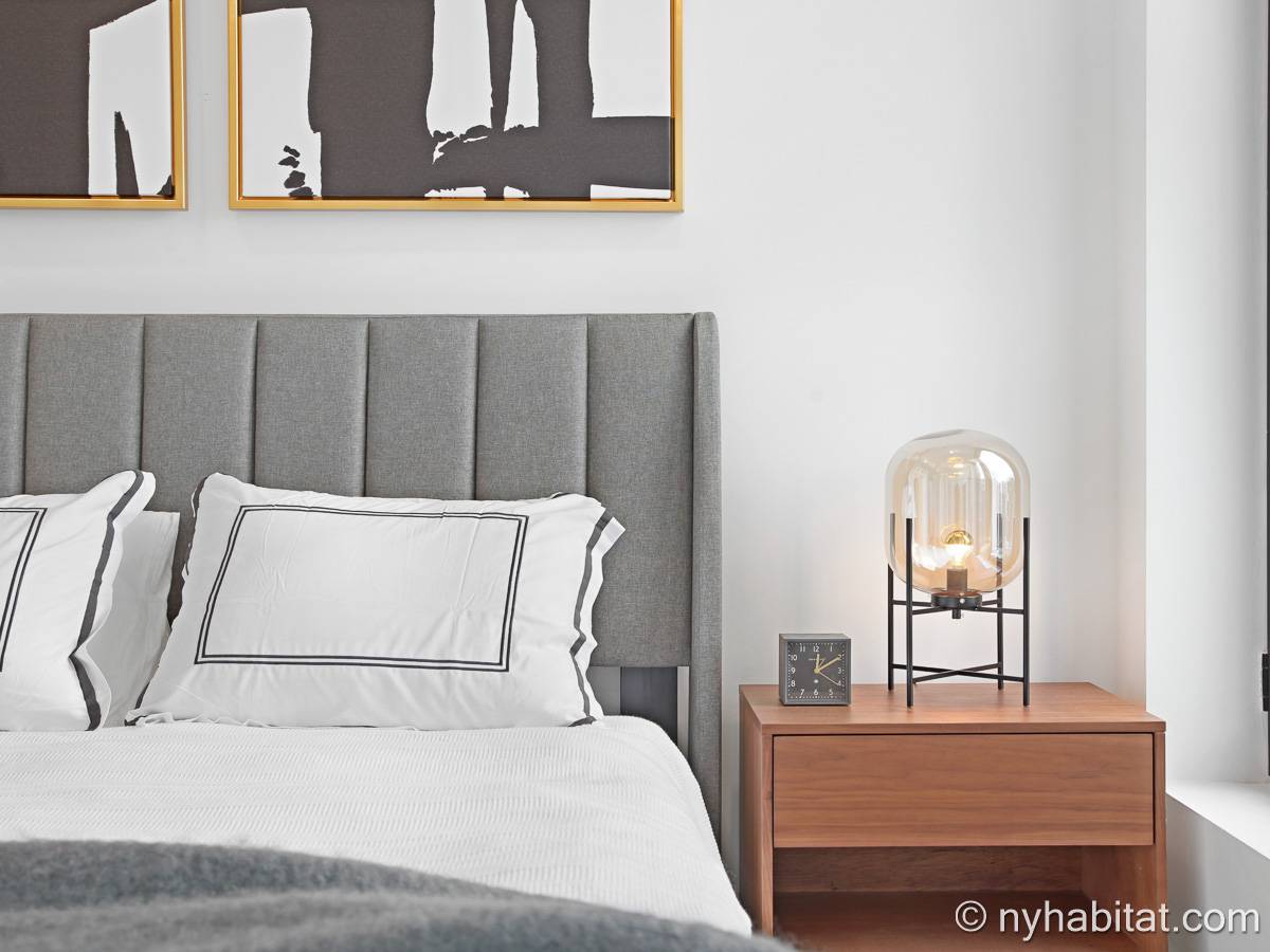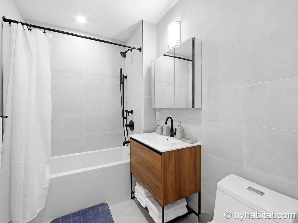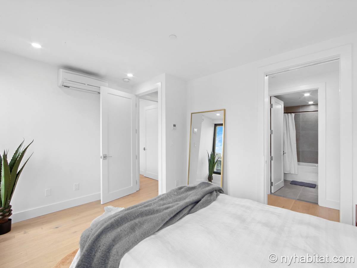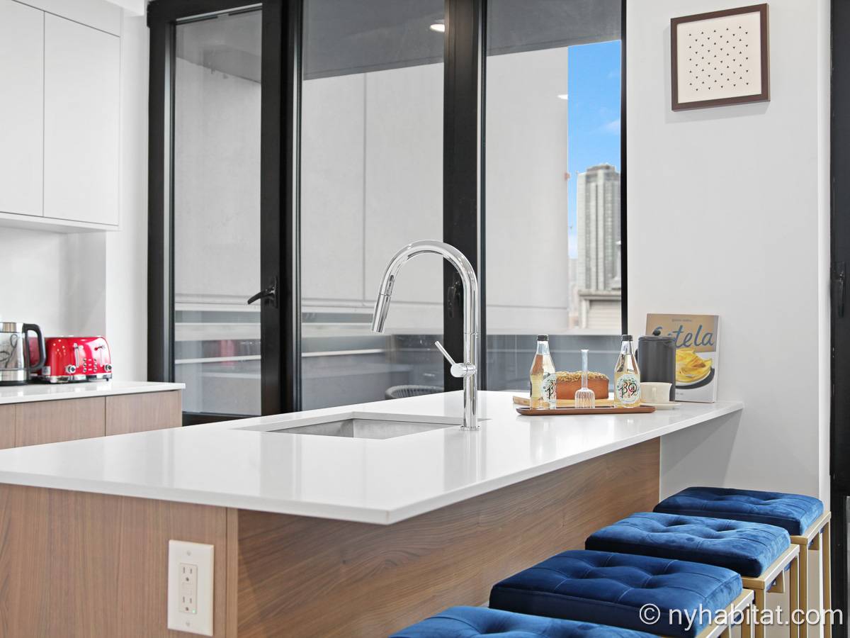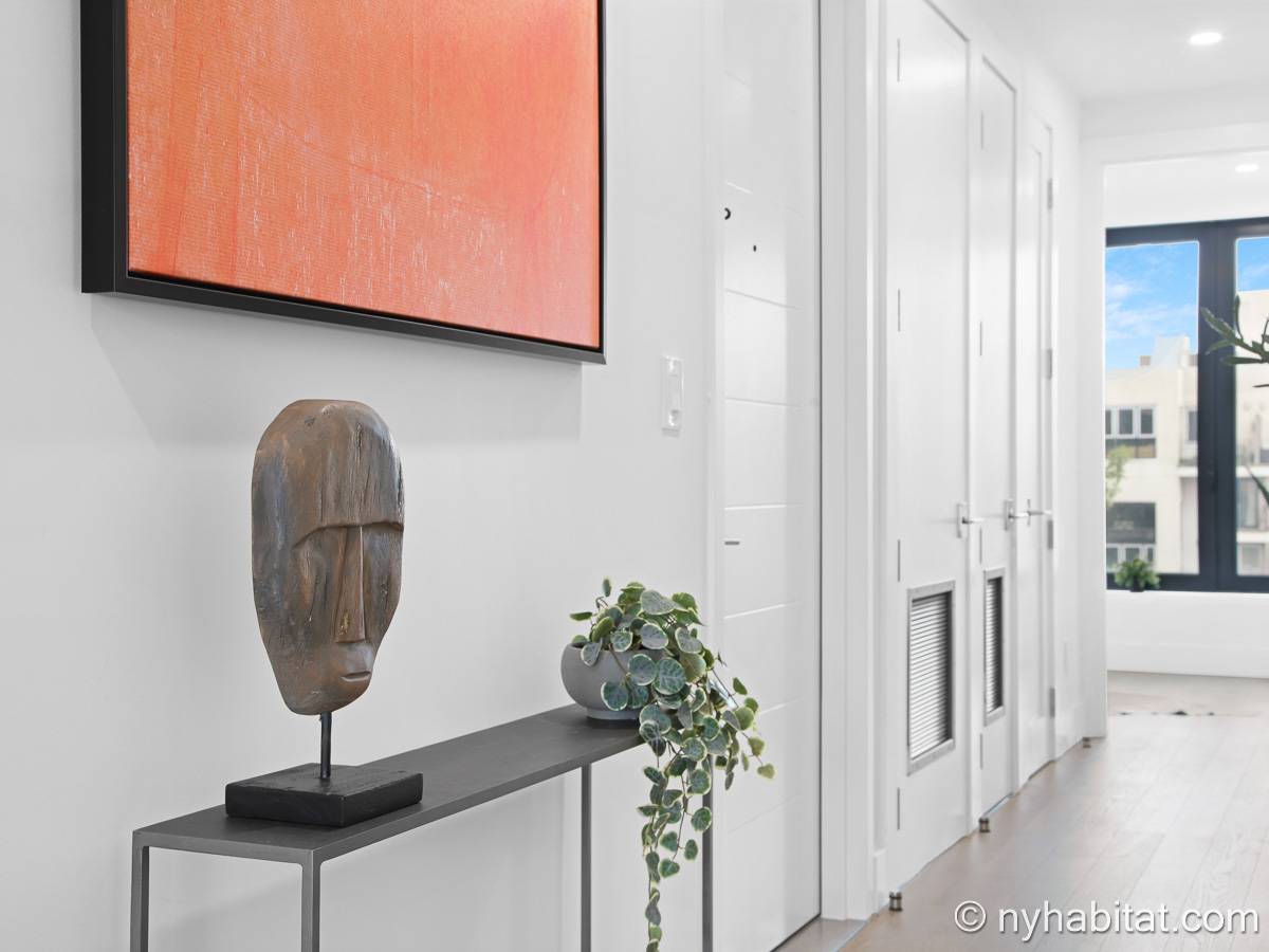 Diese lichtdurchflutete möblierte 3-Zimmer-Wohnung mit 1 Badezimmer in Brooklyn bietet vom Wohnzimmer und einer großen Terrasse aus einen erhöhten Blick über die Stadt. Diese New Yorker Mietwohnung befindet sich in einem Gebäude mit Aufzug an der Kreuzung Green Street und Manhattan Avenue im Viertel Greenpoint.