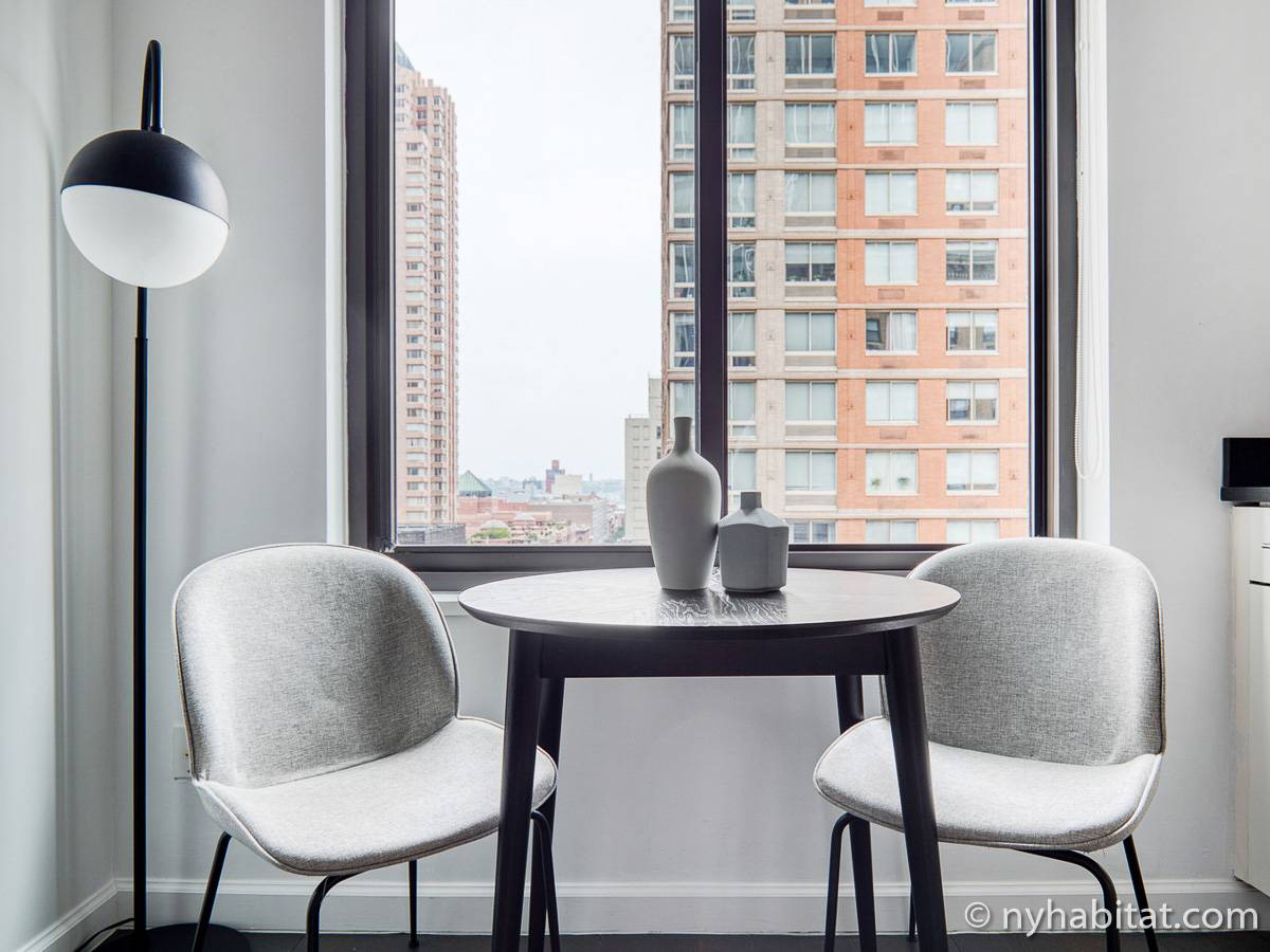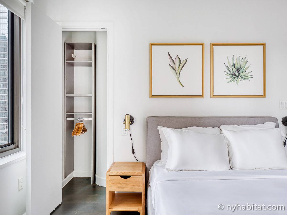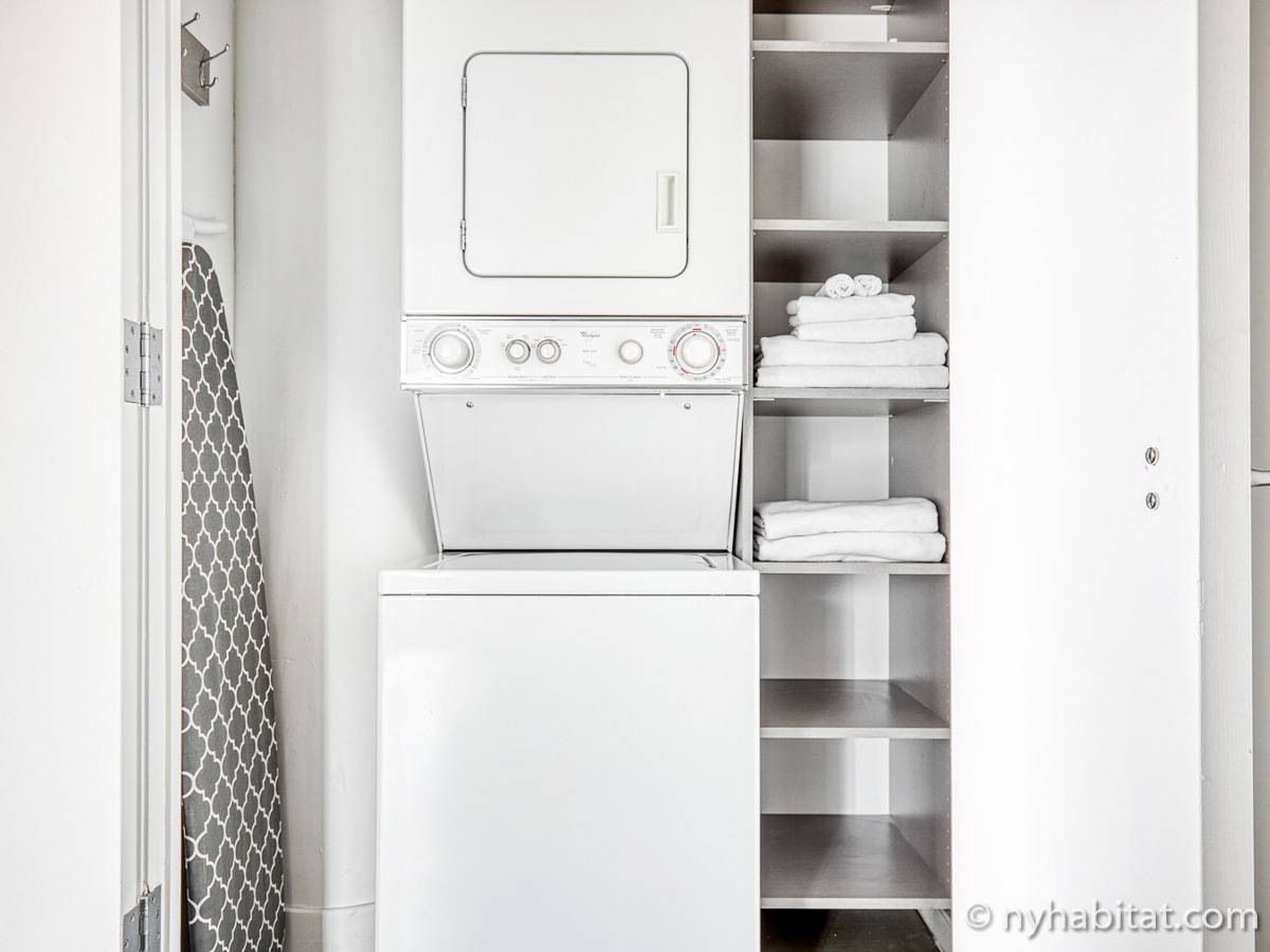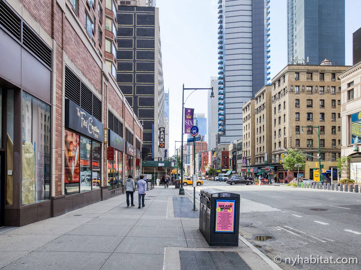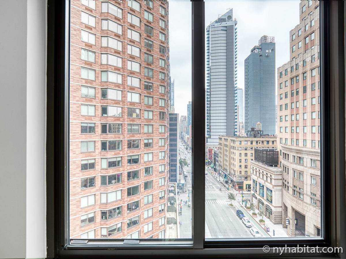 Diese möblierte Mietwohnung befindet sich in der Nähe der Kreuzung 8th Avenue und West 50th Street. Sie liegt im 9. Stock (entspricht dem 8. Stock in Europa) eines Gebäudes mit Aufzug und hat eine Wohnfläche von etwa 60 m². Das Gebäude verfügt über ein Fitnessstudio. Die Wohnung bietet eine Klimaanlage sowie eine Waschmaschine und einen Trockner.