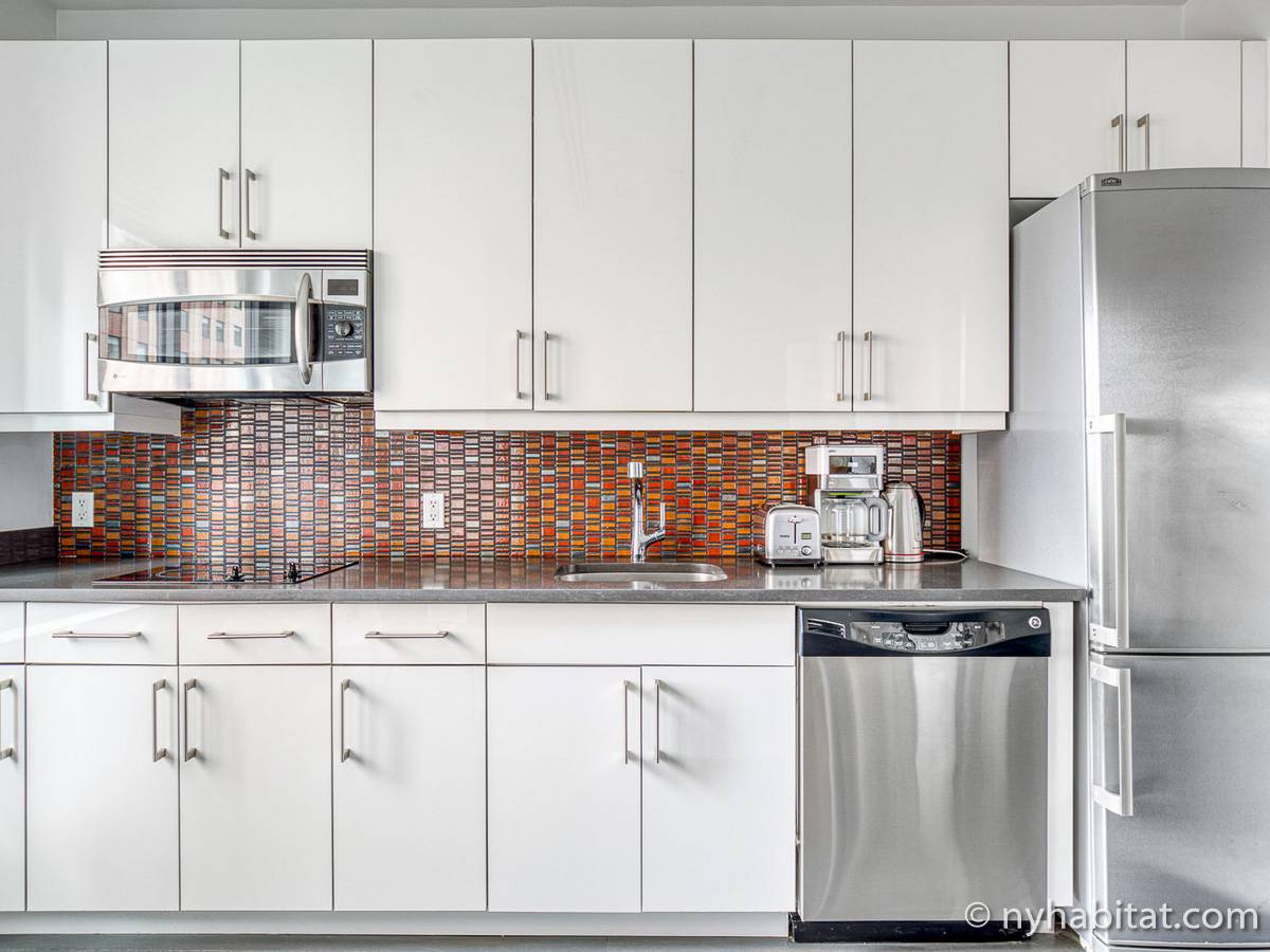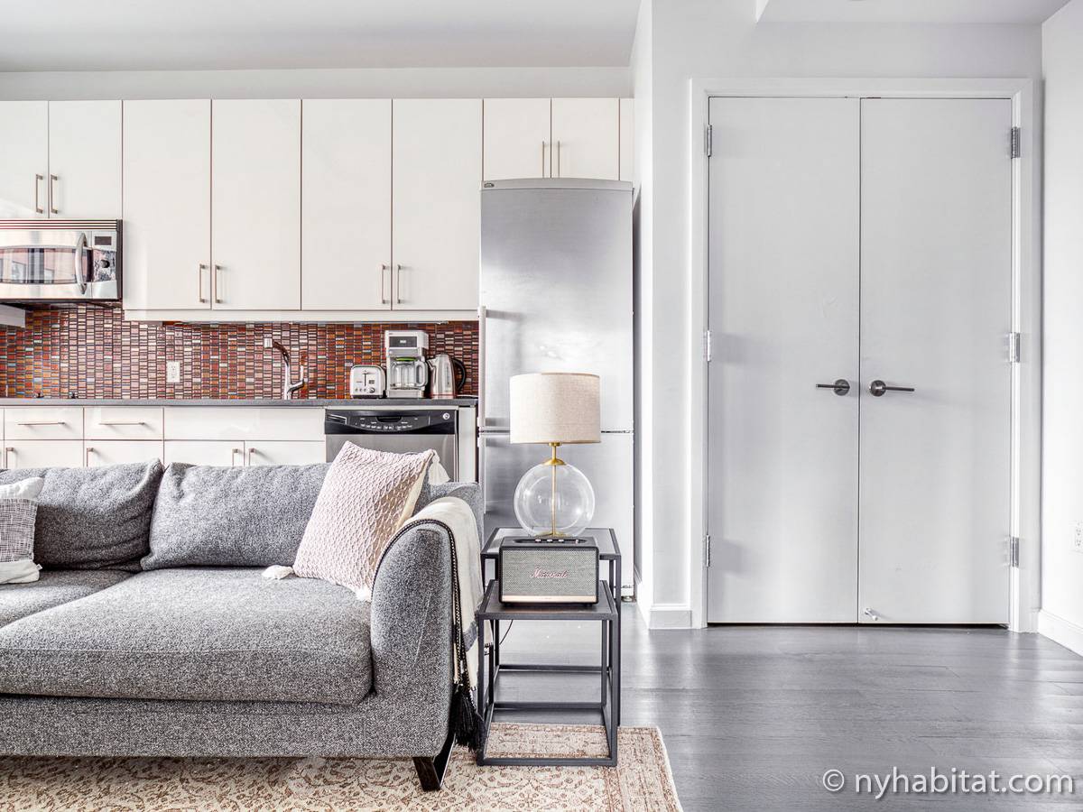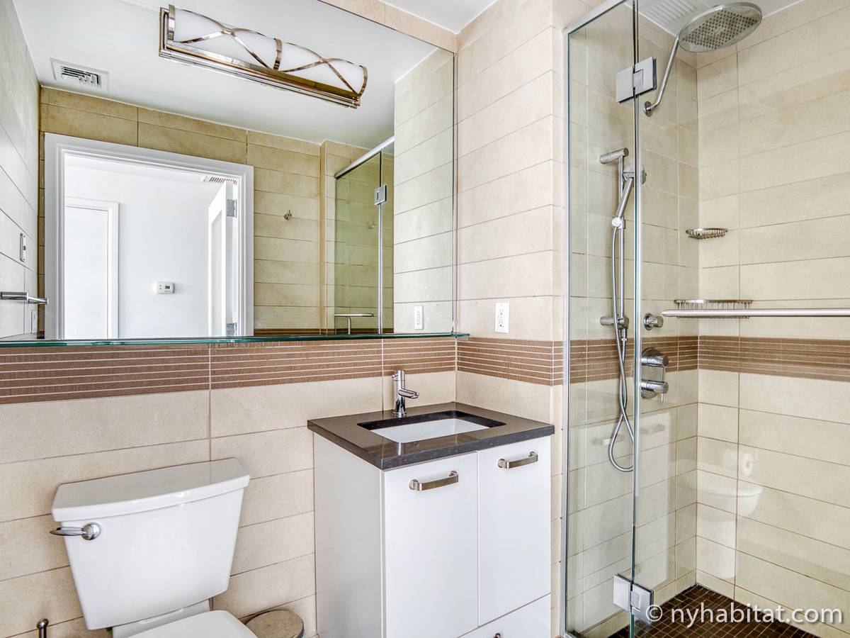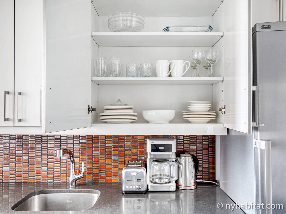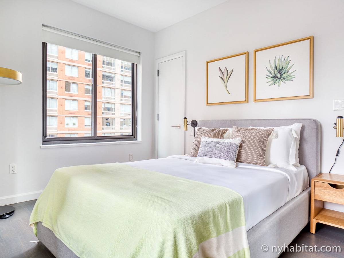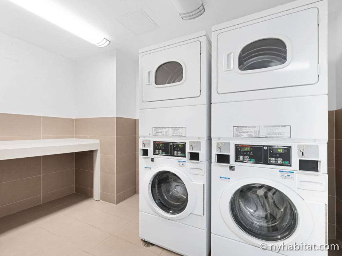 Diese möblierte Mietwohnung befindet sich in der Nähe der Kreuzung 8th Avenue und West 50th Street. Sie liegt im 9. Stock (entspricht dem 8. Stock in Europa) eines Gebäudes mit Aufzug und hat eine Wohnfläche von etwa 60 m². Das Gebäude verfügt über ein Fitnessstudio. Die Wohnung bietet eine Klimaanlage sowie eine Waschmaschine und einen Trockner.