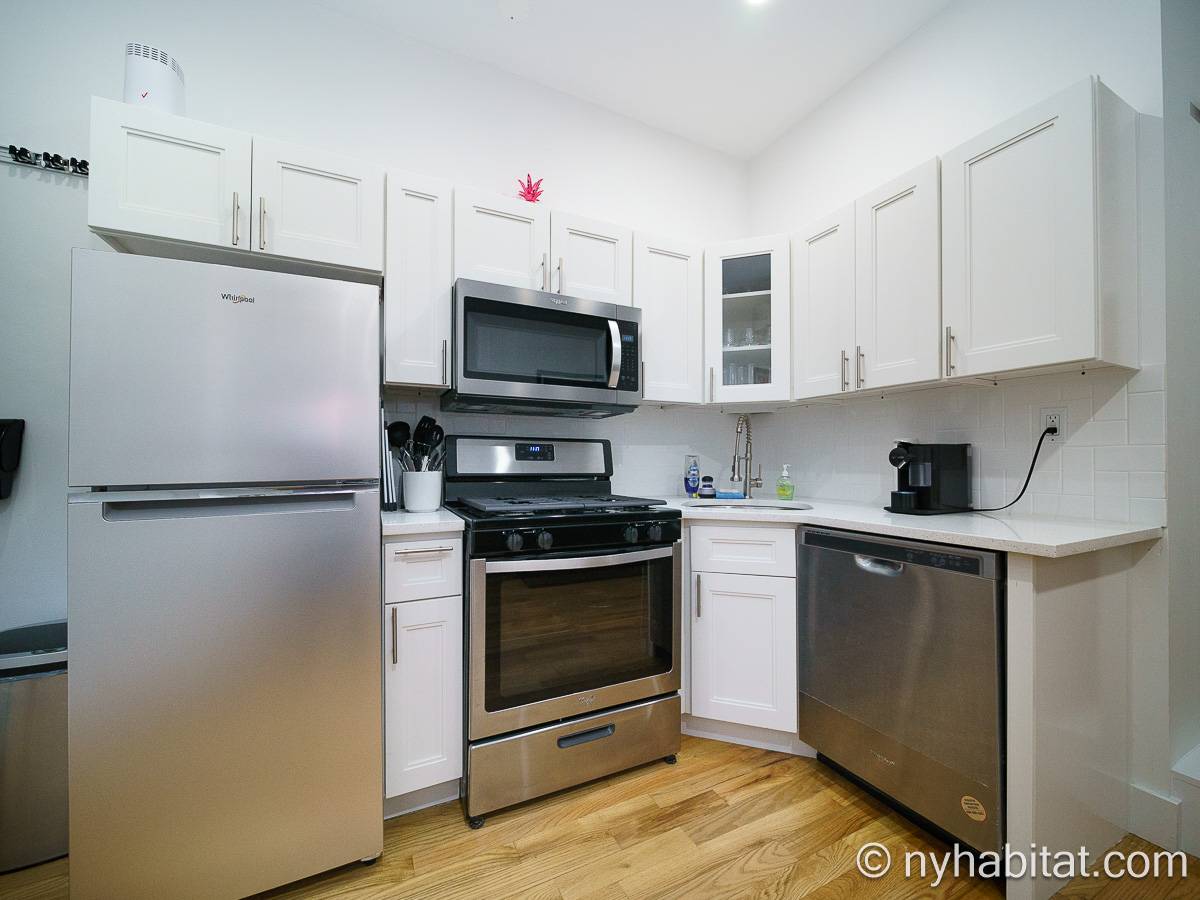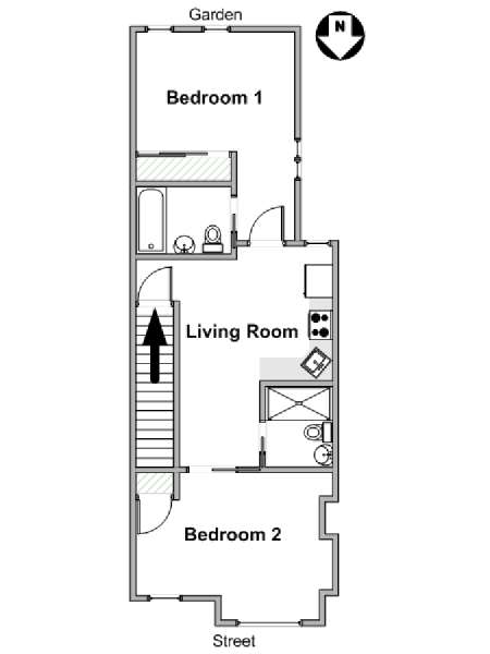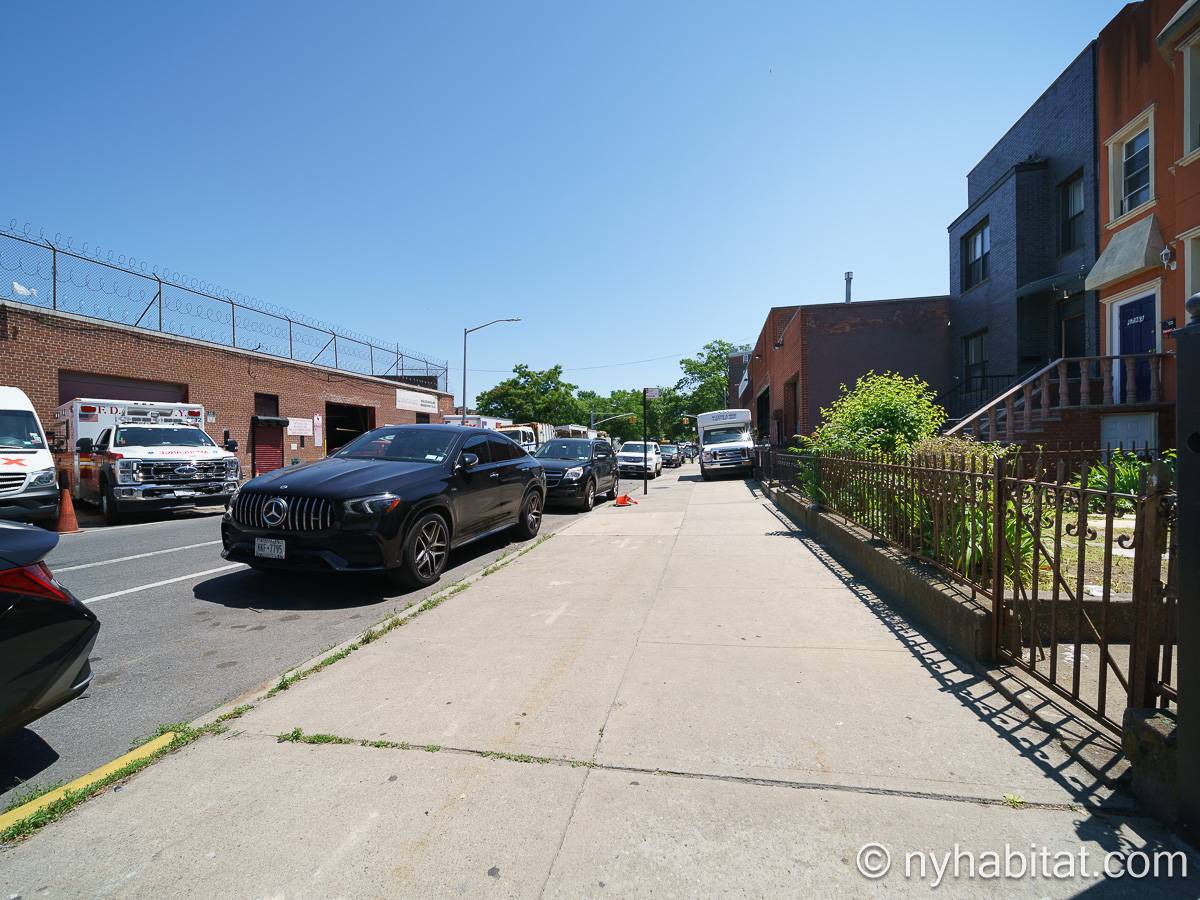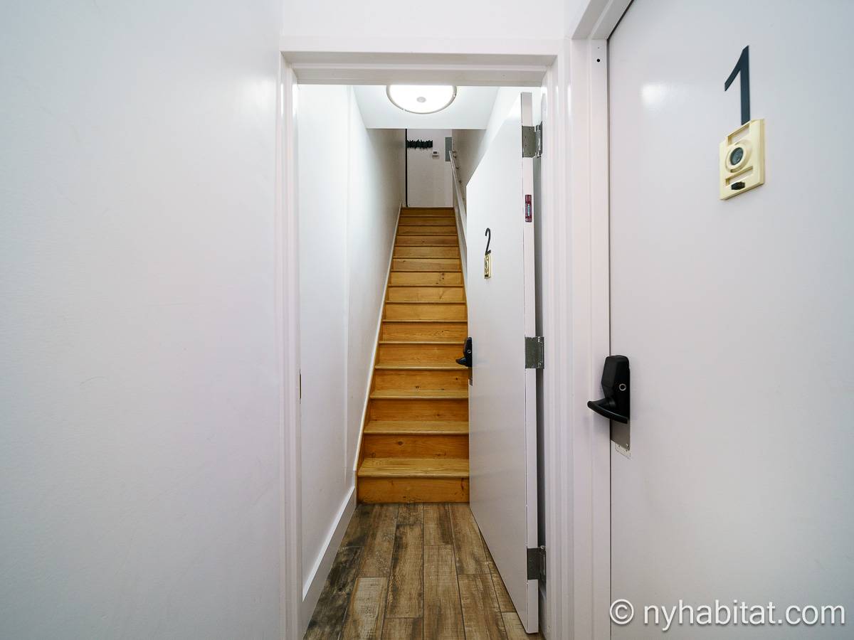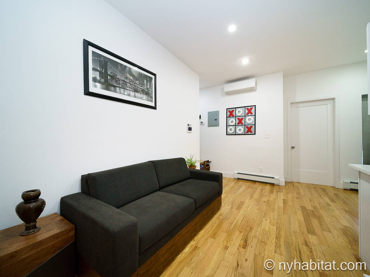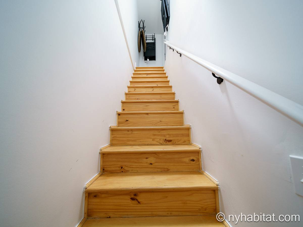Diese 63 m2 große, möblierte Wohnung befindet sich in Crown Heights, Brooklyn, New York. Sie liegt in der 2. Etage (entspricht in Europa dem 1. Stock) und somit im obersten Stockwerk des Gebäudes und ist durchgehend mit Hartholzboden ausgestattet. In diesem Gebäude geringer Höhe gibt es keinen Aufzug.