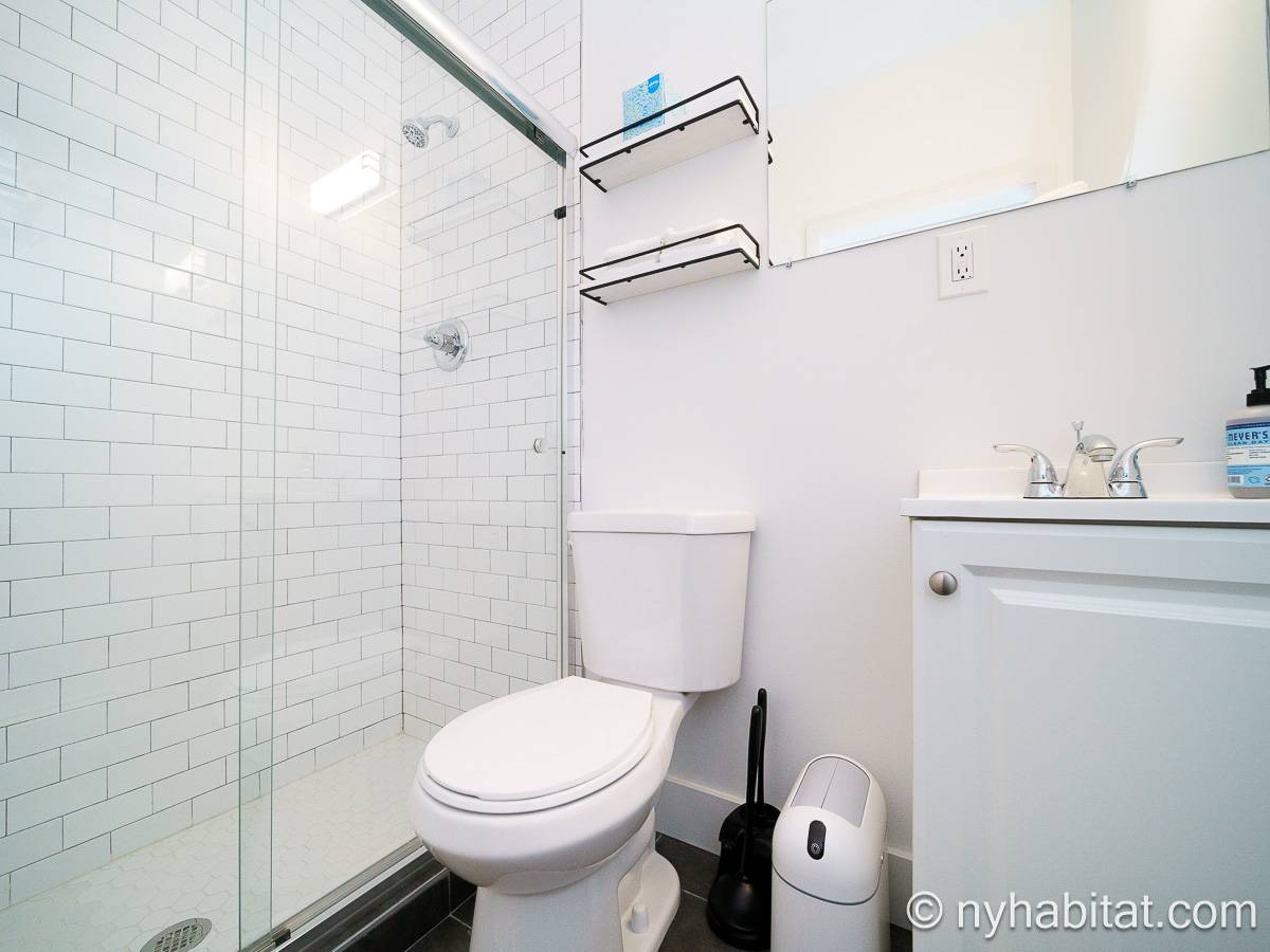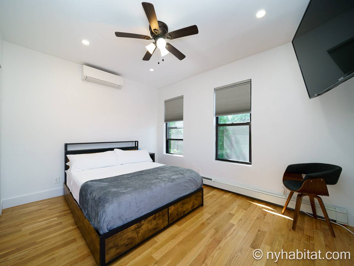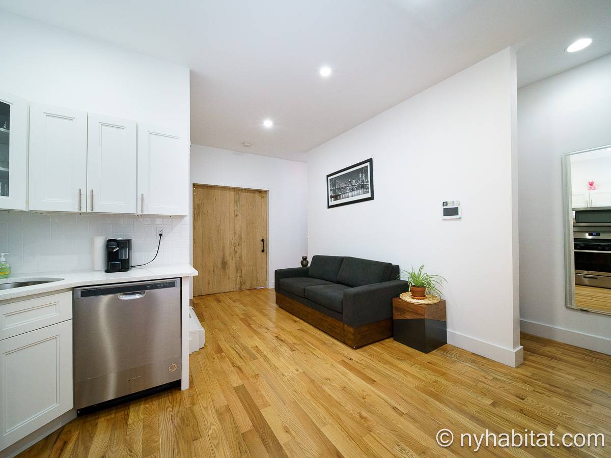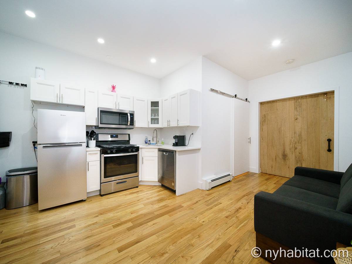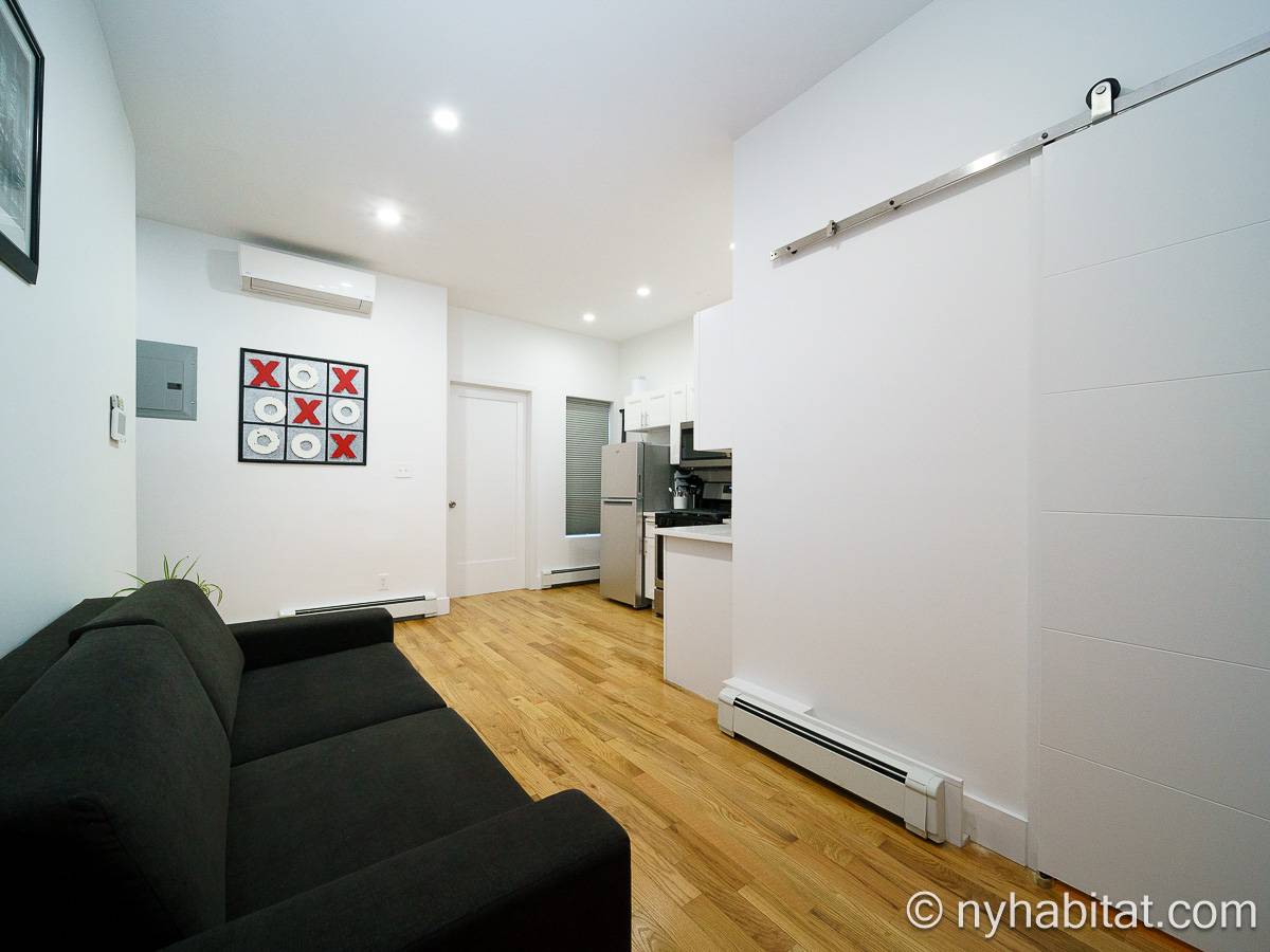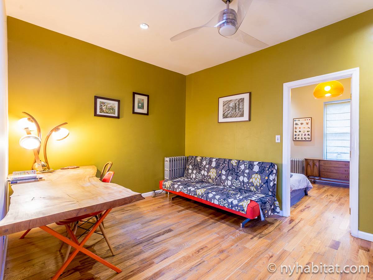 Diese 63 m2 große, möblierte Wohnung befindet sich in Crown Heights, Brooklyn, New York. Sie liegt in der 2. Etage (entspricht in Europa dem 1. Stock) und somit im obersten Stockwerk des Gebäudes und ist durchgehend mit Hartholzboden ausgestattet. In diesem Gebäude geringer Höhe gibt es keinen Aufzug.