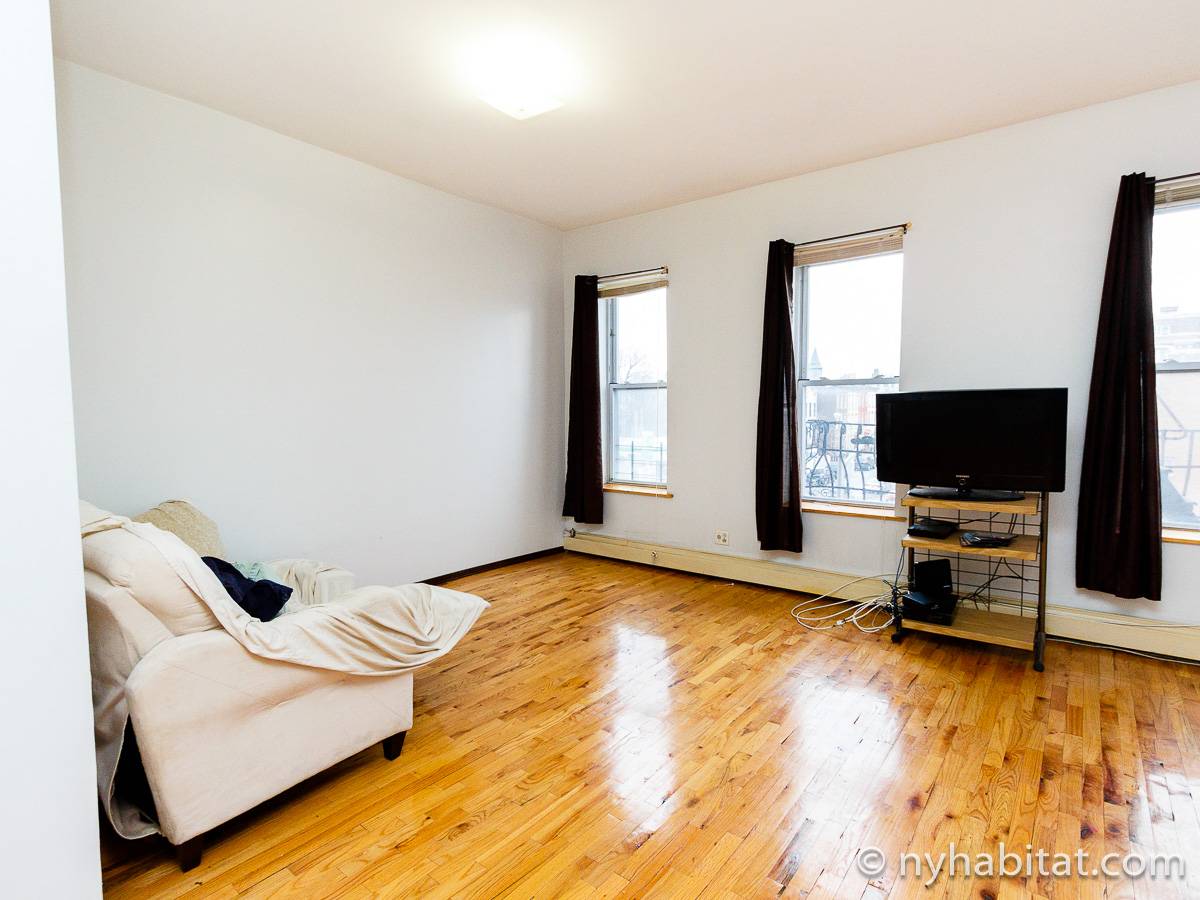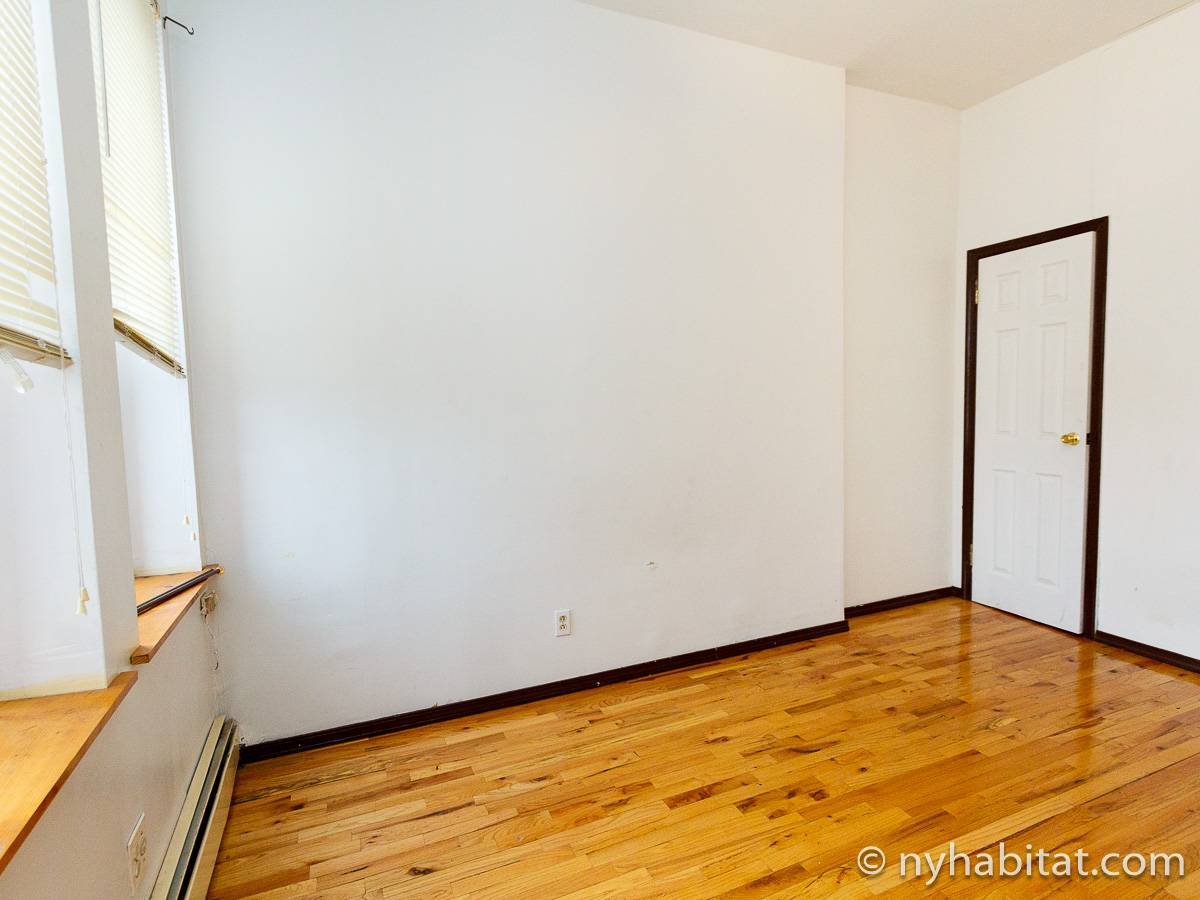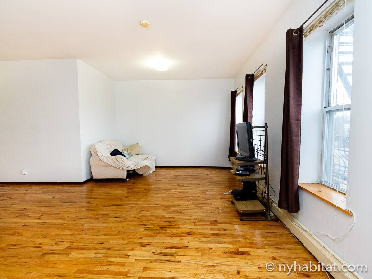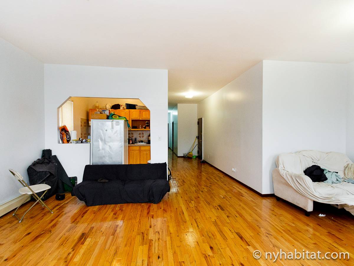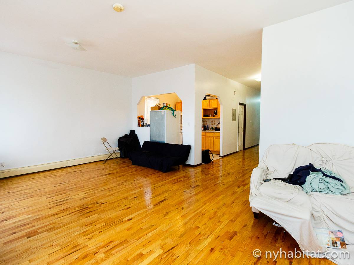 Die New Yorker 4-Zimmer-Wohnung ist minimal eingerichtet und in einem modernen Einrichtungsstil mit Parkettboden gehalten. Das Zimmer ist mit einem Schrank mit reichlich Stauraum ausgestattet und verfügt über zwei Fenster, die natürliches Licht in das Zimmer lassen. Im Wohnzimmer befinden sich zwei Sofas und ein Fernseher mit Kabelanschluss. Die vollausgestattete offene Küche der WG bietet einen Kühlschrank, einen Backofen und einen Toaster. Das nur über Schlafzimmer 1 zugängliche private Badezimmer besteht aus einer Dusche, einer Badewanne, einem WC und einem Waschbecken mit Unterschrank.