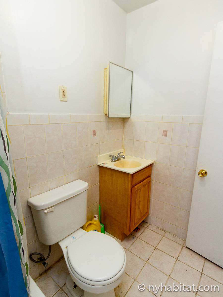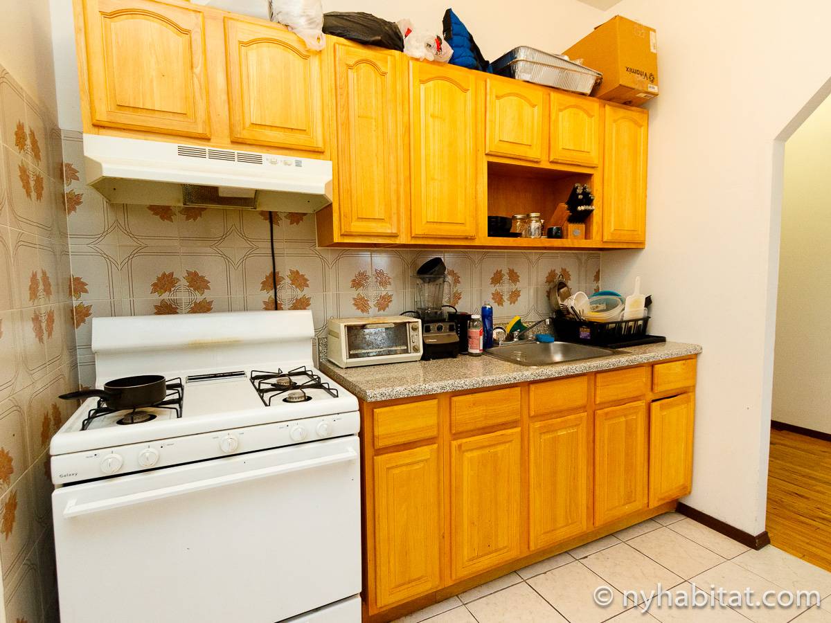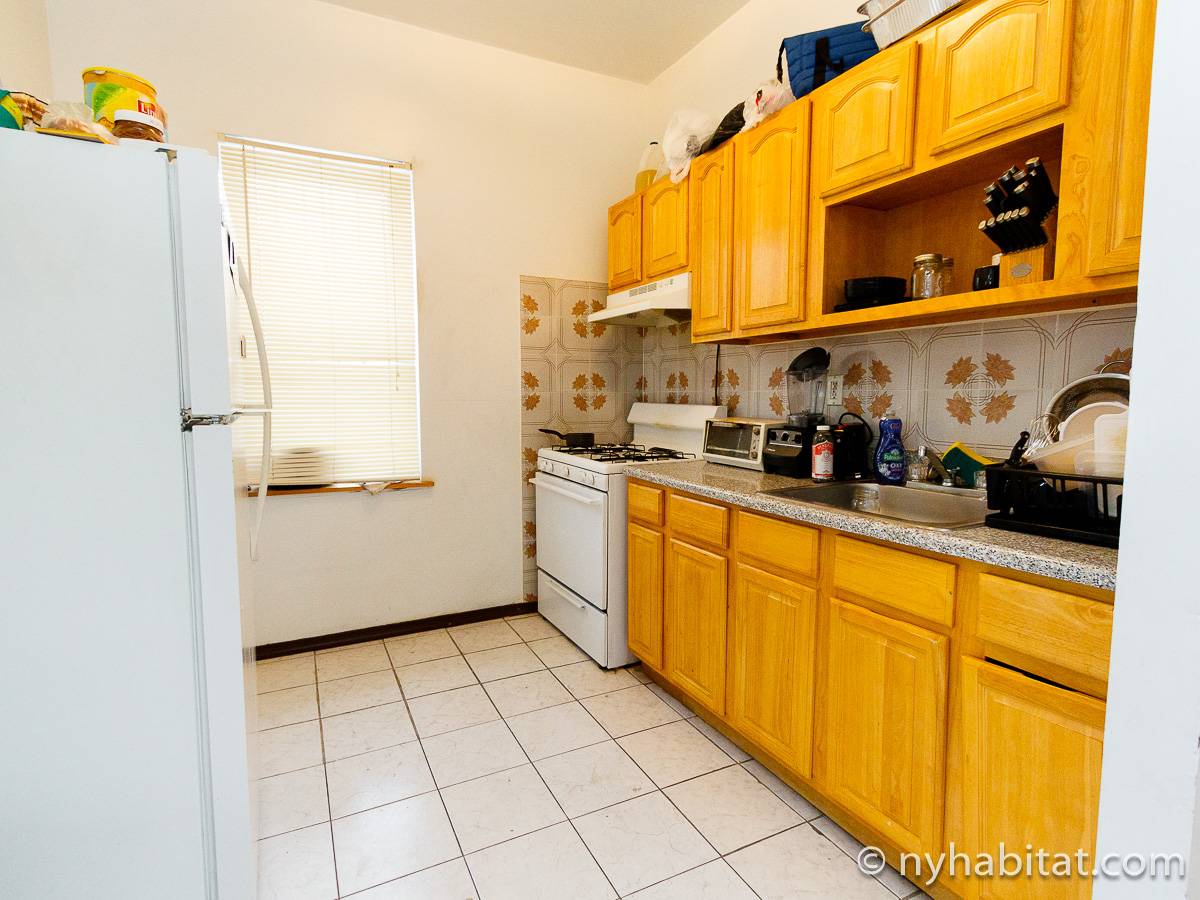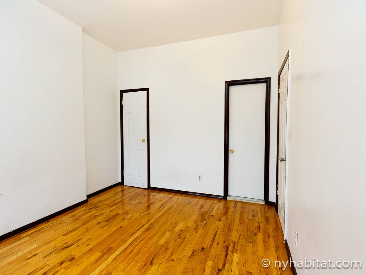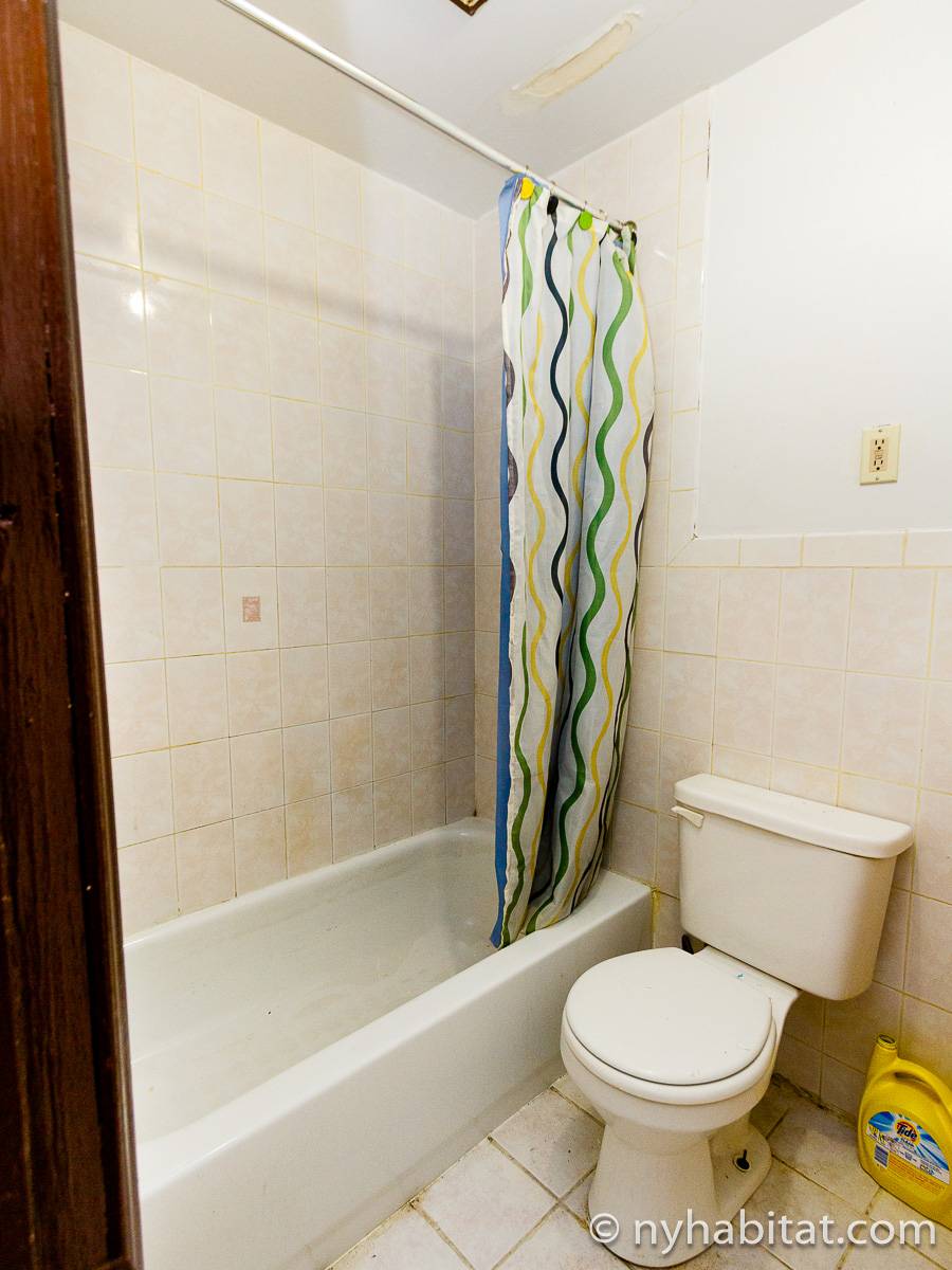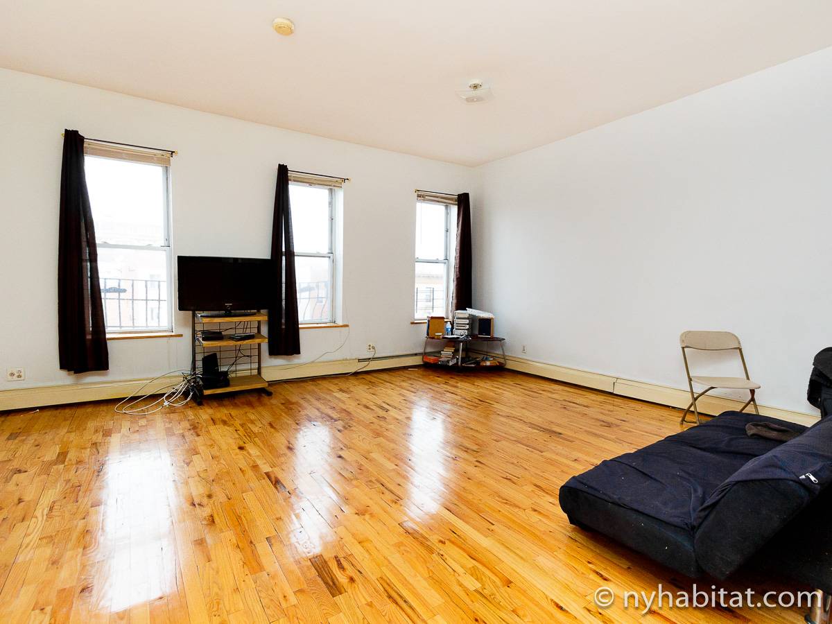 Die New Yorker 4-Zimmer-Wohnung ist minimal eingerichtet und in einem modernen Einrichtungsstil mit Parkettboden gehalten. Das Zimmer ist mit einem Schrank mit reichlich Stauraum ausgestattet und verfügt über zwei Fenster, die natürliches Licht in das Zimmer lassen. Im Wohnzimmer befinden sich zwei Sofas und ein Fernseher mit Kabelanschluss. Die vollausgestattete offene Küche der WG bietet einen Kühlschrank, einen Backofen und einen Toaster. Das nur über Schlafzimmer 1 zugängliche private Badezimmer besteht aus einer Dusche, einer Badewanne, einem WC und einem Waschbecken mit Unterschrank.
