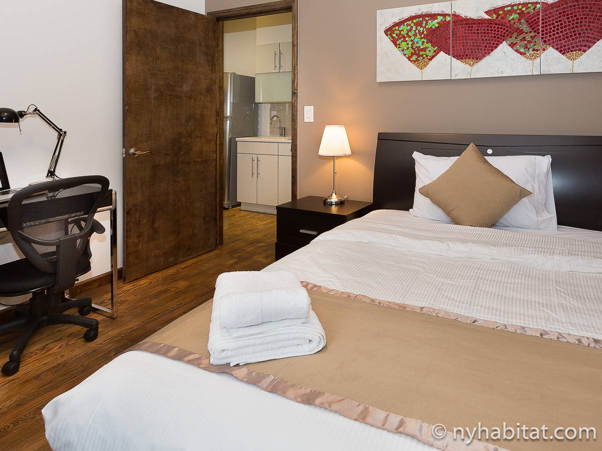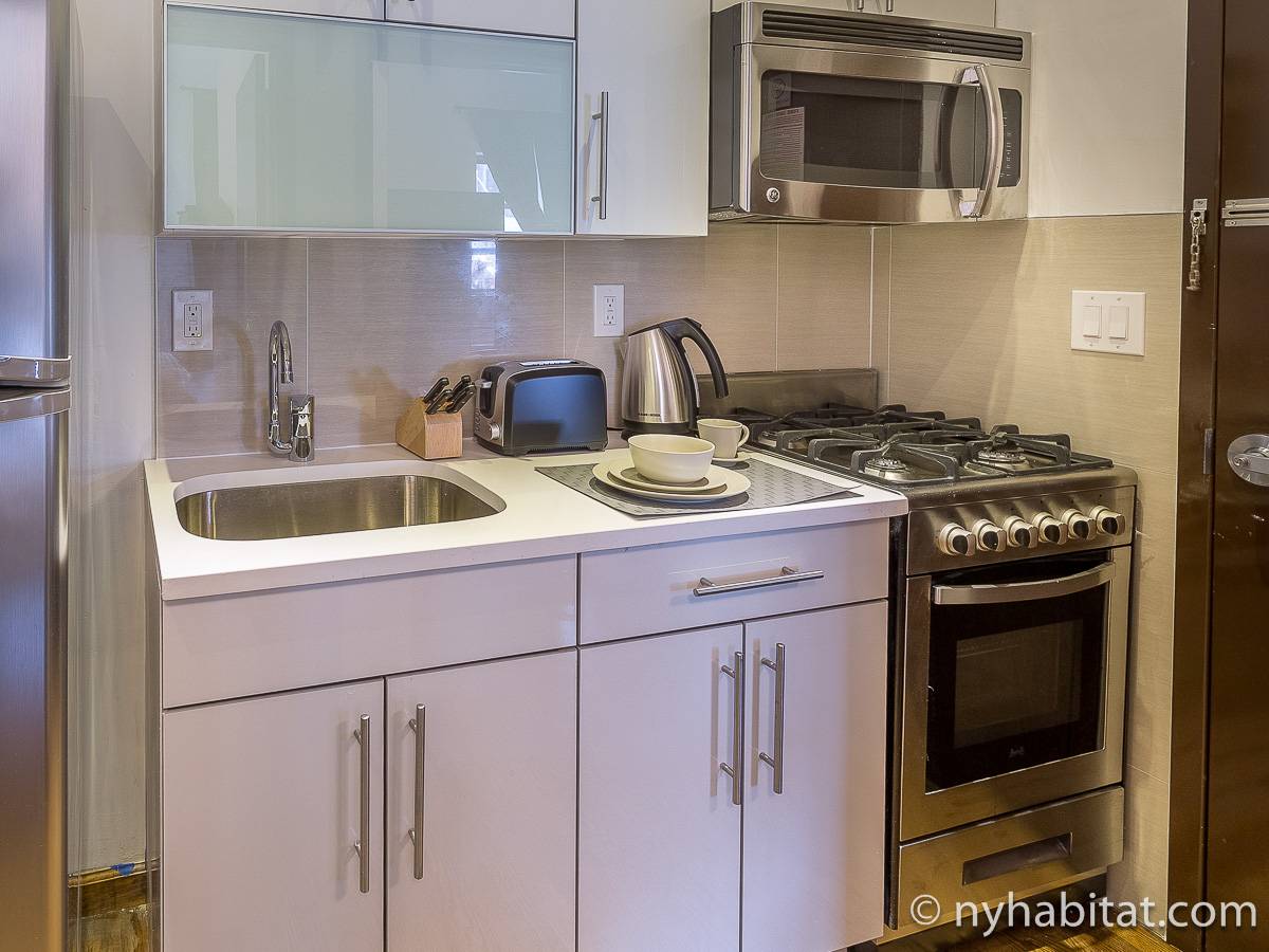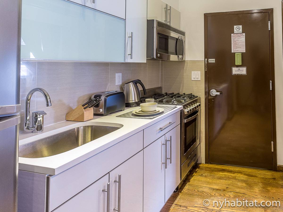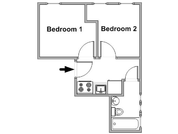 Beide Schlafzimmer der möblierten Wohnung sind modern eingerichtet mit einem Fernseher an der Wand sowie einem Schreibtisch mit Stuhl, einem Doppelbett und reichlich Stauraum. Die moderne Küchenzeile ist mit allen notwendigen rostfreien Geräten ausgestattet, darunter eine Mikrowelle, ein Wasserkocher, ein Toaster und ein Backofen. Es gibt auch einen Waschraum im Gebäude. Das geflieste Badezimmer hat eine große begehbare Dusche mit einer Regendusche von Grohe.