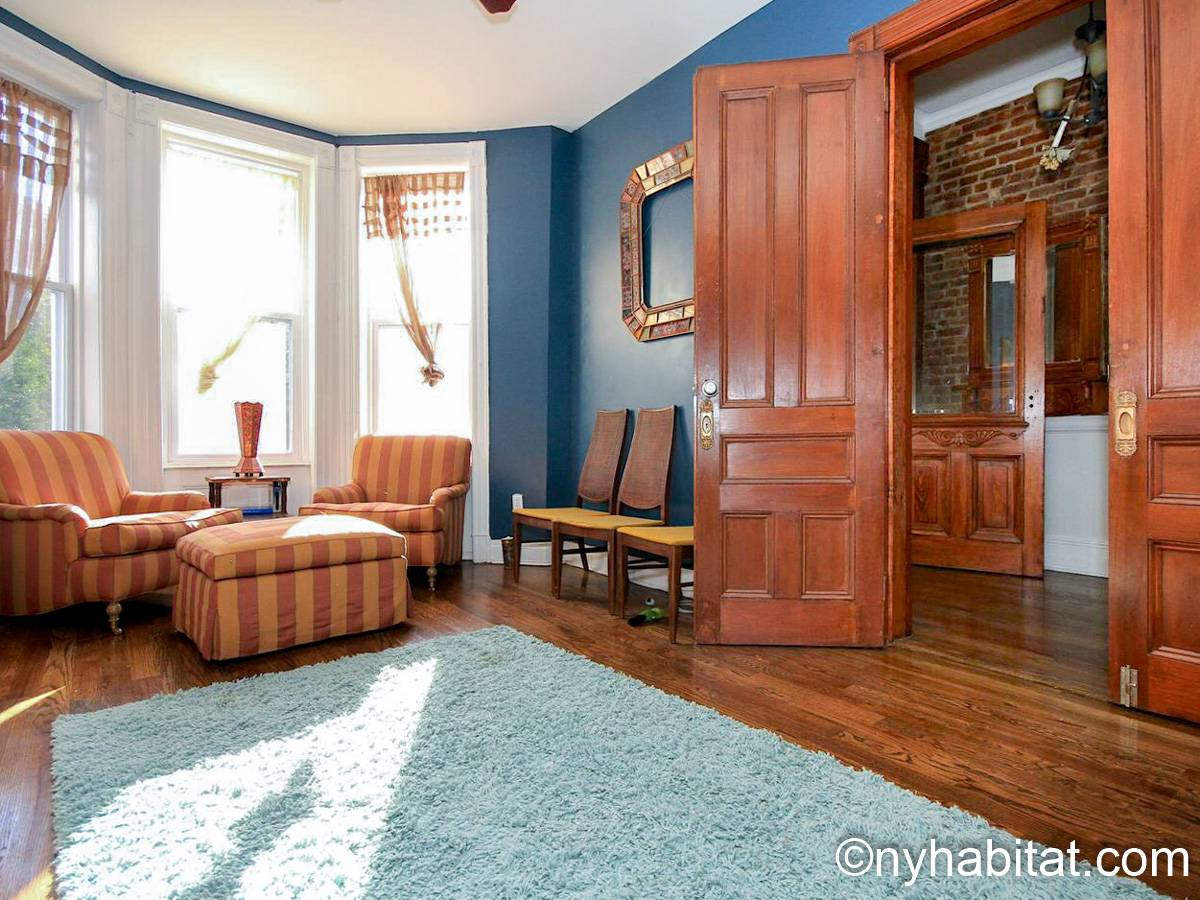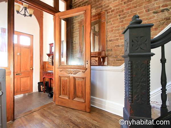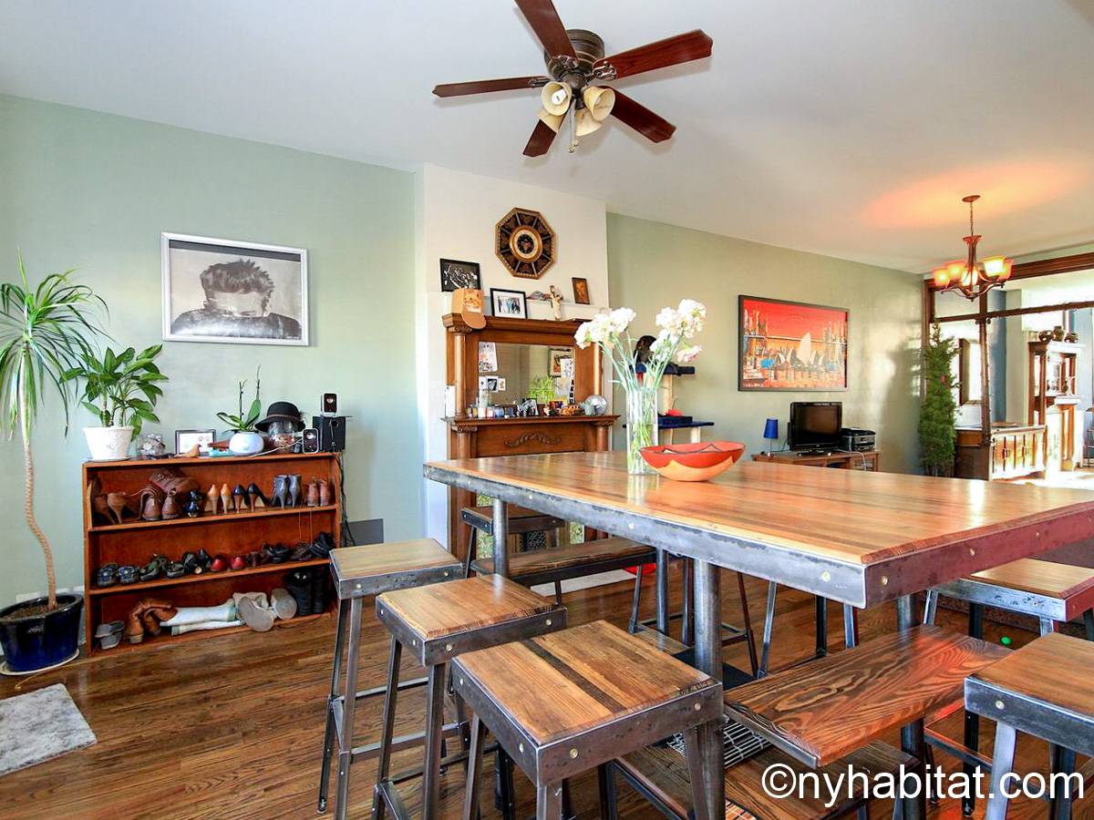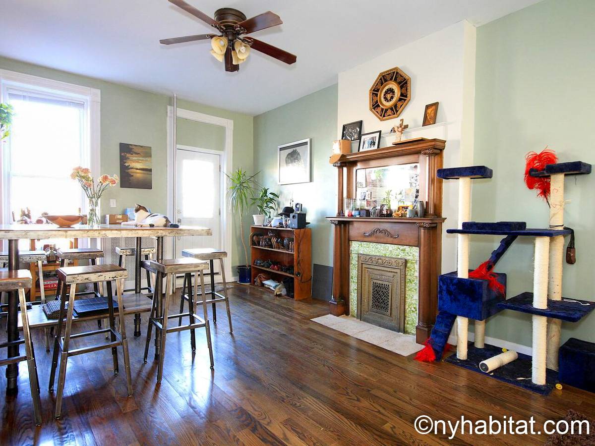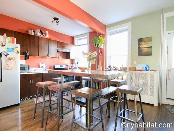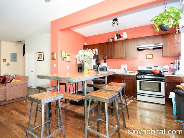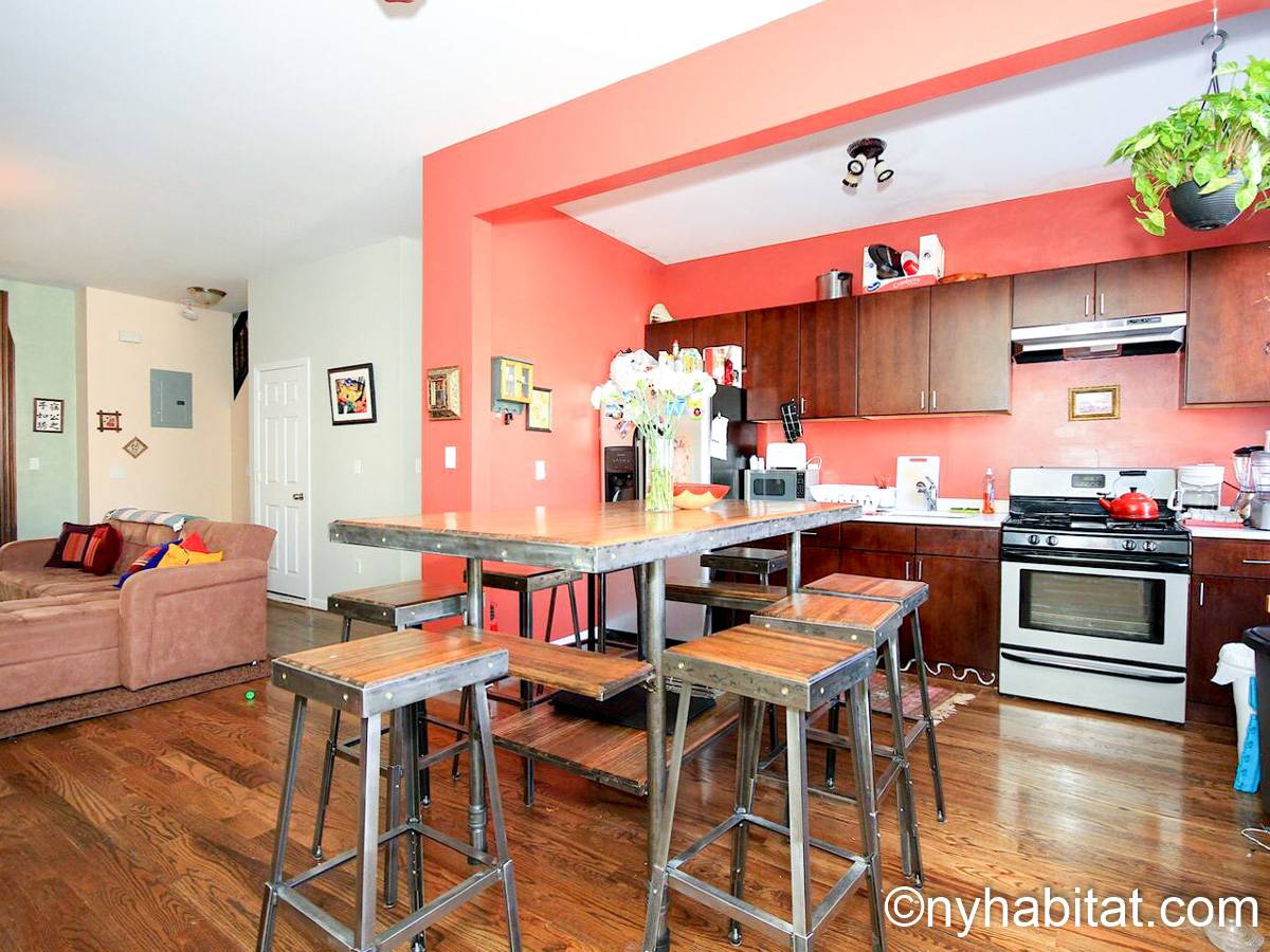 Diese möblierte Wohngemeinschaft liegt in Bushwick, einem Viertel in Manhattan. Die 3-Zimmerwohnung im Maisonette-Stil mit 1 Badezimmer und 1 Gäste-WC befindet sich im 1. und 2. Stock (entspricht in Europa dem Erdgeschoss und 1. Stock) eines Gebäudes ohne Aufzug zwischen der Hancok Street und Wilson Avenue.