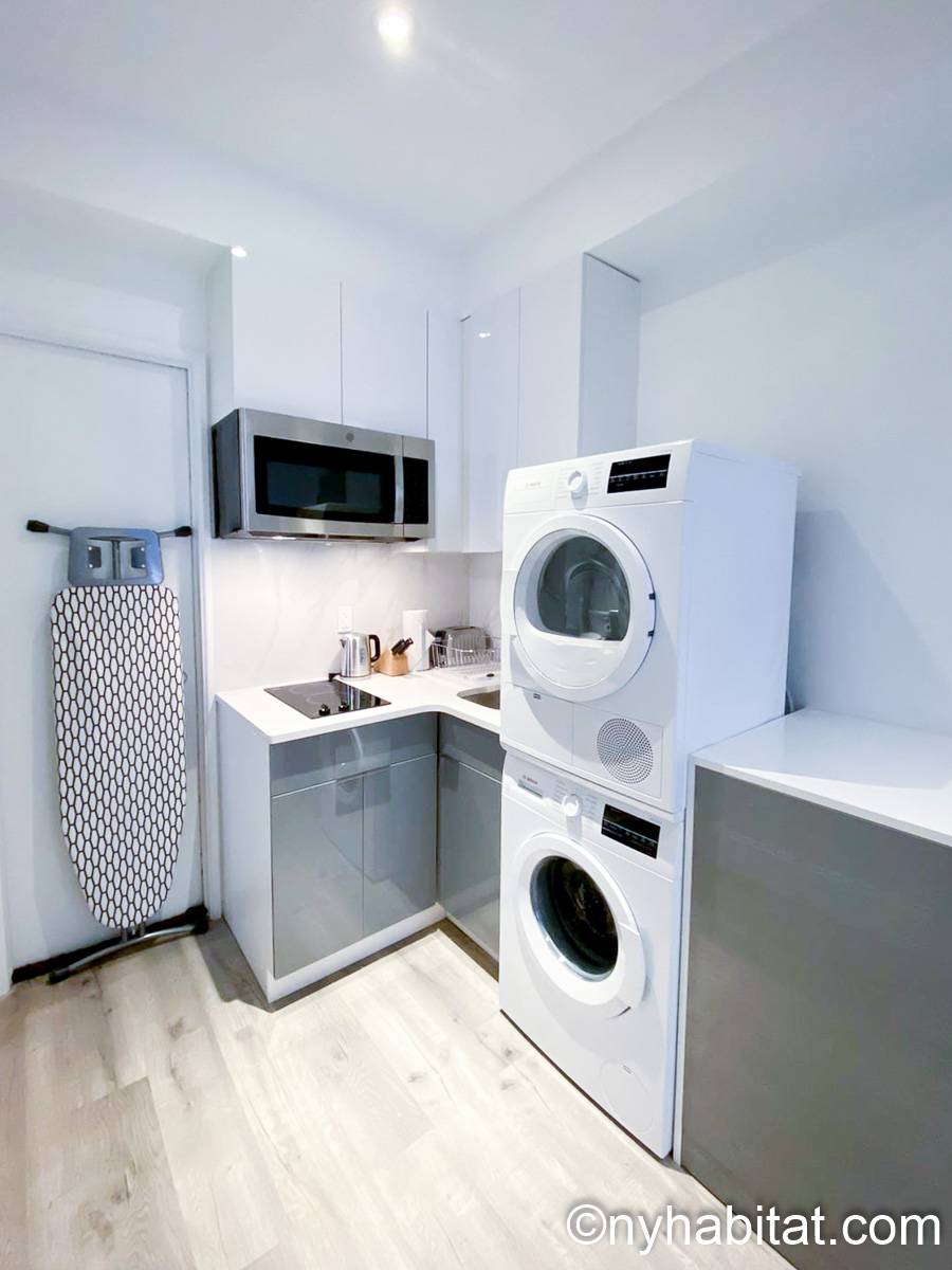 In der Zweizimmerwohnung werden Sie auch eine Waschmaschine und einen Trockner vorfinden! Beide Maschinen befinden sich in der separaten Küche. Diese ist mit weißen Wänden sowie mit einem Kühlschrank, einer Tiefkühltruhe, einer Mikrowelle und einem Toaster ausgestattet.