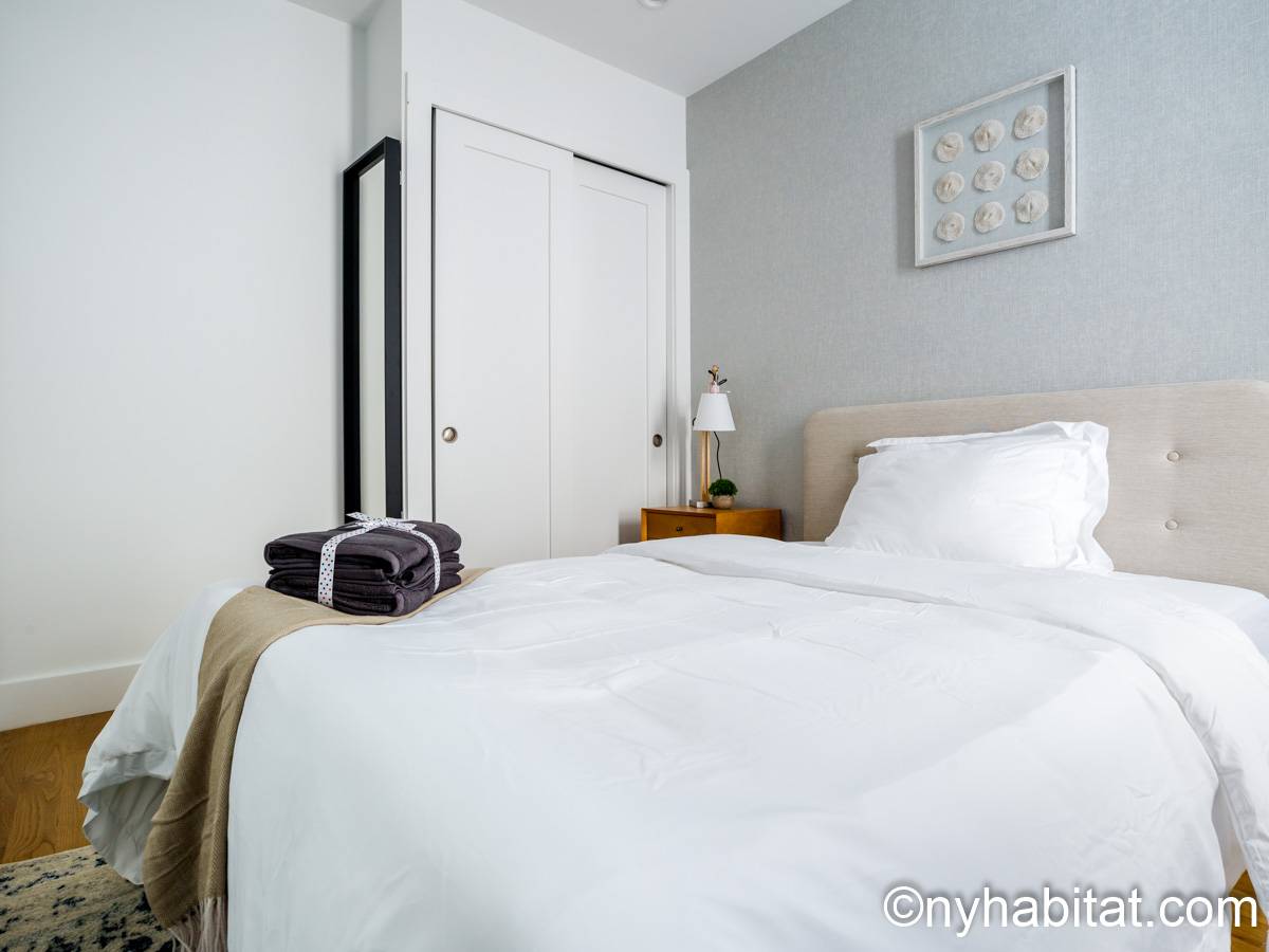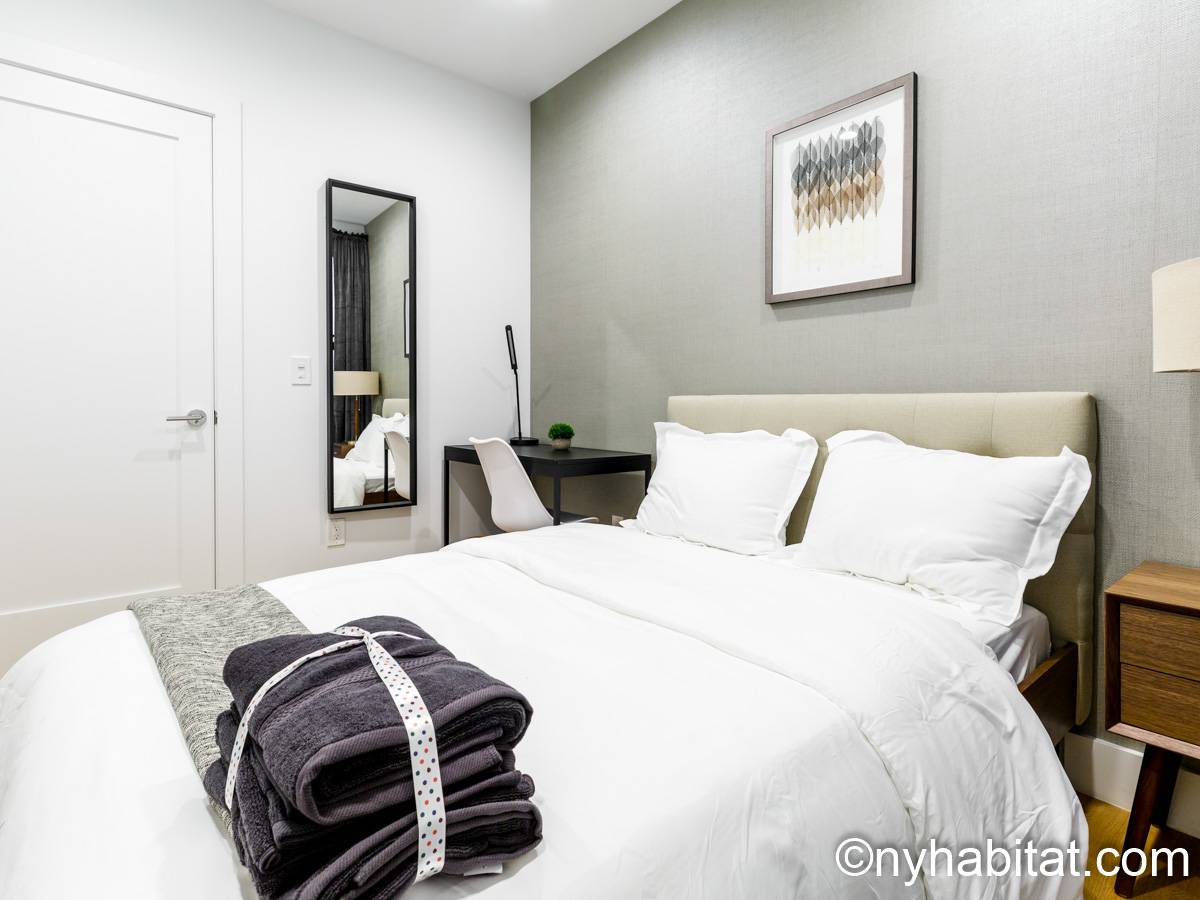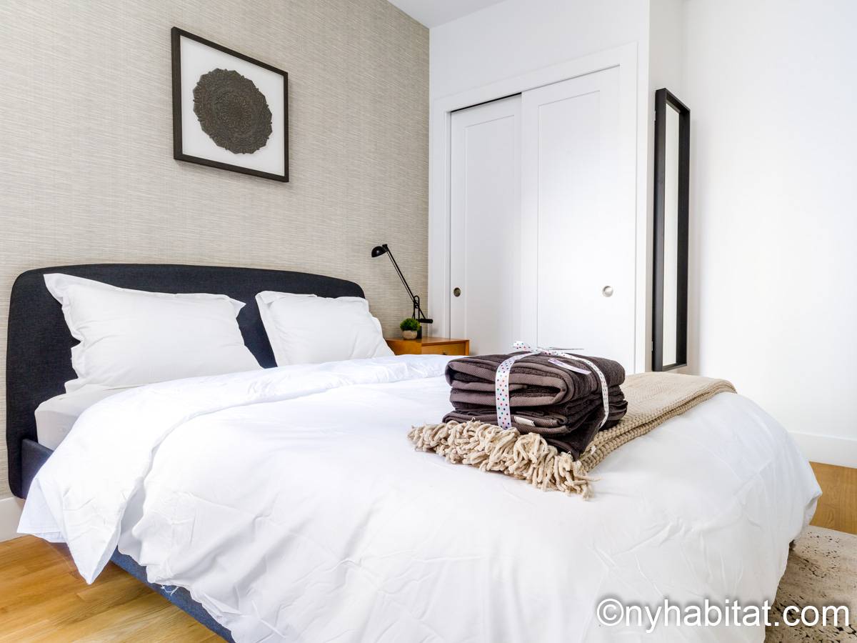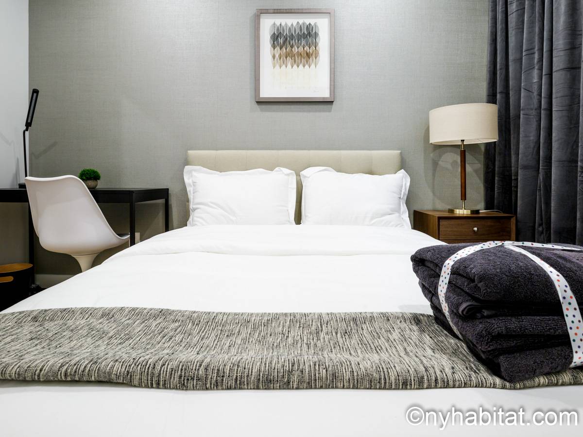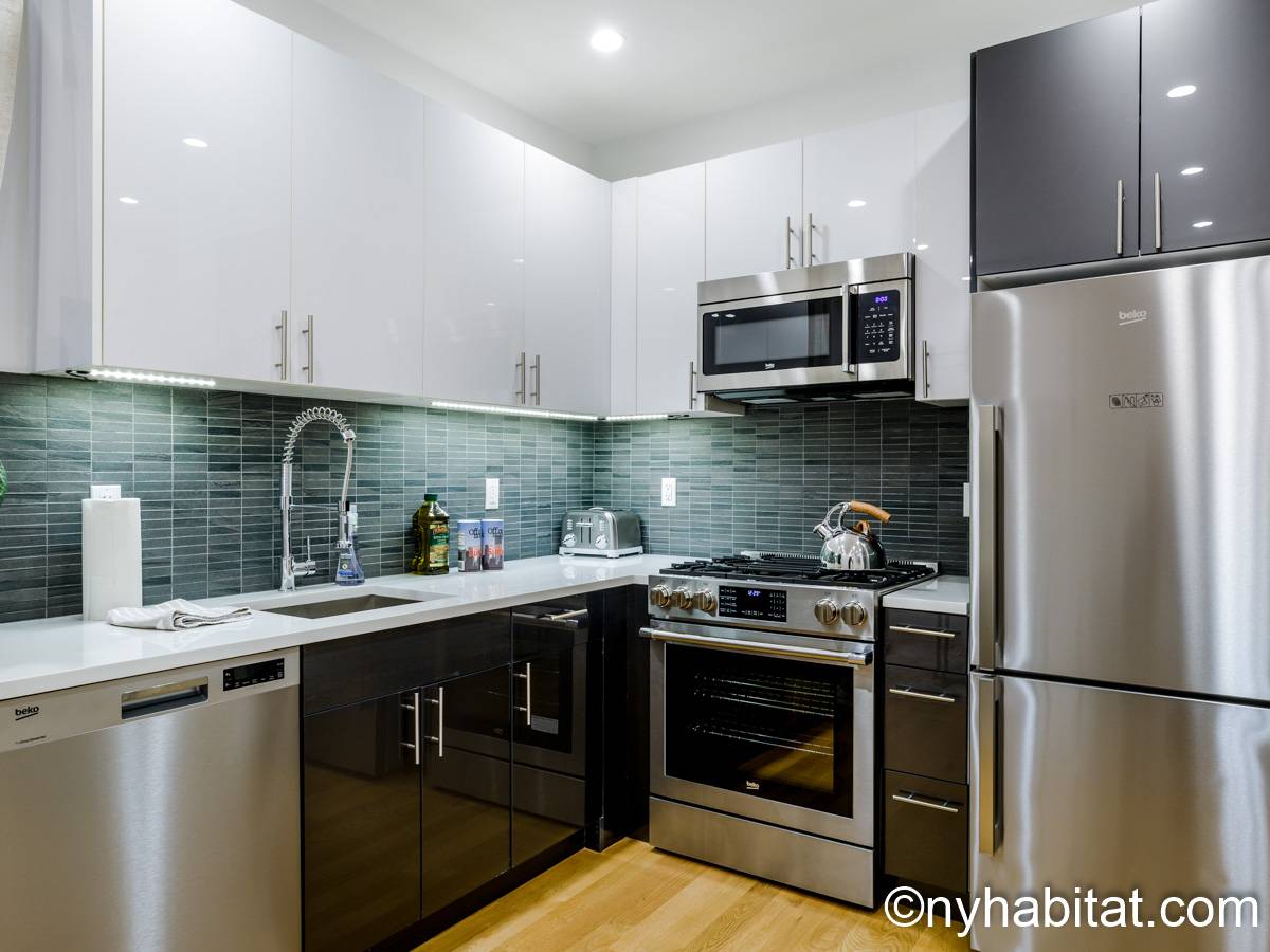 Unabhängig davon, ob Sie für einen kurzen oder längeren Aufenthalt bleiben, ist jedes Schlafzimmer mit prächtigen Hartholzböden und Erdtönen ausgestattet, die für einen ruhigen und erholsamen Aufenthalt sorgen. Ein getuftetes Doppelbett in voller Größe lädt zum Entspannen ein. Allerdings muss Gemütlichkeit nicht langweilig sein. Die 5-Zimmer-Wohnung ist mit vollwertigen Edelstahlgeräten ausgestattet. In der Chefküche gibt es moderne Geräte wie einen Geschirrspüler, eine Mikrowelle und einen Gasherd mit Backofen. Natürlich sind auch die Waschmaschine und der Trockner in der WG von großem Vorteil. Es gibt zwei Badezimmer mit weißen Ziegelwänden und einem schönen weißen Anstrich. Außerdem gibt es innerhalb des Gebäudes einen Müllschlucker.