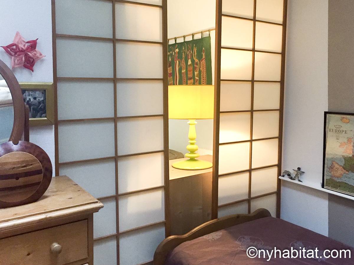 Eine Wendeltreppe führt Sie zum unteren Stockwerk, wo Sie das Wohnzimmer und die Küche sowie das dritte Schlafzimmer finden. Dieses Schlafzimmer ist dank zweier japanischer Schiebetüren einzigartig und flexibel arrangiert und kann in drei kleinere Räume geteilt werden. Das Schlafzimmer ist super für Kinder geeignet und hat zwei Einzelbetten sowie ein Doppelbett (beachten Sie die niedrige Deckenhöhe im Loft-Bereich). Die lichtdurchlässigen Steine der Terrasse über diesem Raum lassen Tageslicht in das Zimmer fallen, ähnlich wie bei Dachfenstern. Aber bitte beachten Sie, dass in diesem Raum keine zu öffnenden Fenster sind.