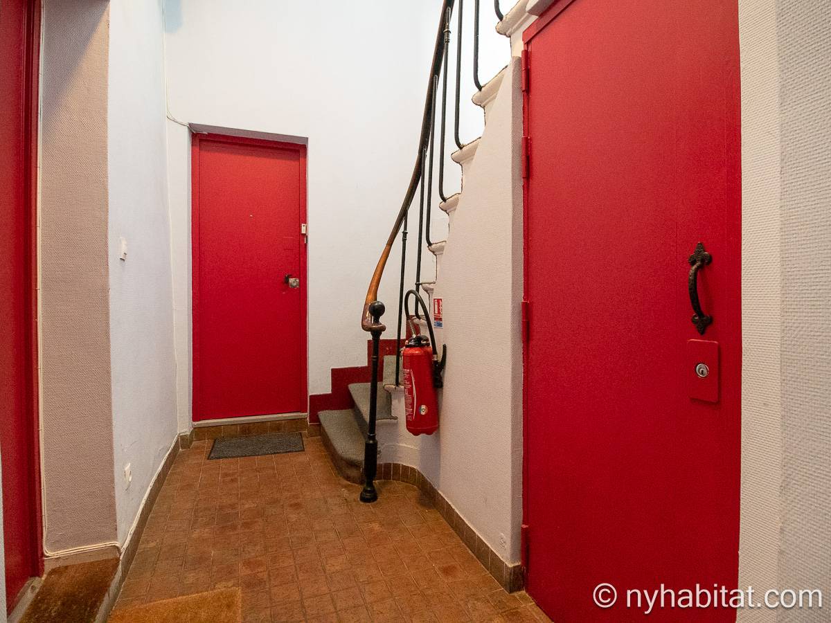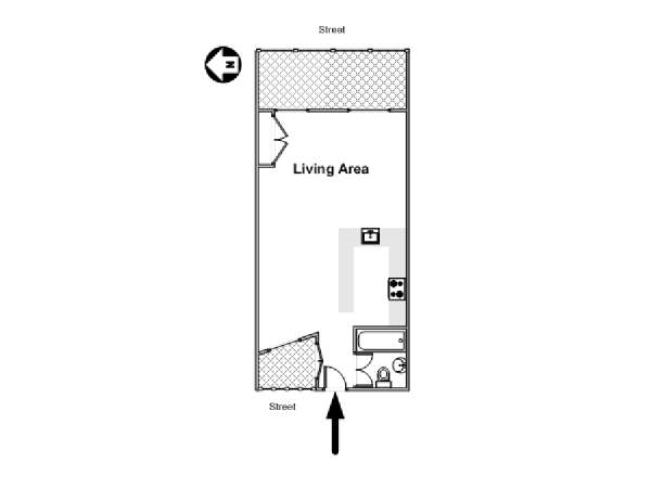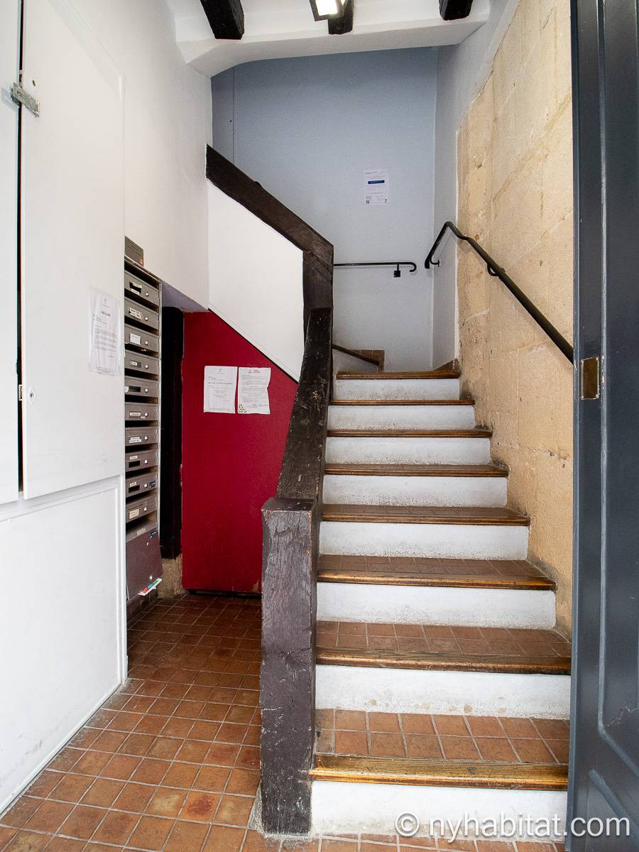 Diese Studiowohnung befindet sich im vierten Stock eines Gebäudes ohne Aufzug in Les Halles im 1. Arrondissement von Paris. Es stammt aus dem 18. Jahrhundert, besitzt eine Gegensprechanlage und hat zwei Terrassen an den gegenüberliegenden Enden der Wohnung, sodass das Beste aus ihrer Ost-Westlage gemacht wird.