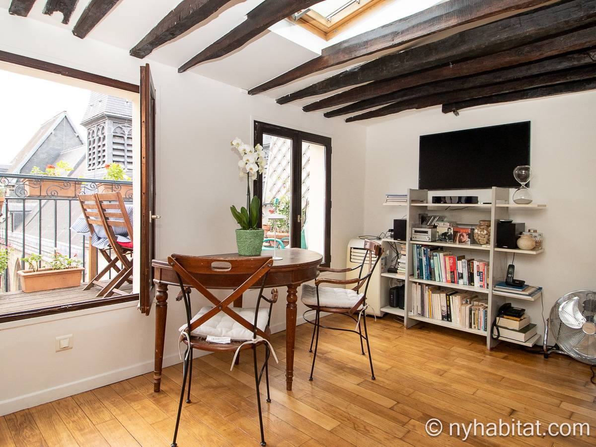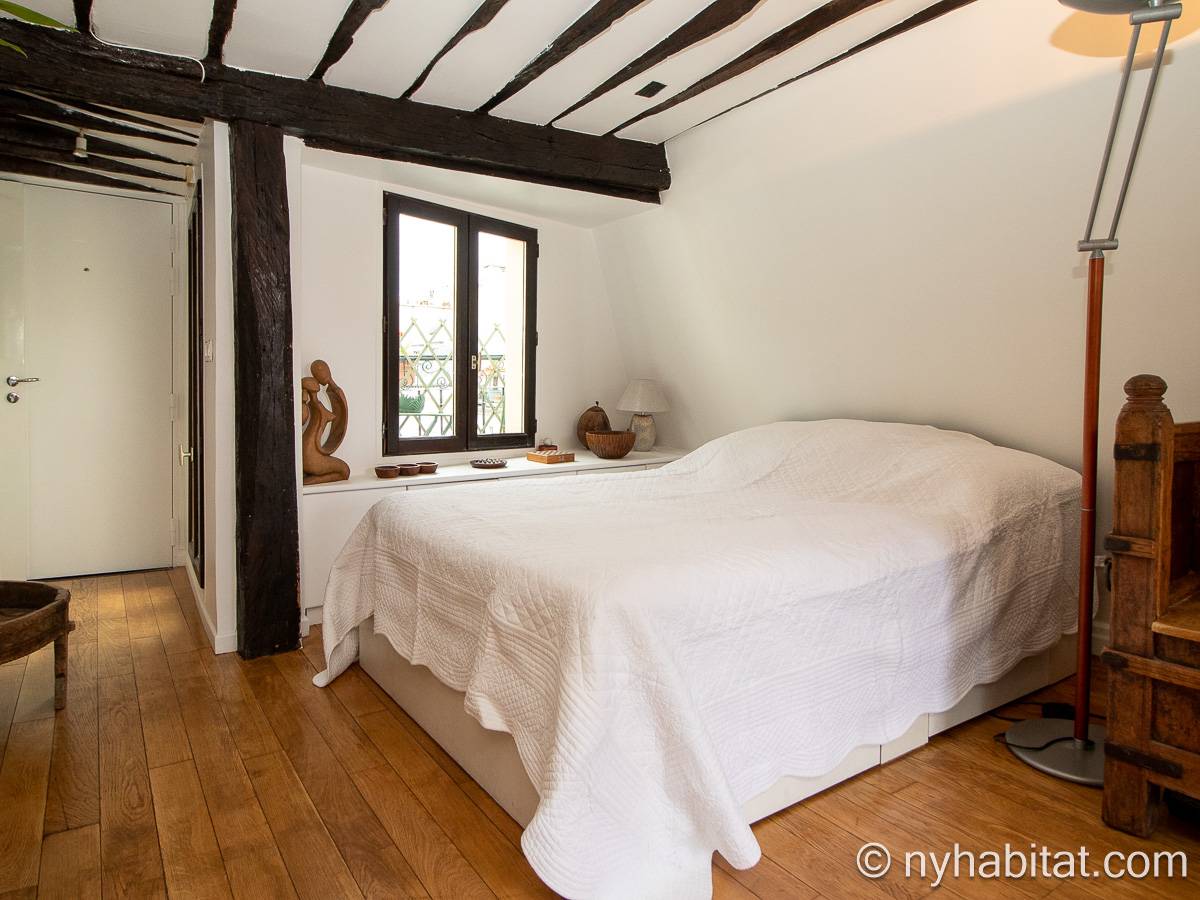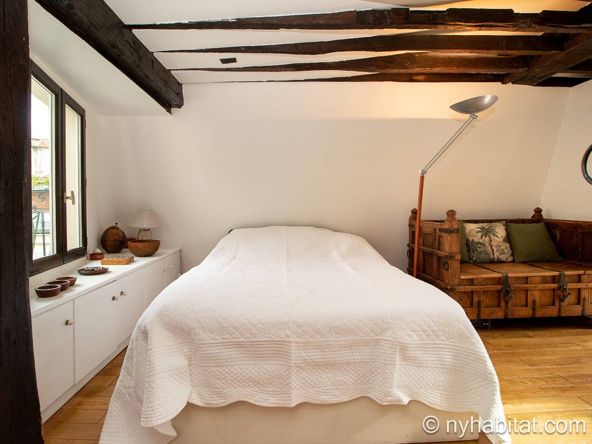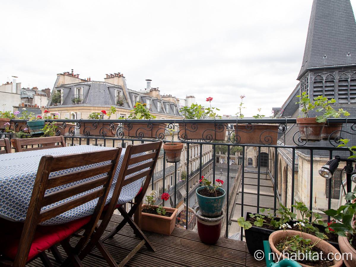 Die schönen Balkonen mit Topfblumen und immergrünen Pflanzen haben einen Blick auf die unten liegende Fußgängerzone. Die größere hat einen Terrassentisch aus Holz, vier dazu passende Stühle und einen Sonnenschirm; sie hat einen Ausblick auf das kunstvolle Dach und die Türme der Kirche Saint-Leu-Saint-Gilles, die sich gleich auf der anderen Straßenseite befindet. Die kleinere Terrasse bietet eine hübsche Aussicht auf benachbarte Gebäude mit typischen Pariser Dächern. Die Decken sind mit freiliegenden Balken ausgekleidet, die sehr gut zu den Hartholzfußböden und den Holzmöbeln passen. Der Wohnbereich ist mit einem Doppelbett und einem einzigartigen Zweiersofa aus Holz ausgestattet und zur Küche hin offen. Zusätzlich zur Frühstückstheke hat die Küche eine ordentliche Arbeitsfläche und drei Barhocker, die aus Schmiedeeisen und Leder gefertigt sind. Sie ist mit den üblichen Kochgeräten und -utensilien ausgestattet. Es gibt außerdem einen Fernseher mit Kabelanschluss, eine Stereoanlage, ein Telefon, kabellosen Internetanschluss und eine Waschmaschinen-Trockner Kombination. Flügeltüren aus edlem antikem Holz führen ins Badezimmer, das mit marokkanischen Terrakottafliesen ausgelegt ist. Im Badezimmer gibt es eine Badewanne mit einem abnehmbaren Duschkopf, einen großen Spiegel unter einer integrierten Beleuchtung, einen Schrank unter einem weißen Waschbecken und eine Toilette. Abgesehen von seinem reizenden Inneren ist das Beste an dieser Studiowohnung definitiv seine praktische Lage!