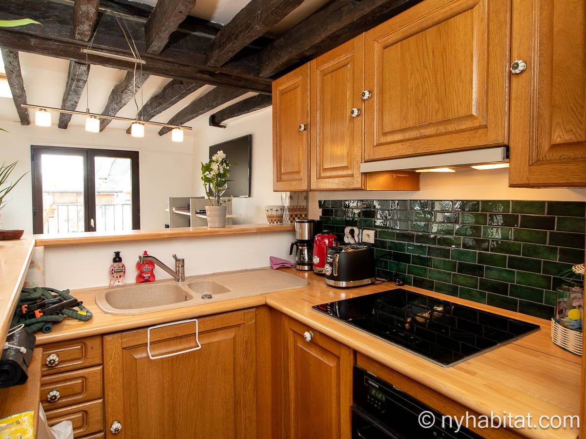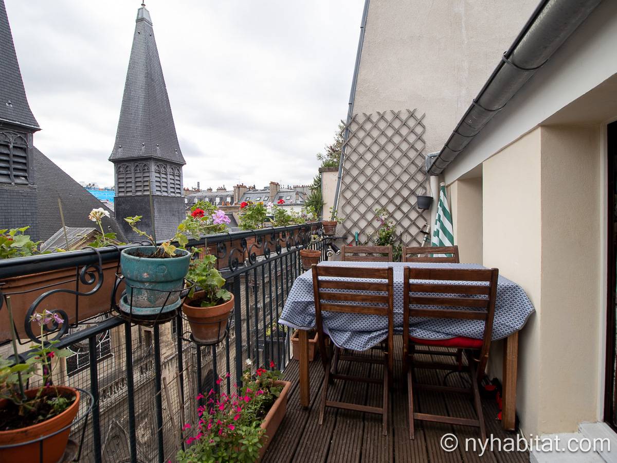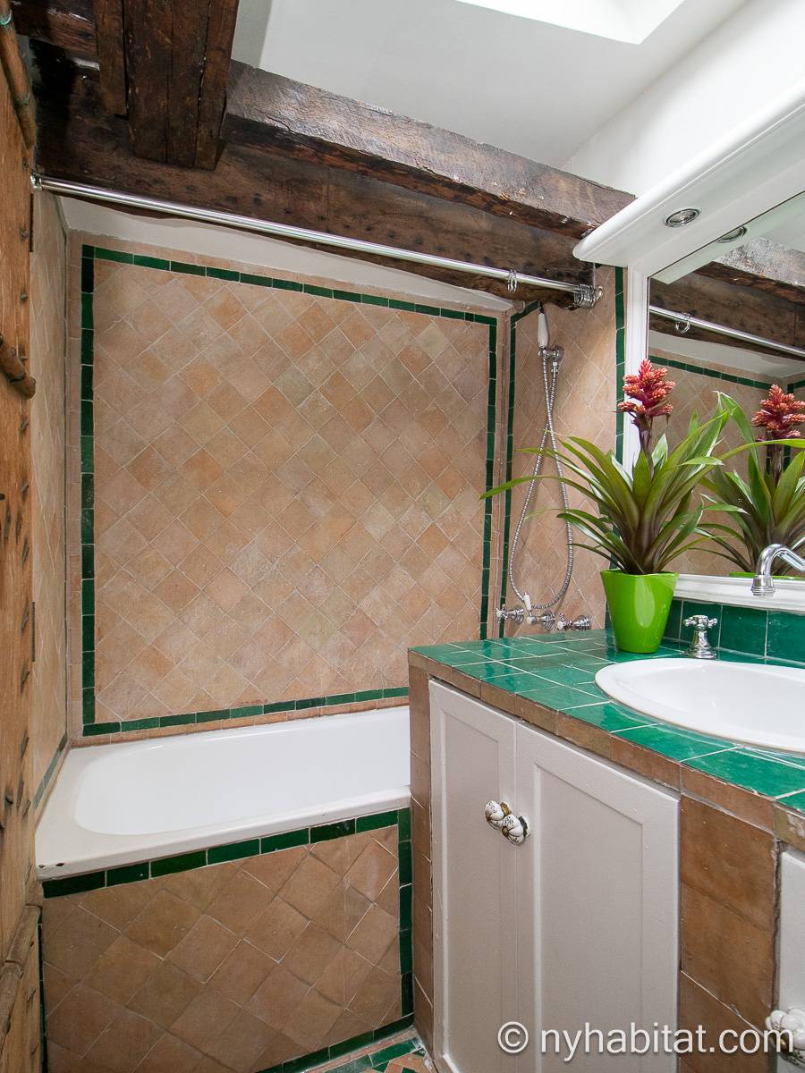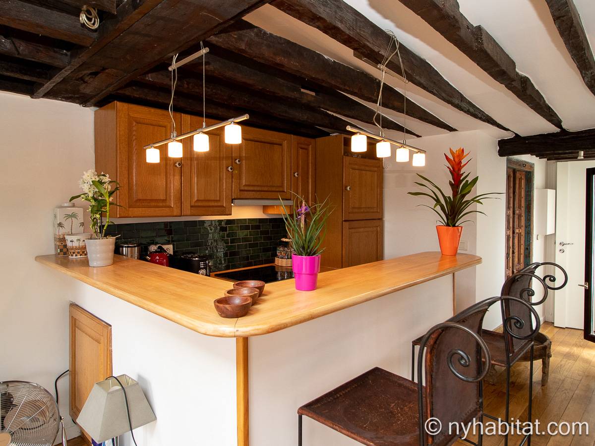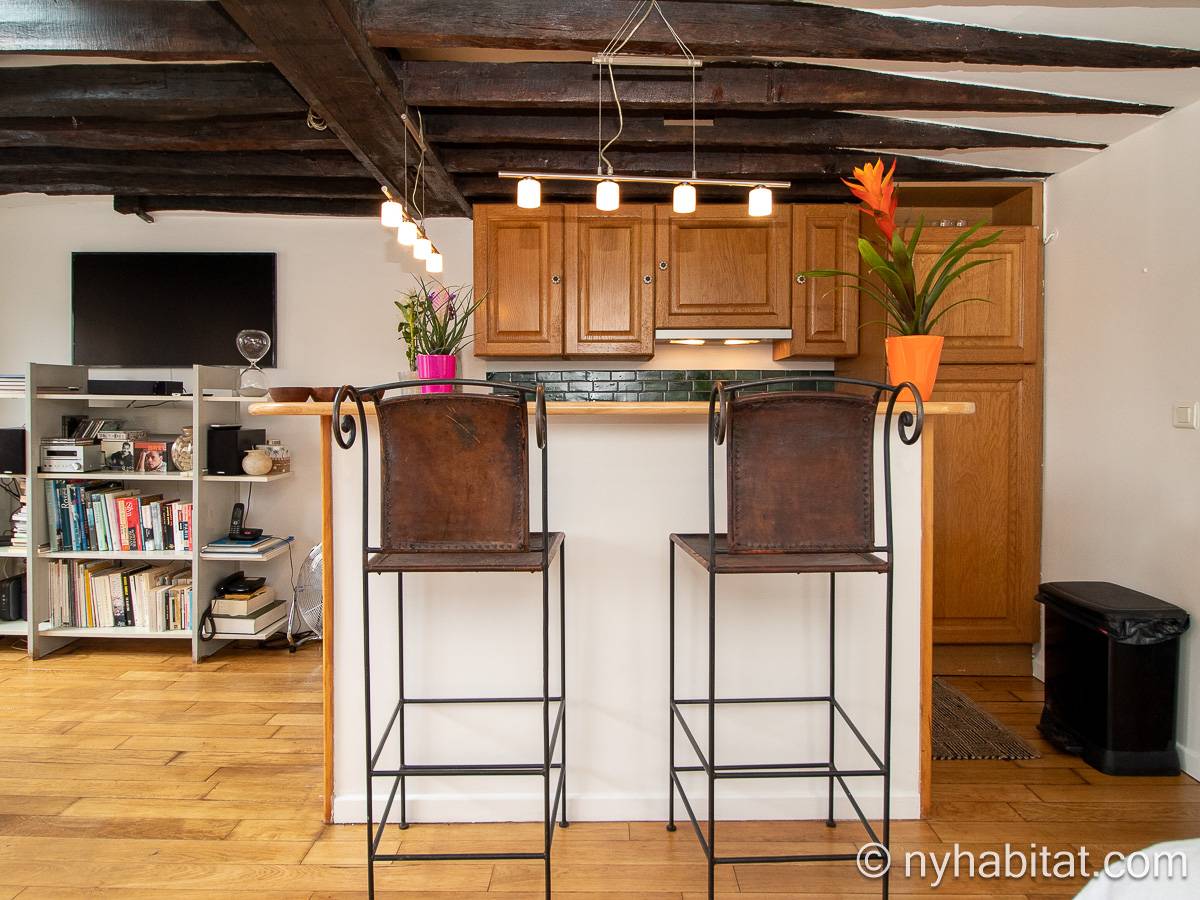 Die schönen Balkonen mit Topfblumen und immergrünen Pflanzen haben einen Blick auf die unten liegende Fußgängerzone. Die größere hat einen Terrassentisch aus Holz, vier dazu passende Stühle und einen Sonnenschirm; sie hat einen Ausblick auf das kunstvolle Dach und die Türme der Kirche Saint-Leu-Saint-Gilles, die sich gleich auf der anderen Straßenseite befindet. Die kleinere Terrasse bietet eine hübsche Aussicht auf benachbarte Gebäude mit typischen Pariser Dächern. Die Decken sind mit freiliegenden Balken ausgekleidet, die sehr gut zu den Hartholzfußböden und den Holzmöbeln passen. Der Wohnbereich ist mit einem Doppelbett und einem einzigartigen Zweiersofa aus Holz ausgestattet und zur Küche hin offen. Zusätzlich zur Frühstückstheke hat die Küche eine ordentliche Arbeitsfläche und drei Barhocker, die aus Schmiedeeisen und Leder gefertigt sind. Sie ist mit den üblichen Kochgeräten und -utensilien ausgestattet. Es gibt außerdem einen Fernseher mit Kabelanschluss, eine Stereoanlage, ein Telefon, kabellosen Internetanschluss und eine Waschmaschinen-Trockner Kombination. Flügeltüren aus edlem antikem Holz führen ins Badezimmer, das mit marokkanischen Terrakottafliesen ausgelegt ist. Im Badezimmer gibt es eine Badewanne mit einem abnehmbaren Duschkopf, einen großen Spiegel unter einer integrierten Beleuchtung, einen Schrank unter einem weißen Waschbecken und eine Toilette. Abgesehen von seinem reizenden Inneren ist das Beste an dieser Studiowohnung definitiv seine praktische Lage!