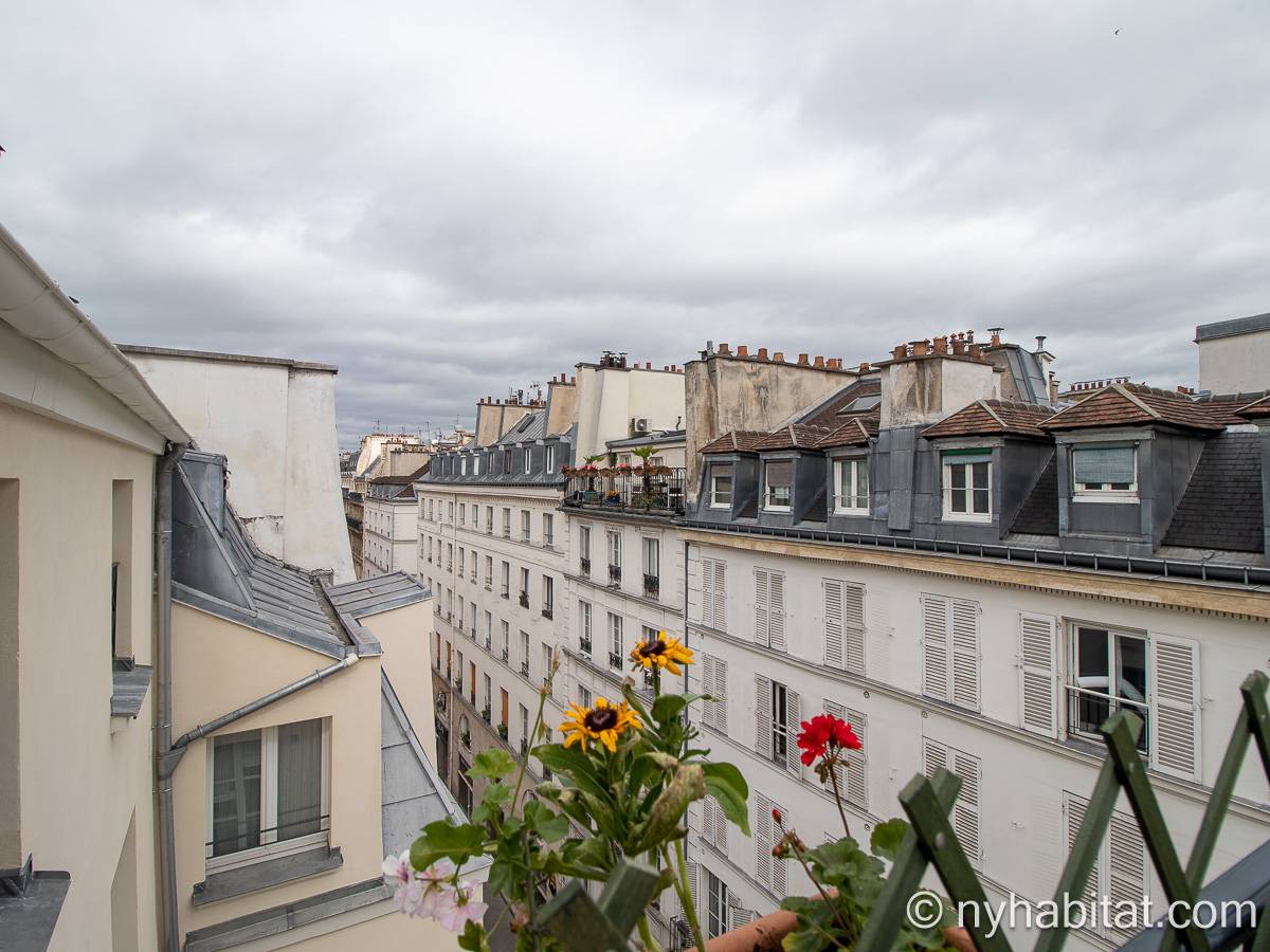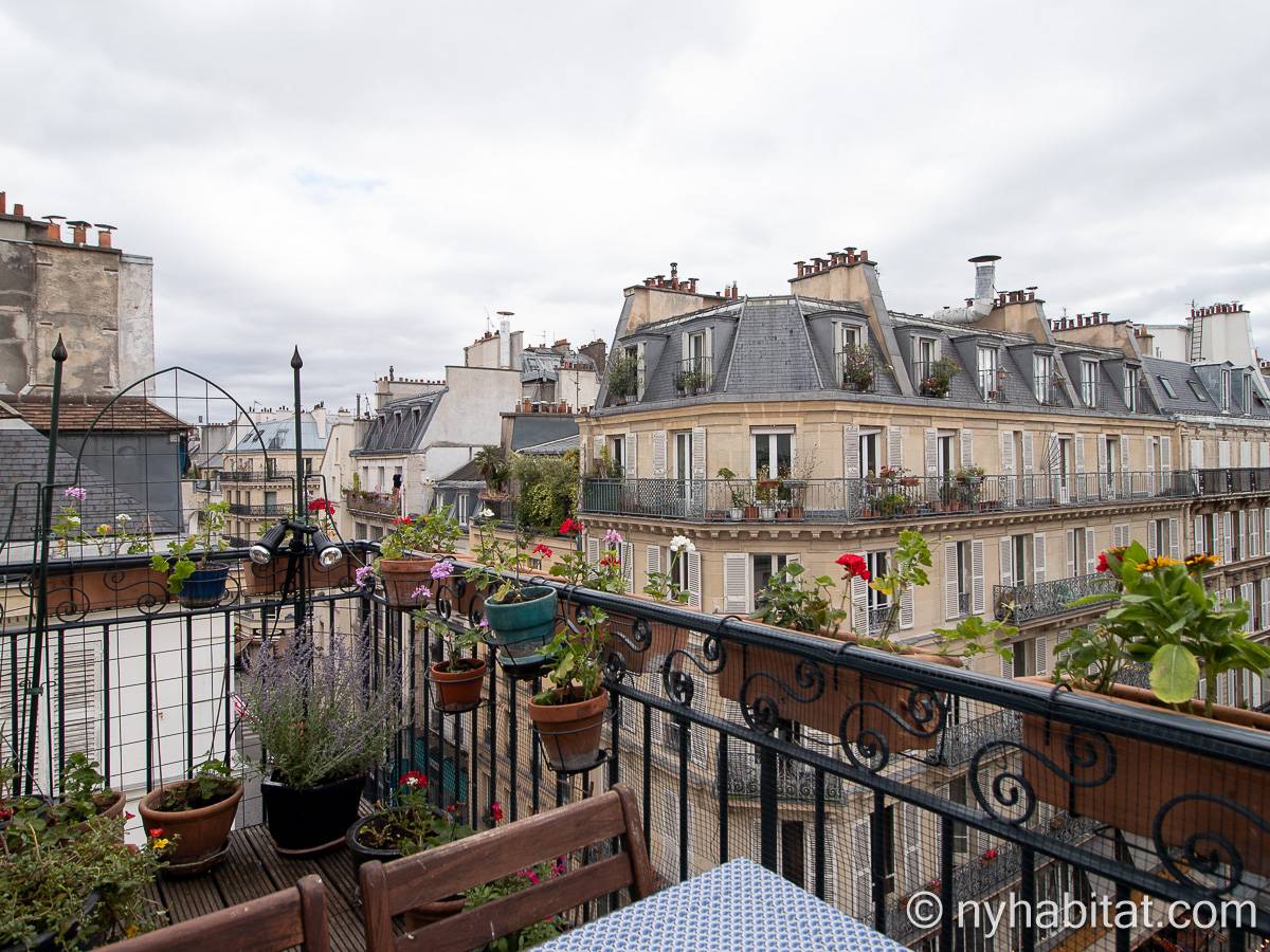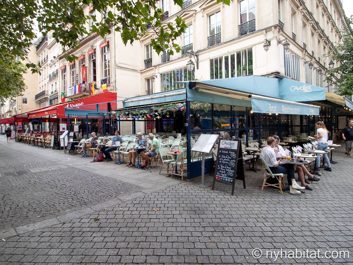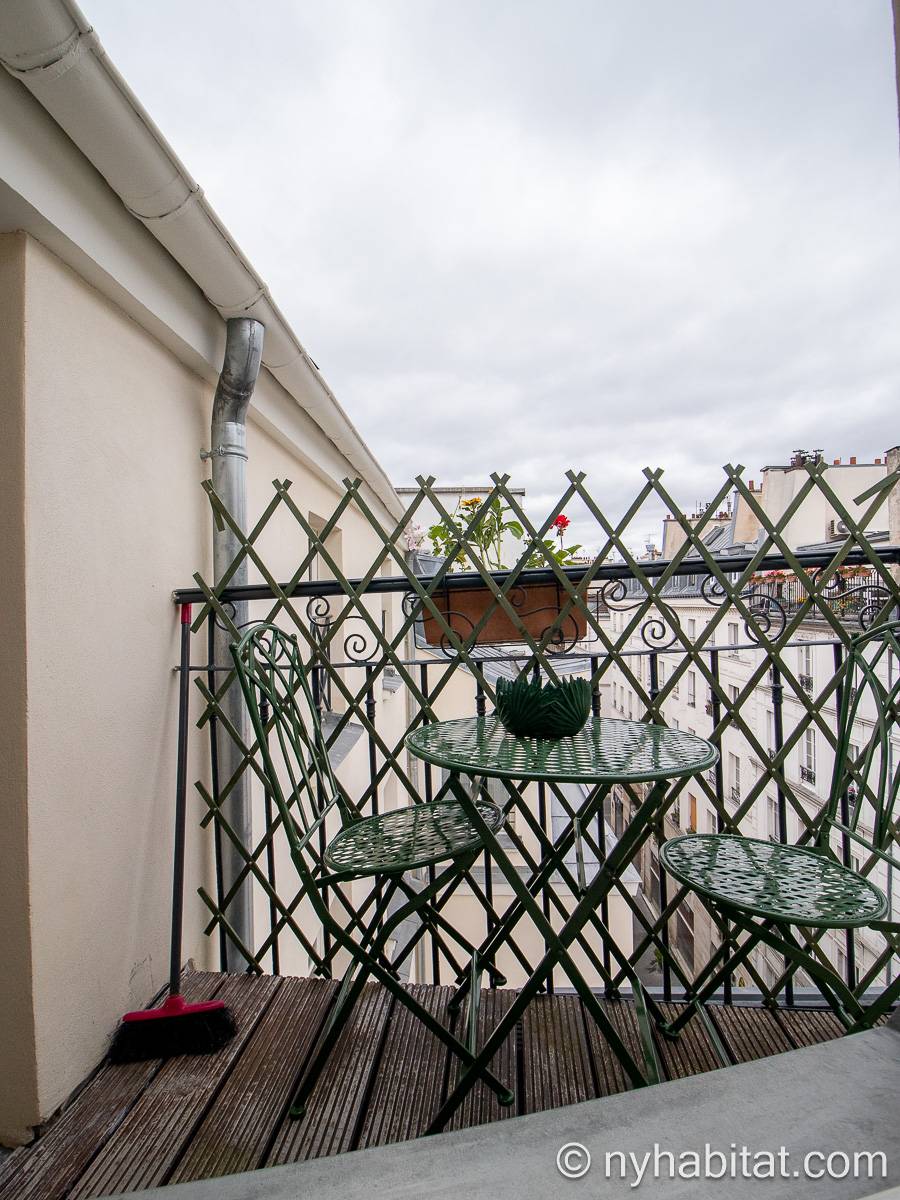 Die schönen Balkonen mit Topfblumen und immergrünen Pflanzen haben einen Blick auf die unten liegende Fußgängerzone. Die größere hat einen Terrassentisch aus Holz, vier dazu passende Stühle und einen Sonnenschirm; sie hat einen Ausblick auf das kunstvolle Dach und die Türme der Kirche Saint-Leu-Saint-Gilles, die sich gleich auf der anderen Straßenseite befindet. Die kleinere Terrasse bietet eine hübsche Aussicht auf benachbarte Gebäude mit typischen Pariser Dächern. Die Decken sind mit freiliegenden Balken ausgekleidet, die sehr gut zu den Hartholzfußböden und den Holzmöbeln passen. Der Wohnbereich ist mit einem Doppelbett und einem einzigartigen Zweiersofa aus Holz ausgestattet und zur Küche hin offen. Zusätzlich zur Frühstückstheke hat die Küche eine ordentliche Arbeitsfläche und drei Barhocker, die aus Schmiedeeisen und Leder gefertigt sind. Sie ist mit den üblichen Kochgeräten und -utensilien ausgestattet. Es gibt außerdem einen Fernseher mit Kabelanschluss, eine Stereoanlage, ein Telefon, kabellosen Internetanschluss und eine Waschmaschinen-Trockner Kombination. Flügeltüren aus edlem antikem Holz führen ins Badezimmer, das mit marokkanischen Terrakottafliesen ausgelegt ist. Im Badezimmer gibt es eine Badewanne mit einem abnehmbaren Duschkopf, einen großen Spiegel unter einer integrierten Beleuchtung, einen Schrank unter einem weißen Waschbecken und eine Toilette. Abgesehen von seinem reizenden Inneren ist das Beste an dieser Studiowohnung definitiv seine praktische Lage!