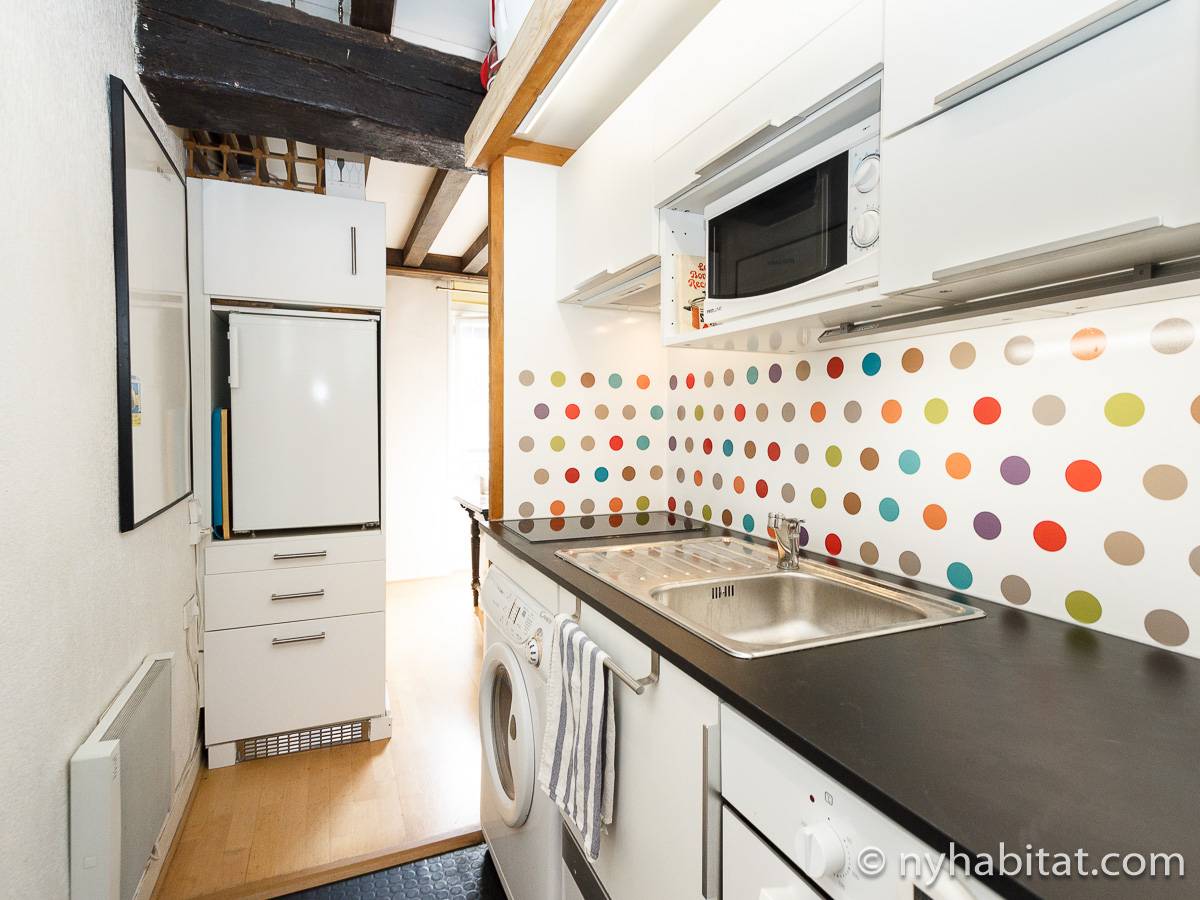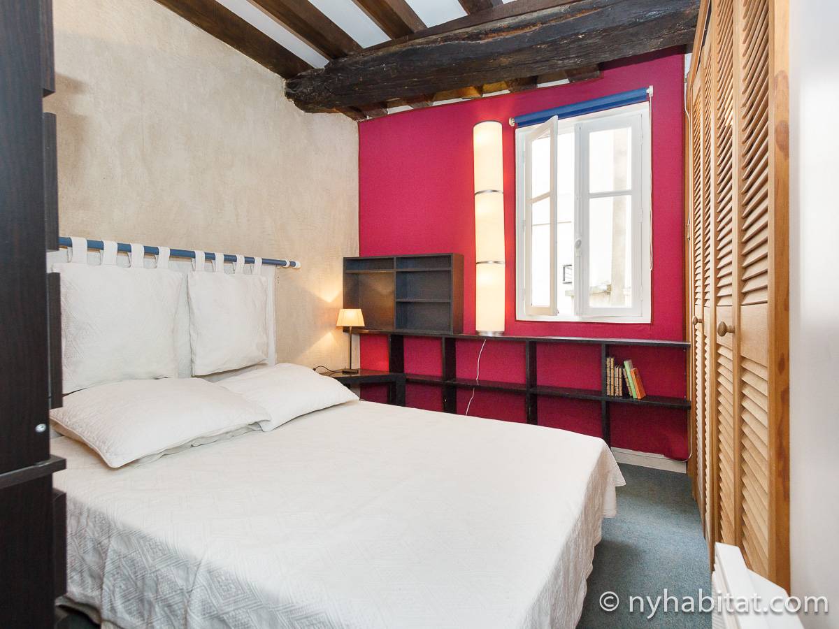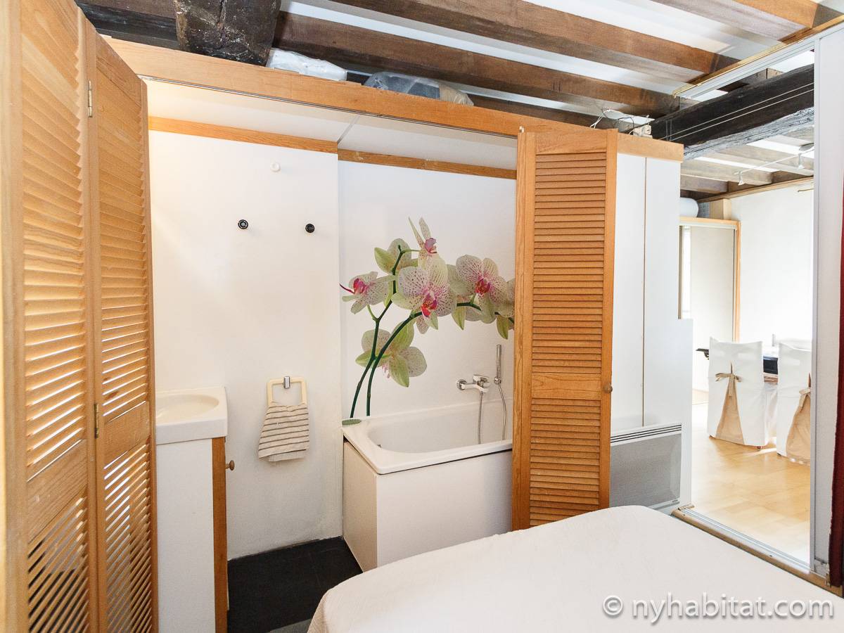 Die Pariser Atmosphäre reicht bis in diese 2-Zimmer-Wohnung mit freiliegenden Holzbalken und einer zeitgenössischen Einrichtung. Das Wohnzimmer besitzt zwei Fenster, die das Sonnenlicht hereinlassen, und ein Sofa, welches auf den Flachbildfernseher ausgerichtet ist. Von hier haben Sie eine schöne östliche Aussicht auf die Pariser Architektur und die Straße und überblicken den Innenhof auf der westlichen Seite. Der Esstisch bietet Ihnen genügend Platz, um gemütlich allein oder mit Gästen zu essen. Die Küche ist ausgestattet mit weißen Küchengeräten und Schränken, wird jedoch durch gepunktete Spiegelfliesen farblich akzentuiert. Die Kücheneinrichtung, bestehend aus Kühl-/Gefrierschrank, Mikrowelle, Backofen und Spülmaschine, ermöglicht es Ihnen Ihre Mahlzeiten ganz einfach zuhause zu zubereiten. Das Schlafzimmer liegt separat hinter den Schiebetüren im Wohnzimmer. Es ist möbliert mit einem Doppelbett mit Bettwäsche. Ein Waschraum liegt etwas versteckt hinter einer hölzernen Falttür und versorgt Sie mit einer Badewanne und Handtüchern. Die Toilette liegt separat und ist über die Küche begehbar.