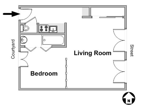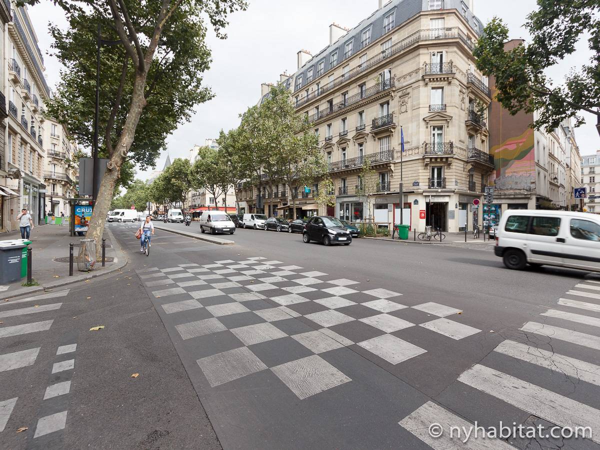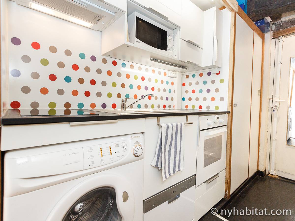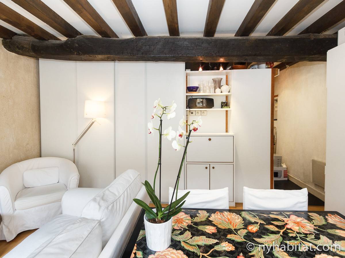 Die Pariser Atmosphäre reicht bis in diese 2-Zimmer-Wohnung mit freiliegenden Holzbalken und einer zeitgenössischen Einrichtung. Das Wohnzimmer besitzt zwei Fenster, die das Sonnenlicht hereinlassen, und ein Sofa, welches auf den Flachbildfernseher ausgerichtet ist. Von hier haben Sie eine schöne östliche Aussicht auf die Pariser Architektur und die Straße und überblicken den Innenhof auf der westlichen Seite. Der Esstisch bietet Ihnen genügend Platz, um gemütlich allein oder mit Gästen zu essen. Die Küche ist ausgestattet mit weißen Küchengeräten und Schränken, wird jedoch durch gepunktete Spiegelfliesen farblich akzentuiert. Die Kücheneinrichtung, bestehend aus Kühl-/Gefrierschrank, Mikrowelle, Backofen und Spülmaschine, ermöglicht es Ihnen Ihre Mahlzeiten ganz einfach zuhause zu zubereiten. Das Schlafzimmer liegt separat hinter den Schiebetüren im Wohnzimmer. Es ist möbliert mit einem Doppelbett mit Bettwäsche. Ein Waschraum liegt etwas versteckt hinter einer hölzernen Falttür und versorgt Sie mit einer Badewanne und Handtüchern. Die Toilette liegt separat und ist über die Küche begehbar.