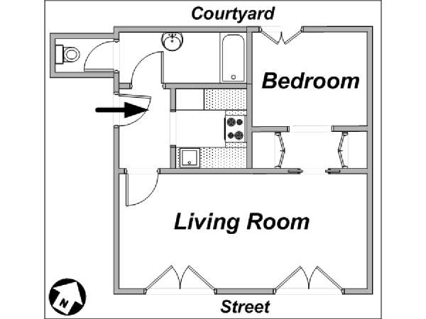 Diese 40 m² große 2-Zimmer-Wohnung befindet sich im ersten Stock eines aus dem achtzehnten Jahrhundert stammenden Gebäudes ohne Fahrstuhl, und liegt im Stadtteil Saint-Germain Des Pres, welches im sechsten Arrondissement (Stadtbezirk) von Paris zu finden ist. Der Haupteingang ist gesichert mit einem Zugangscode Sicherheitssystem, das durch einen Korridor in das Treppenhaus führt. Das Erdgeschoss wird gewerblich genutzt. Ihre Wohnung bietet ihnen sowohl eine Südost, als auch eine Nordwest Aussicht über die Straße und den Innenhof.