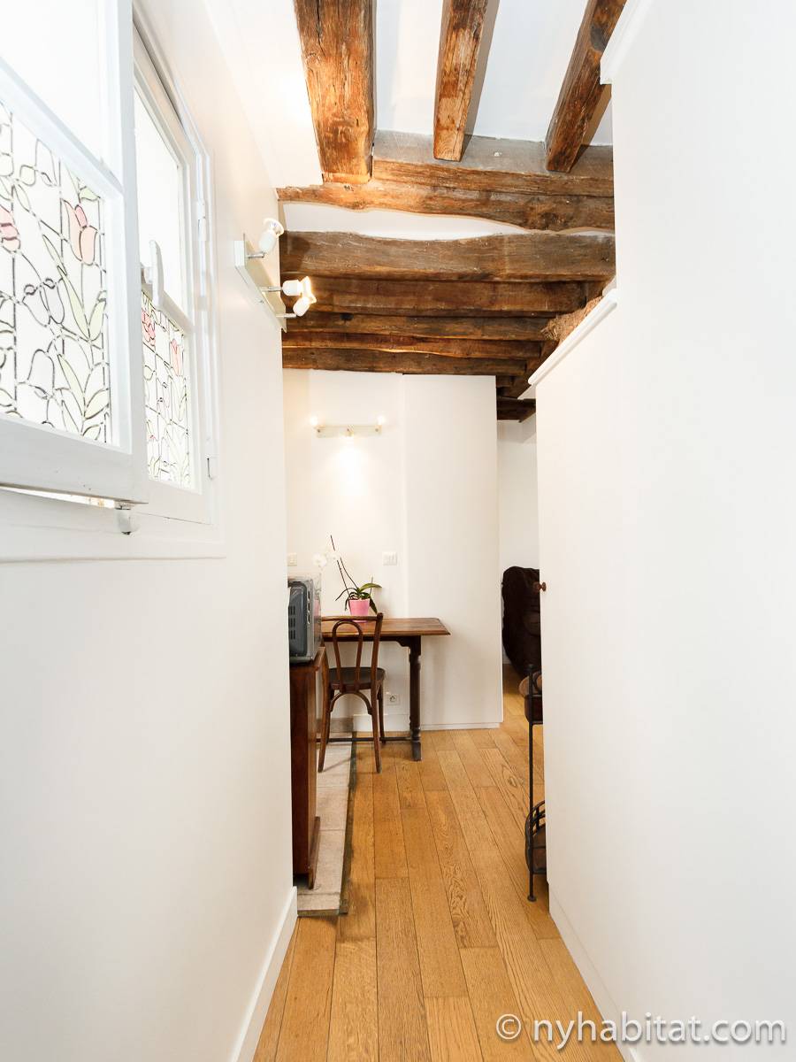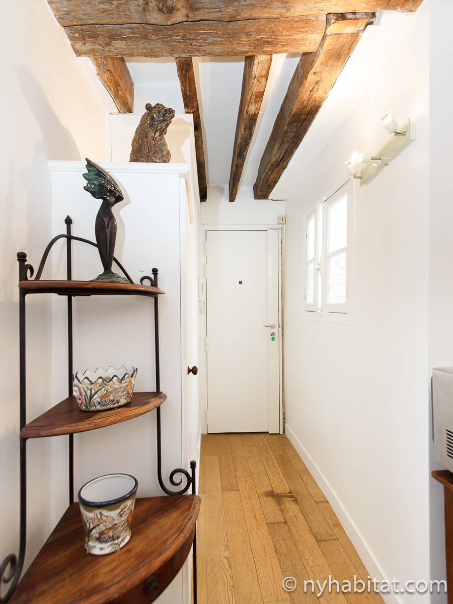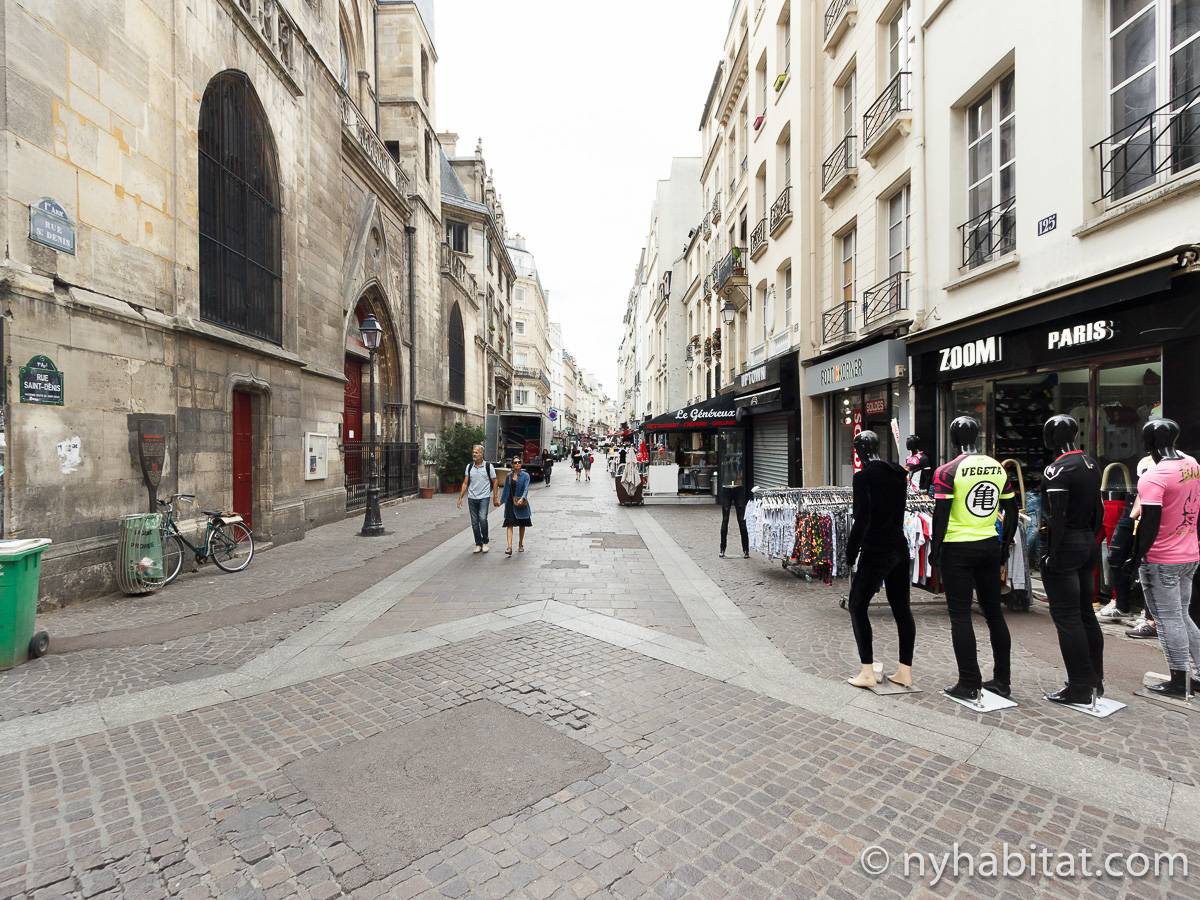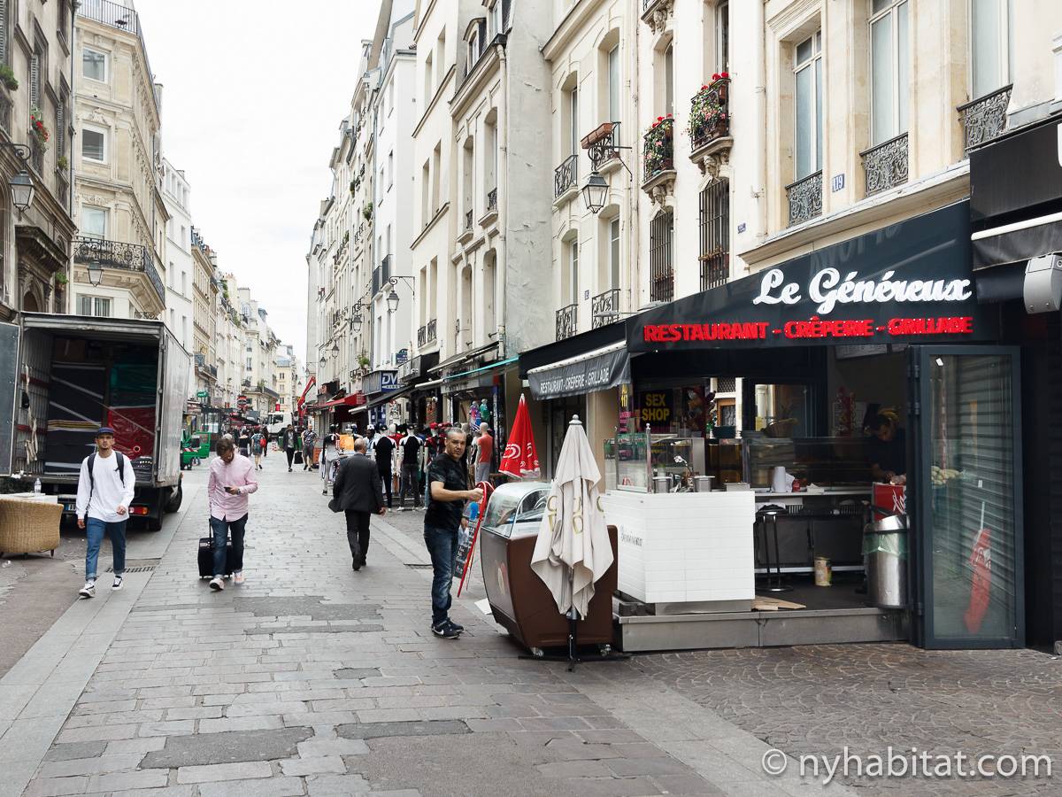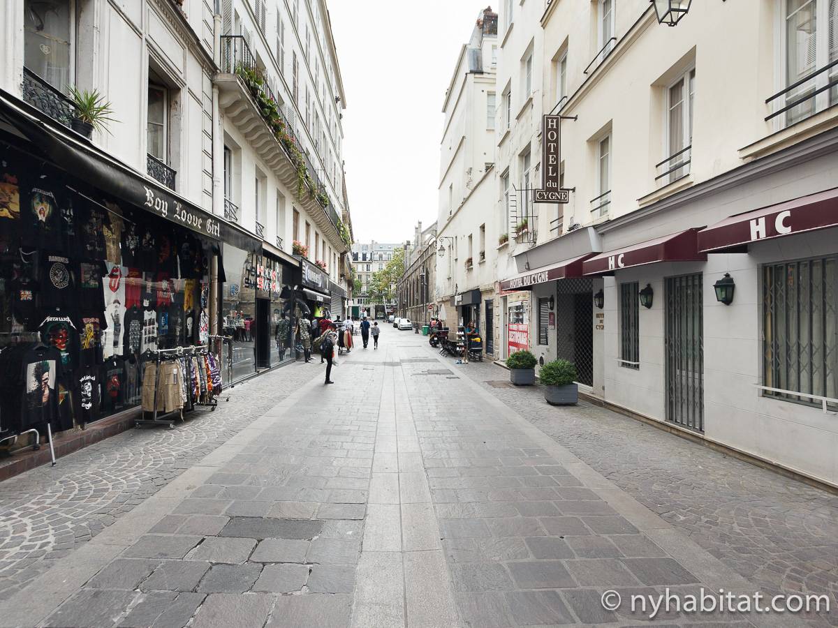 Diese Studiowohnung befindet sich in der Rue du Cygne, zwischen der Rue Saint Denis und der Rue Pierre Lescot, im Herzen von Châtelet, einer lebhaften Gegend im 1. Arrondissement von Paris. Diese komplett möblierte Mietwohnung liegt zur Straße hin (Richtung Süden) im fünften Stock eines fünfstöckigen Gebäudes ohne Aufzug, das durch einen Sicherheitscode an der Eingangstür gesichert ist.