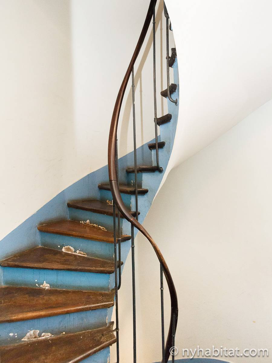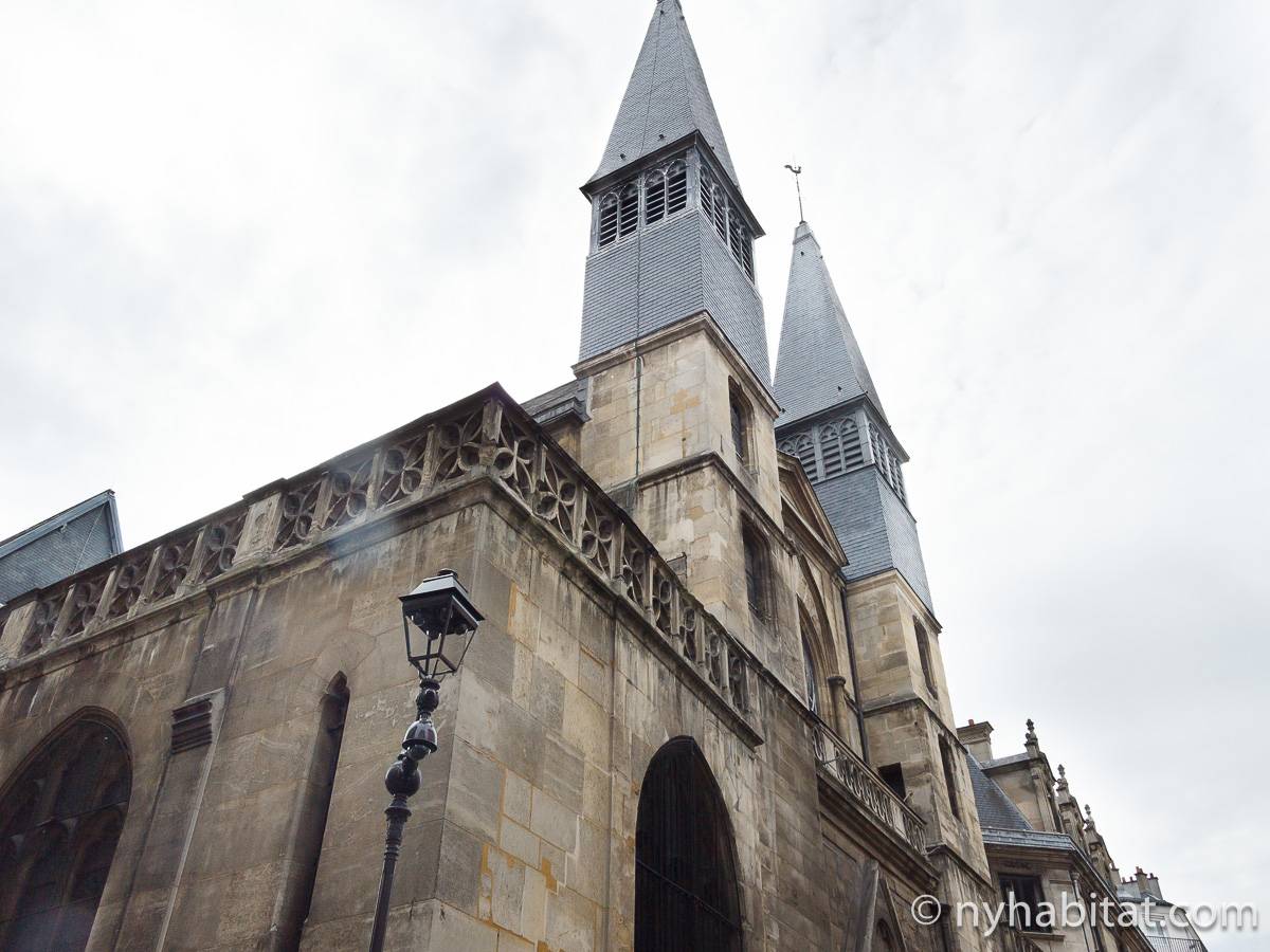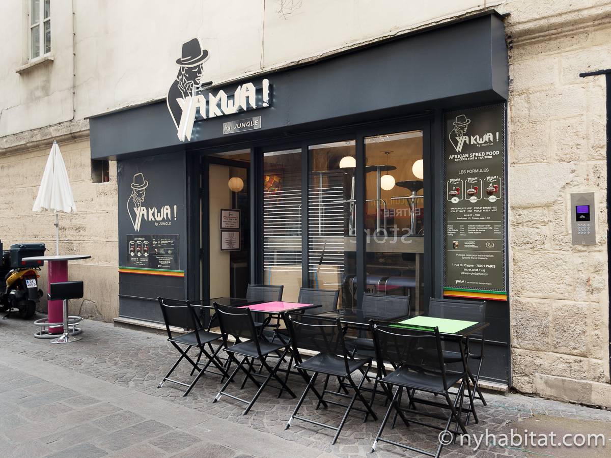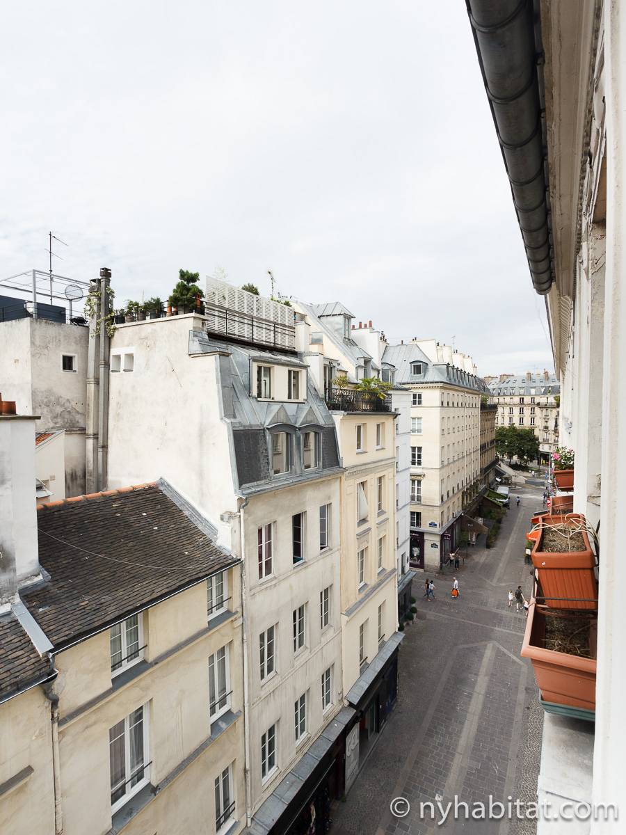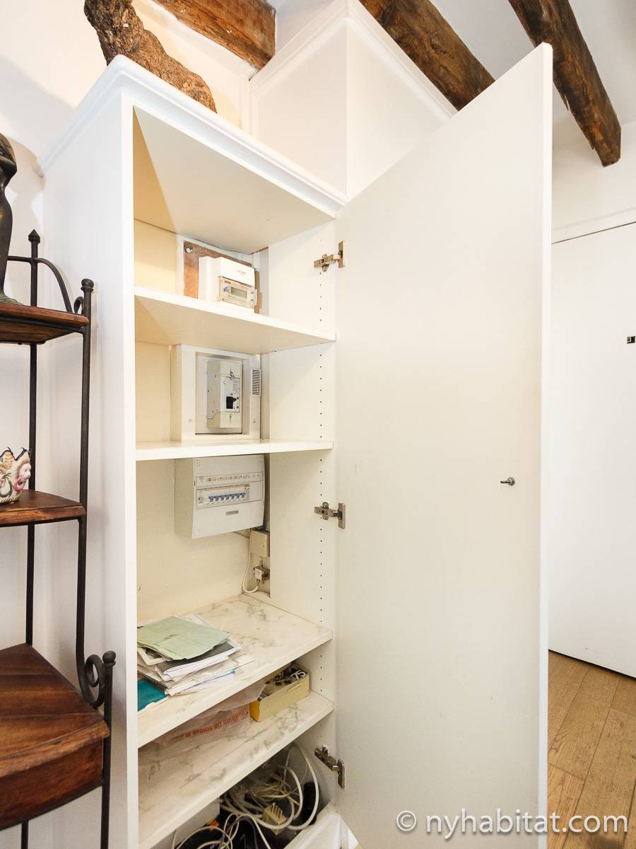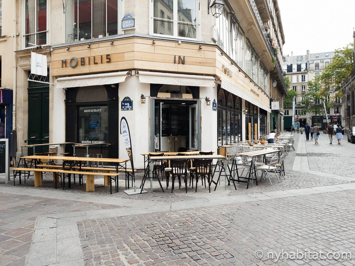 Diese Studiowohnung befindet sich in der Rue du Cygne, zwischen der Rue Saint Denis und der Rue Pierre Lescot, im Herzen von Châtelet, einer lebhaften Gegend im 1. Arrondissement von Paris. Diese komplett möblierte Mietwohnung liegt zur Straße hin (Richtung Süden) im fünften Stock eines fünfstöckigen Gebäudes ohne Aufzug, das durch einen Sicherheitscode an der Eingangstür gesichert ist.