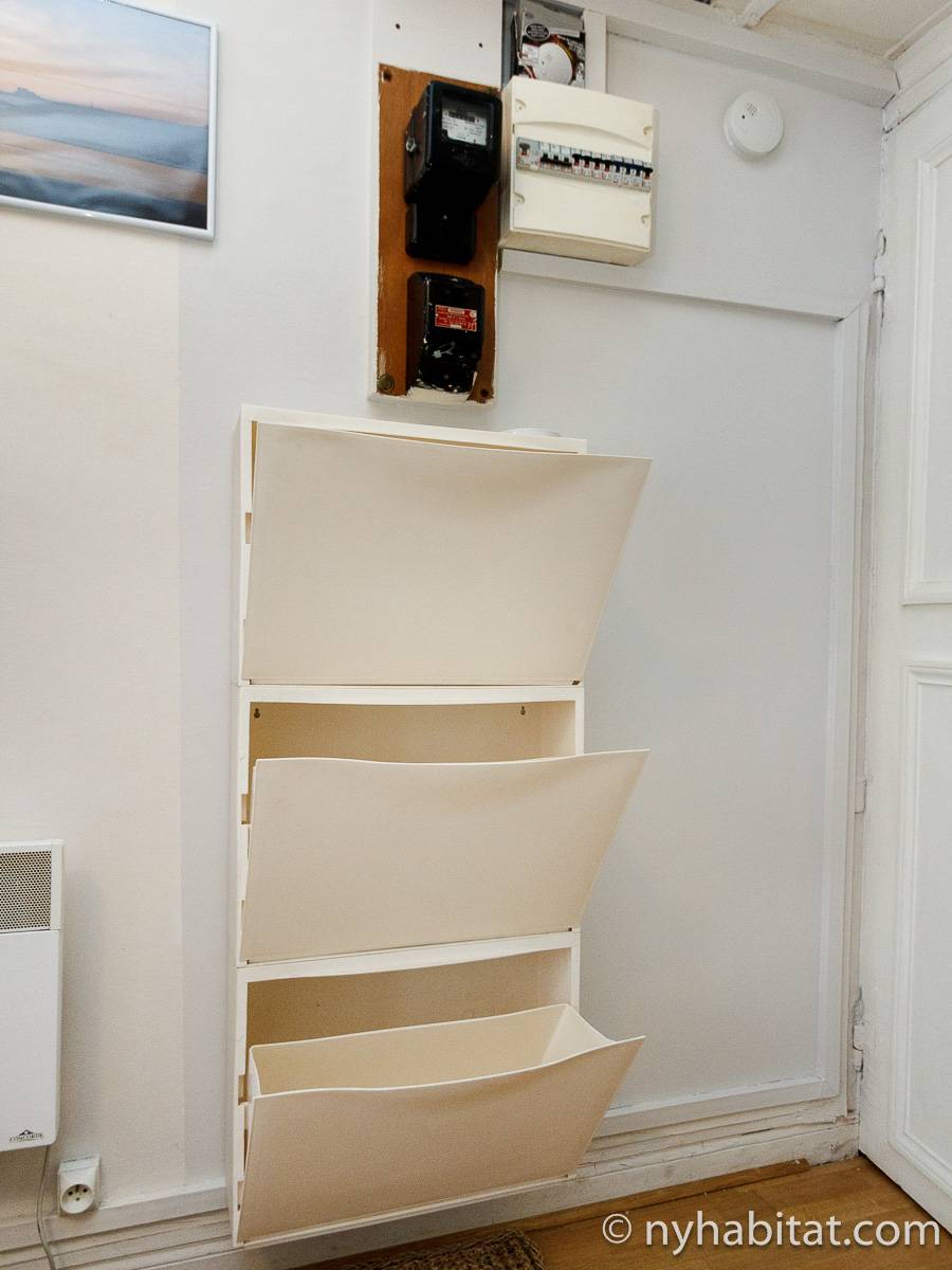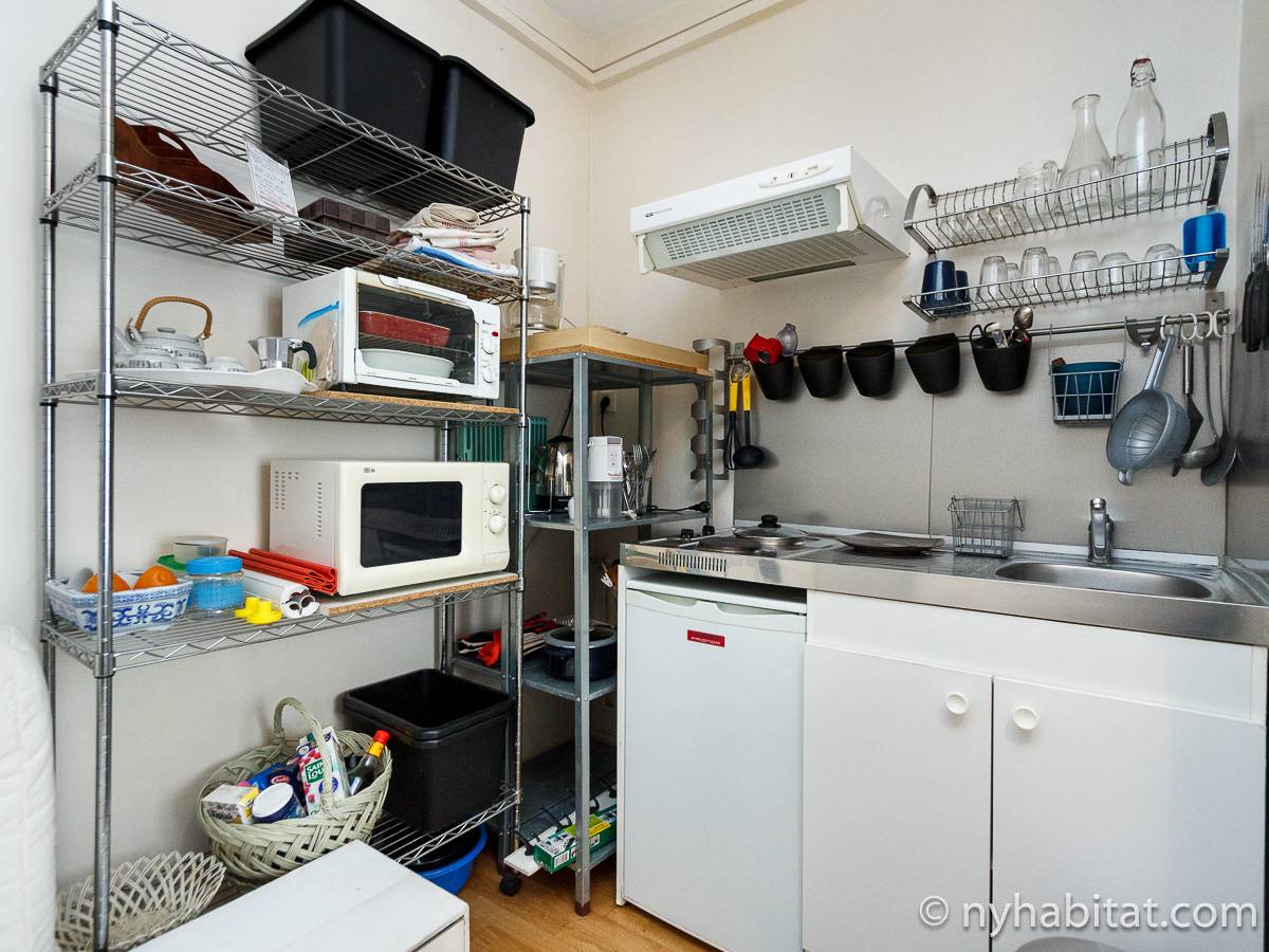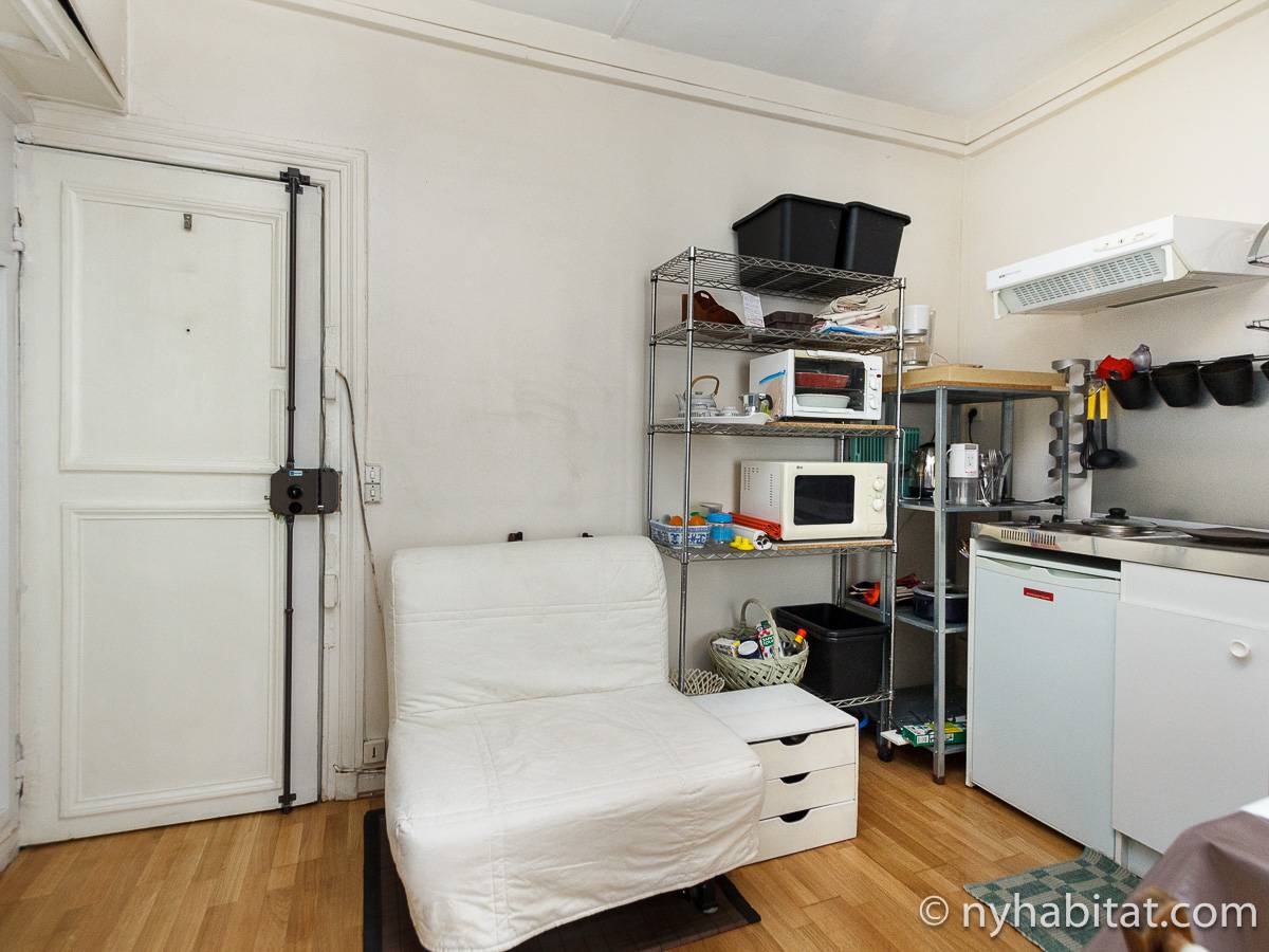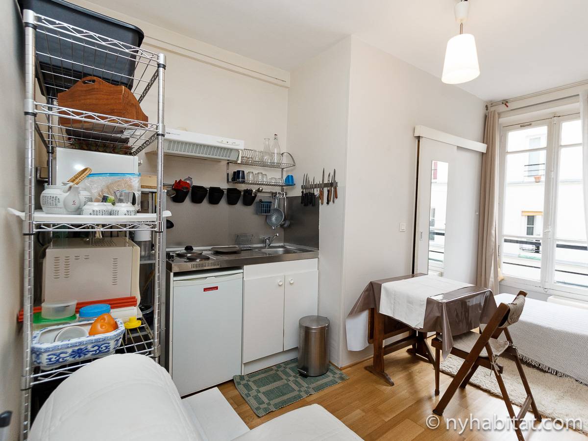 Das Interieur dieser Pariser Studiowohnung ist in einem eklektischen Stil gehalten und verfügt über viele charmante Hingucker. Im Hauptwohnraum der Wohnung befinden sich zwei Einzelbettsofas, ein Esstisch und zahlreiche Verstaumöglichkeiten. Wenn Sie lieber zuhause kochen, stehen Ihnen dafür ein Backofen, ein Kühlschrank, ein Toaster und eine Kaffeemaschine zur Verfügung.