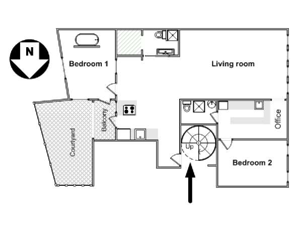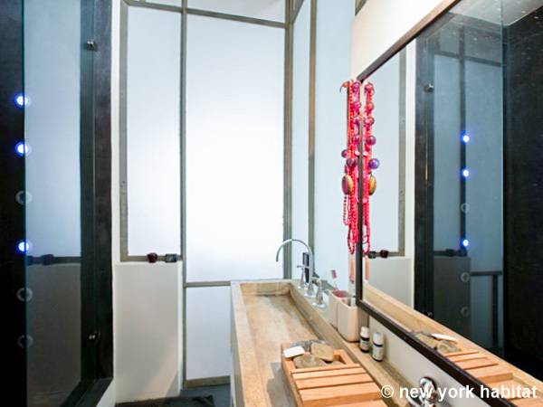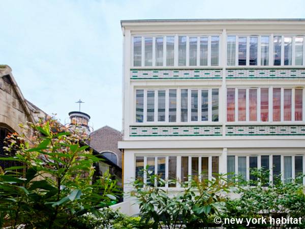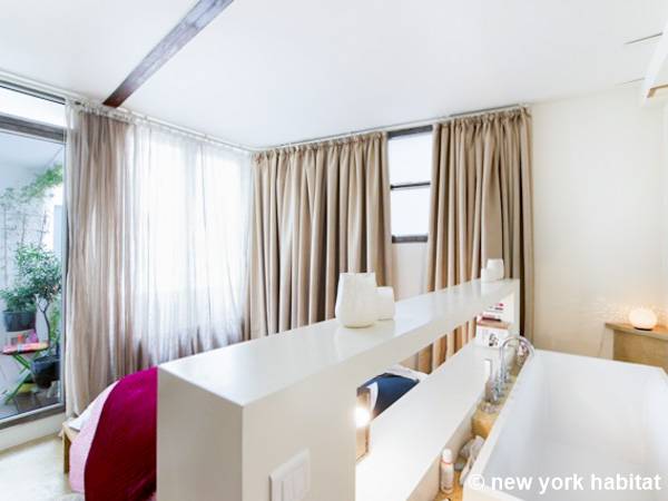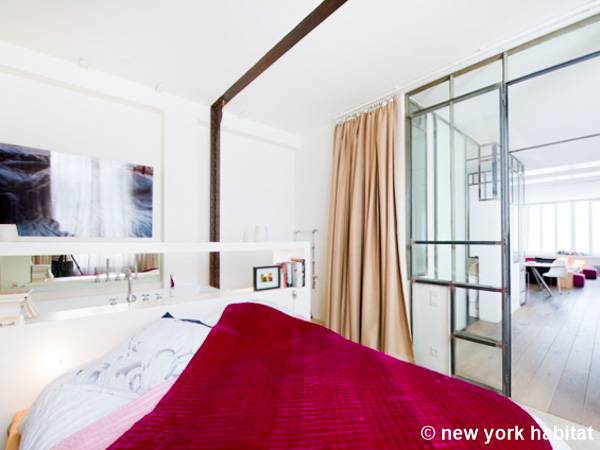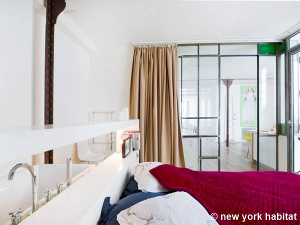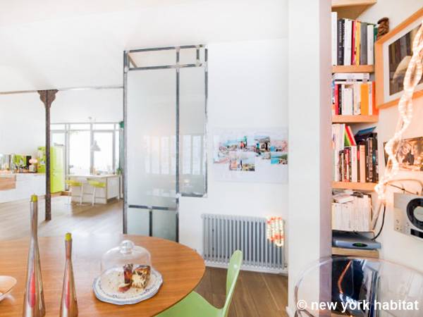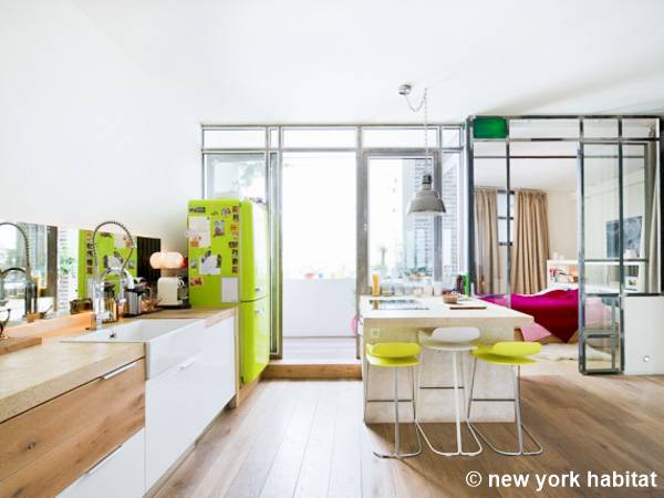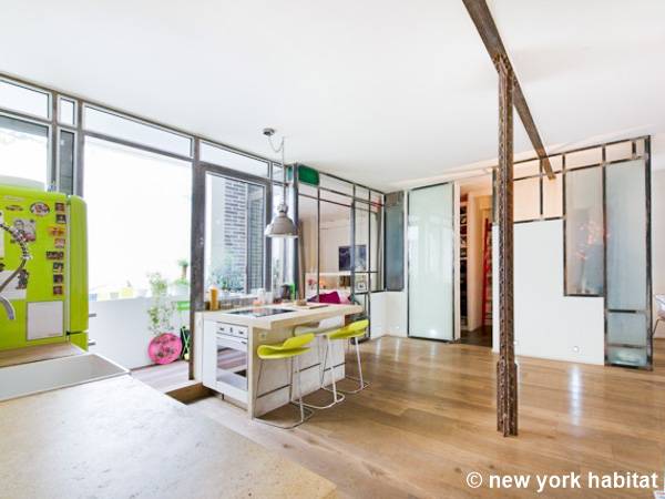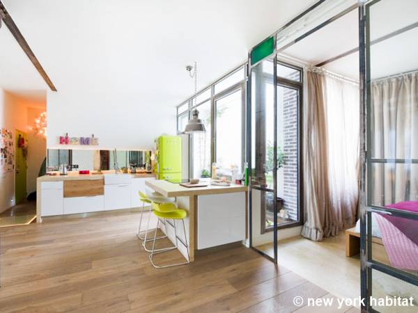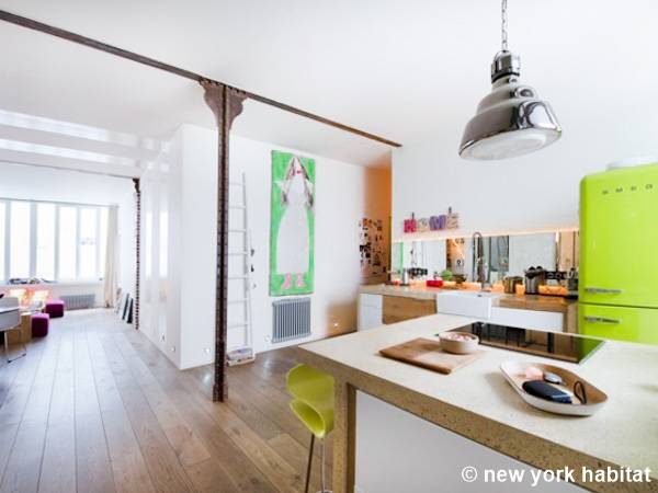 Diese Pariser Loft-Wohnung umfasst ca. 130 m² und besitzt eine Fensterwand und Schiebeglastüren, die zu einem privaten Balkon führen und die elegante Einrichtung mit natürlichem Licht beleuchten. Hartholzfußboden, eine Andeutung von freiliegendem Backstein in den Wohnzimmerwänden, hohe Decken und Wände aus klarem Fensterglas sorgen für eine ultramoderne Umgebung. Ausstattungsmerkmale umfassen eine Waschmaschine und Trockner, ein stilvolles Sofa mit bunten, dekorativen Kissen und einen runden Esstisch aus Holz. Die offene Küche ist komplett ausgestattet mit allen grundlegenden Kochutensilien und bietet sogar einen Geschirrspüler für eine einfache Reinigung. Es gibt eine Bar/Küchenarbeitsfläche mit zwei limettengrünen Hockern in einer Ecke, perfekt zum Essen oder Vorbereiten von Mahlzeiten. Beide Schlafzimmer stellen jeweils ein Doppelbett bereit. Der Balkon ist hofseitig ausgerichtet.