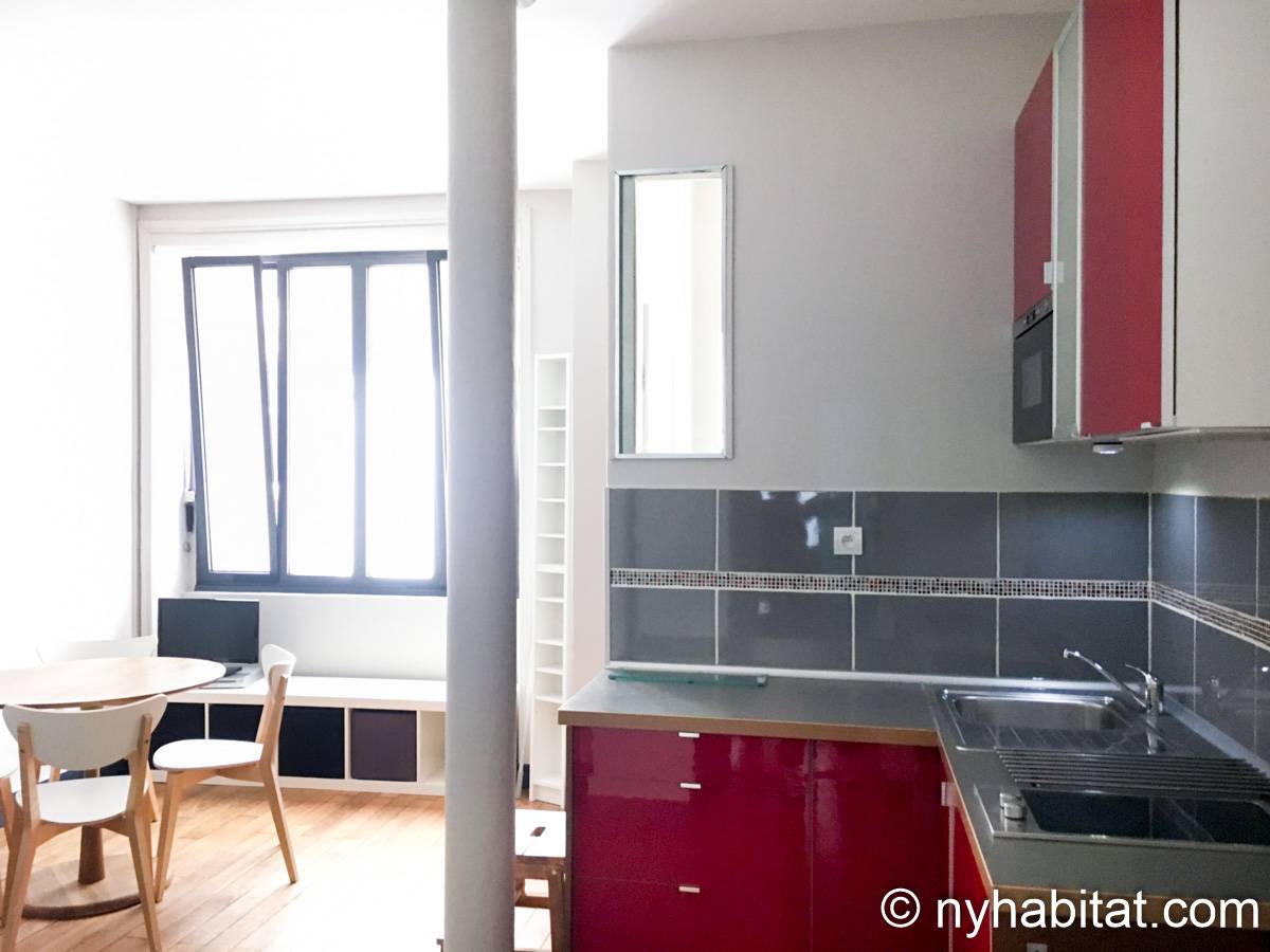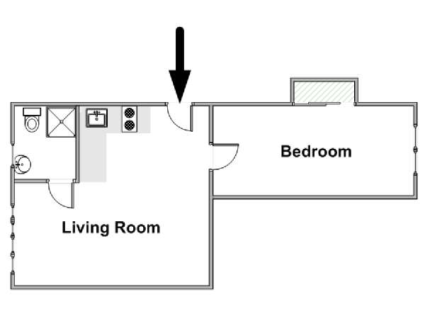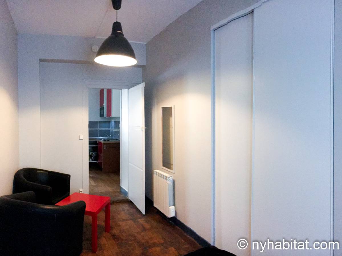 Diese 32 m² große Mietwohnung verfügt über einen offen gestalteten Wohn- und Küchenbereich. Der Hauptraum besticht mit Parkettboden, einem Sofa und einem Essbereich. Die offene Küche bietet einen Kühlschrank und eine Mikrowelle. Das Schlafzimmer verfügt über ein Doppelbett und das Badezimmer über eine Dusche. Die Wohnung befindet sich im Erdgeschoss eines Gebäudes mit Sicherheitssystem.