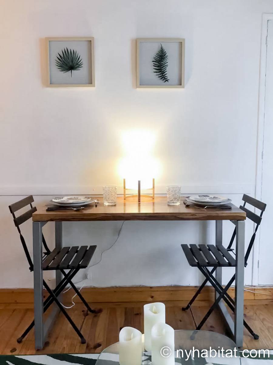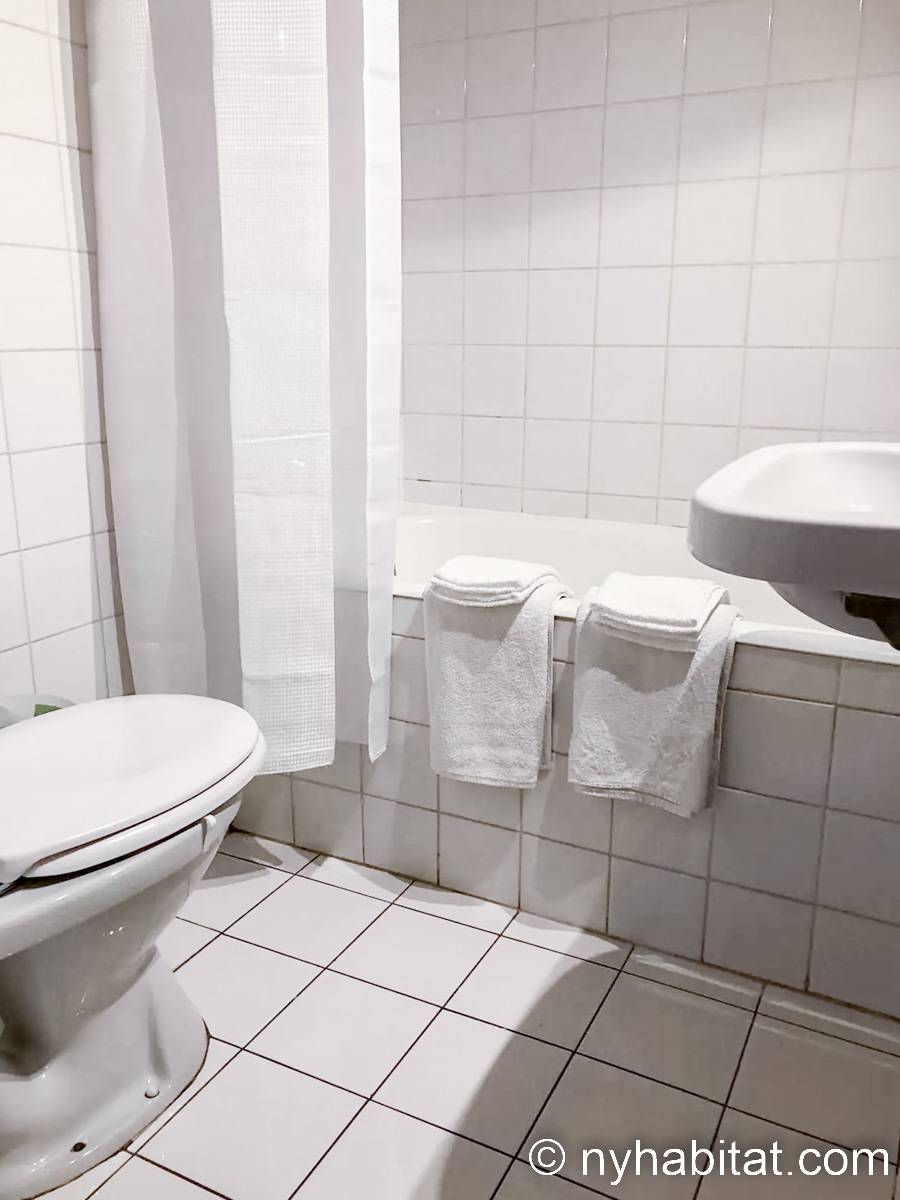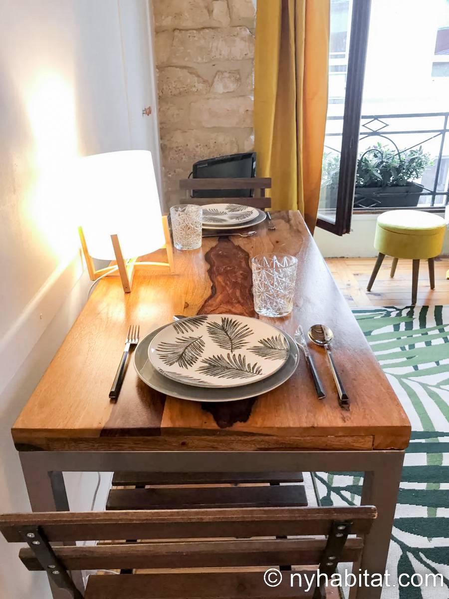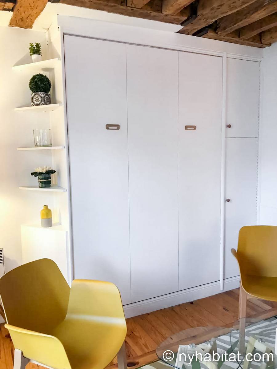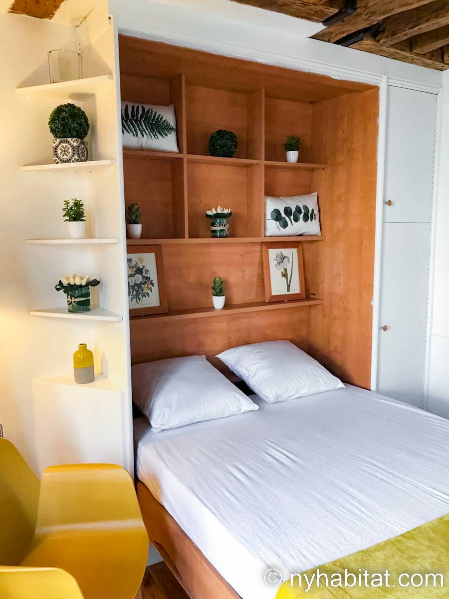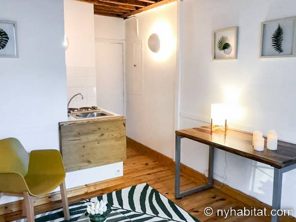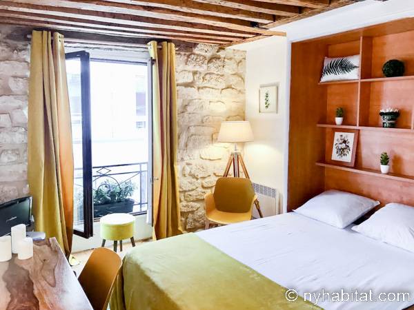 Diese Studiowohnung besitzt Hartholzfußböden, freigelegte Deckenbalken und klassische Möbel. Für das Doppelbett wird frische Bettwäsche bereitgestellt. Zu den weiteren Highlights dieser Wohnung zählen ein Schreibtisch aus Holz mit Stuhl, welcher auch als Esstisch genutzt werden kann, und ein Fenster, das auf die schmale Pariser Straße hinausblickt. Dazu gibt es zusätzliche Stühle, einen orientalischen Teppich und verschiedene Bilder an der Wand. Platz zur Aufbewahrung von Kleidung ist ebenfalls vorhanden.