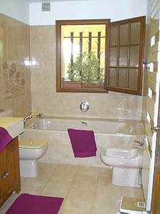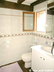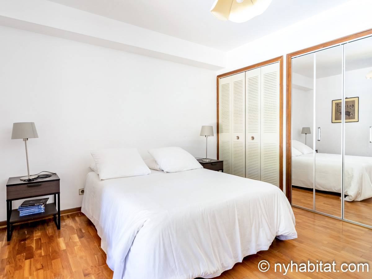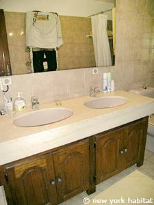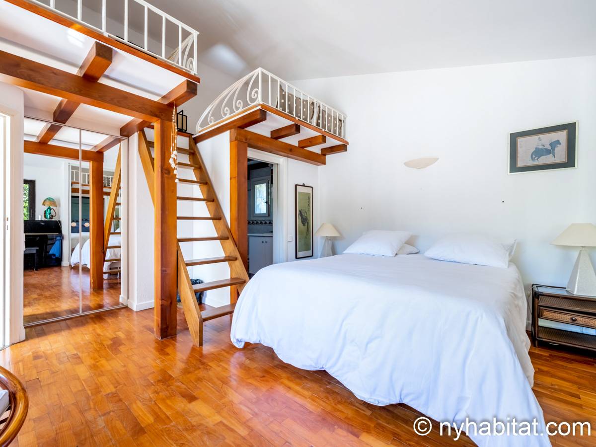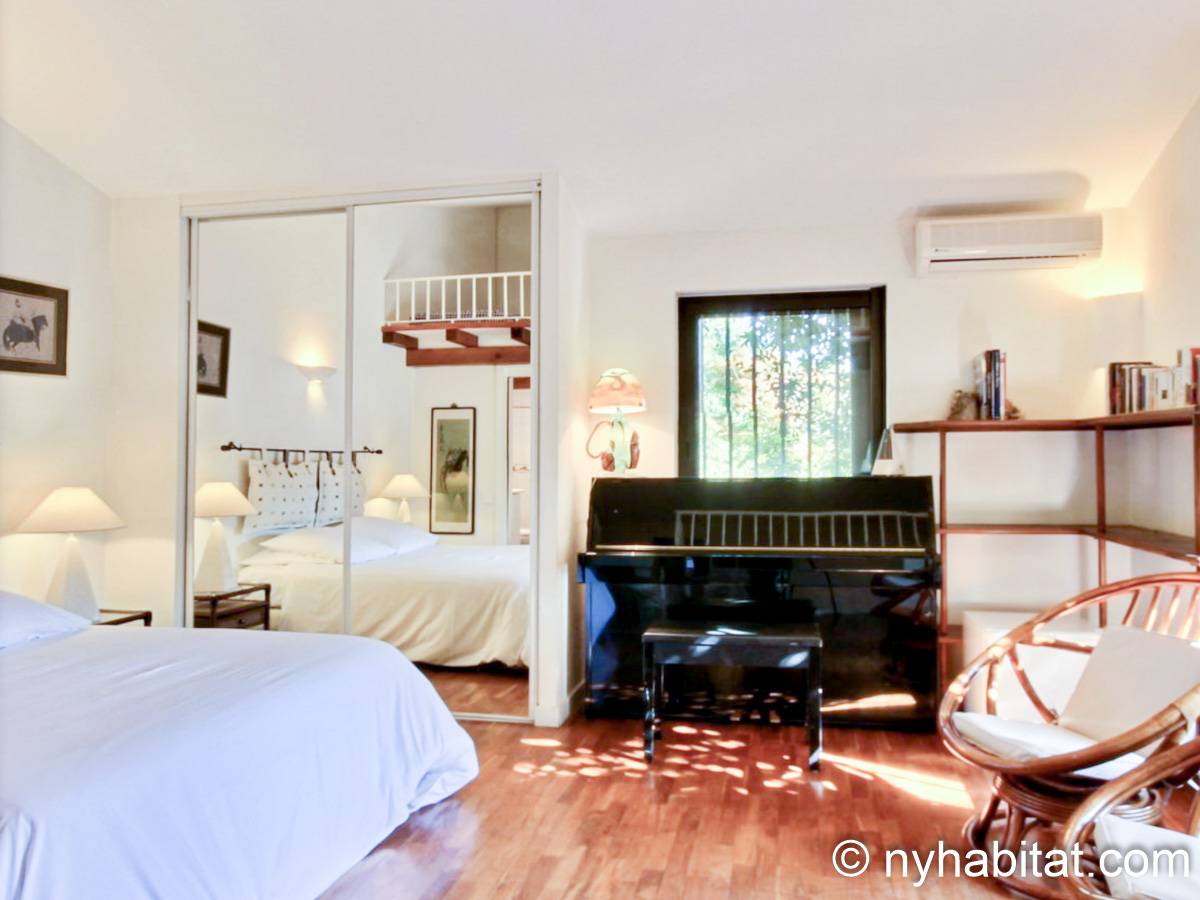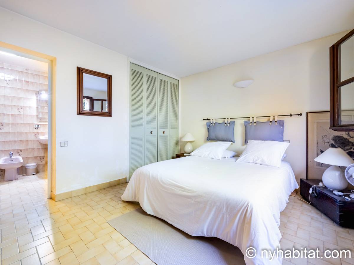 - Das Mimosa-Zimmer (Schlafzimmer 1 auf den Fotos) verfügt über ein nach Süden ausgerichtetes französisches Fenster, das auf eine kleine Terrasse führt, sowie ein nach Westen ausgerichtetes Fenster und Parkettboden. Dieses Zimmer bietet ein Doppelbett, einen Massagesessel, einen Minikühlschrank, eine Klimaanlage und einen Kleiderschrank. Das mit Schlafzimmer 4 geteilte Badezimmer verfügt über ein Doppelwaschbecken und eine Badewanne.