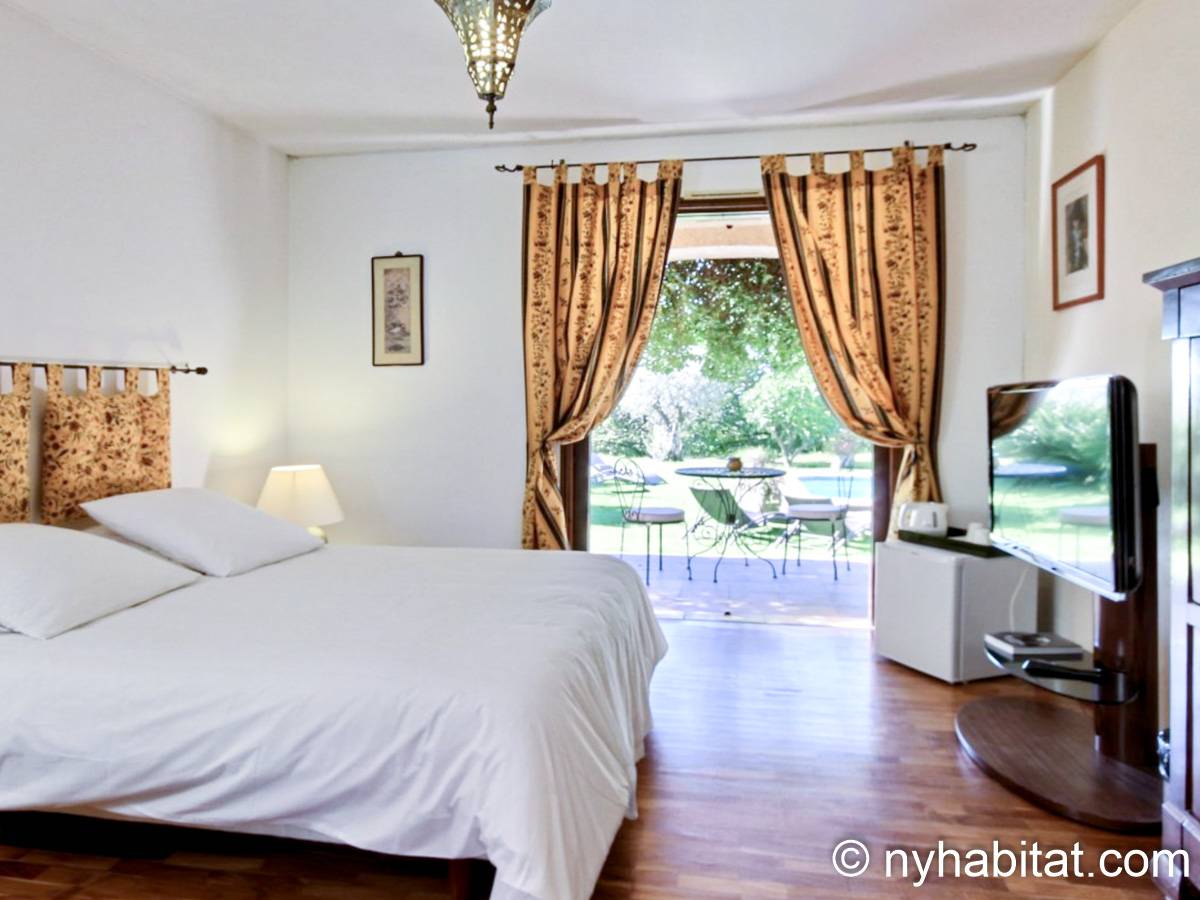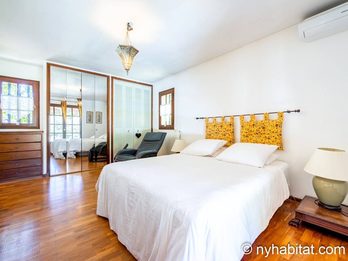 - Das Olivier-Zimmer (Schlafzimmer 4) verfügt über eine Klimaanlage sowie eine Glastür, die natürliches Licht in den Raum lässt. Das Bett hier ist ein Doppelbett. Dieses Zimmer besitzt auch einen Kleiderschrank und teilt sich ein Badezimmer mit Schlafzimmer 1, verfügt jedoch über eine eigene Toilette.