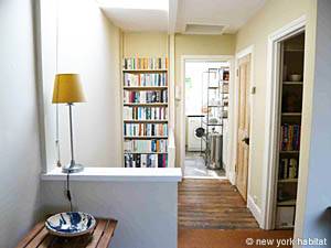 Dans le couloir, vous trouverez un débarras contenant un aspirateur, un fer et une planche à repasser entre autres matériels. Cet appartement est chauffé au gaz central.