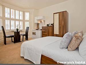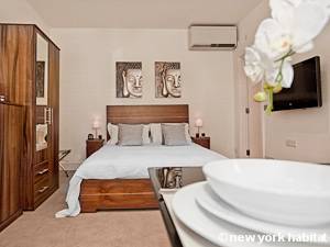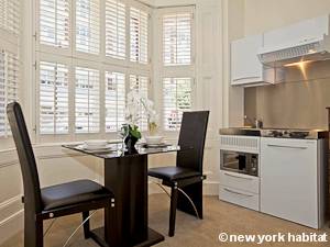 Ce studio T1 est entièrement équipé avec une télévision HD 32" et une station iPod pour vos loisirs. La lumineuse salle de bain en marbre dispose d’une cabine de douche ainsi que de serviettes pour votre séjour. De grandes fenêtres laissent pénétrer la lumière naturelle dans l’appartement ; et l’espace salle à manger pour deux personnes complète parfaitement la kitchenette haut-de-gamme qui vous permet de préparer vos propres repas après vous être aventuré à Londres. La location de vacances dispose également d’un coffre de sûreté, pour que vos biens personnels soient en sécurité et à l’abri des regards.