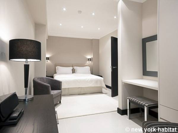 La chambre comprend un lit queen-size et un bureau qui vous permettra de travailler convenablement, ainsi qu’une coiffeuse. Les couleurs blanches, brun clair et noires de la chambre rendent cette pièce élégante et sophistiquée. La fenêtre et la baignoire de la salle de bain de cet appartement sont de véritable plus !