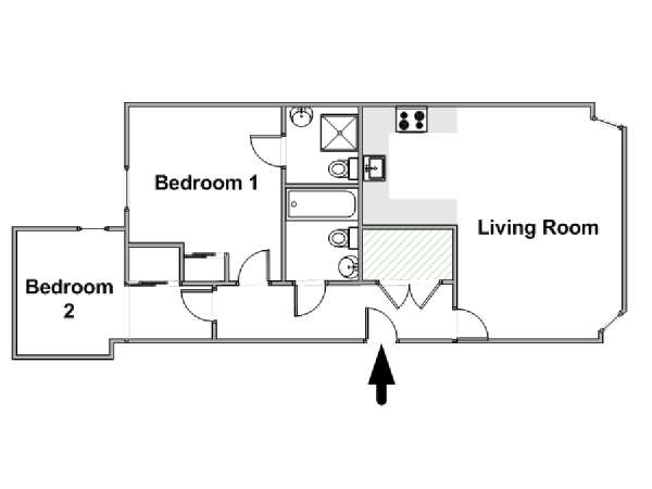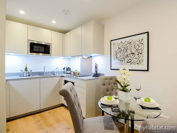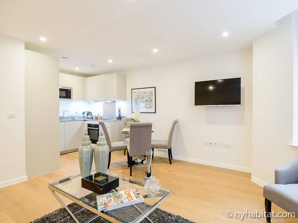 Le salon de cette location saisonnière à Londres comporte un joli bow-window donnant sur la rue ainsi que du mobilier de base tels que la télévision par le câble, un canapé et une table de salle à manger pour quatre personnes située près de la cuisine ouverte. Pour plus de commodité, un lave-vaisselle est également à votre disposition. Les chambres de cet appartement T3, meublées de manière identique, comprennent toutes deux un lit double et la télévision par le câble.