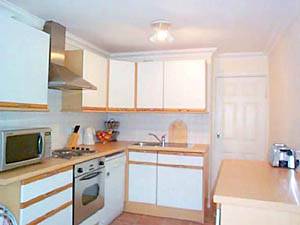 La cuisine séparée est équipée d'éléments modernes en hêtre et peints en blanc avec un lave-vaisselle, un lave-linge séchant, un réfrigérateur, un congélateur, un four, un micro-ondes, une bouilloire et un grille-pain ainsi que de nombreux placards. Elle dispose également d'une table à manger ronde en verre et de ses chaises.