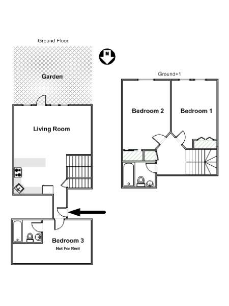C'est au rez-de-chaussée, qui donne accès au jardin, que se trouvent la cuisine commune et le salon ainsi que la chambre du propriétaire, qui a une baignoire privée. La 2ème salle de bain, qui offre le choix d'une baignoire et d'une douche, se trouve au 1er étage et est partagée entre les 2 chambres à cet étage.