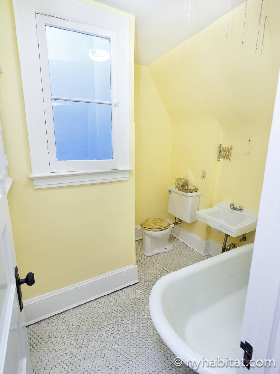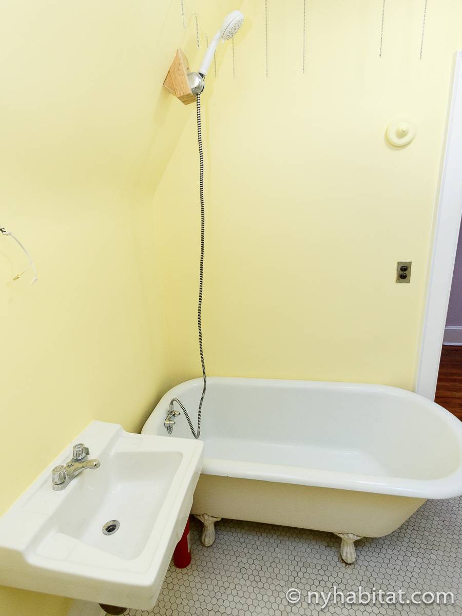 La chambre 1 (votre chambre privée), d’une superficie d’environ 19 m², se trouve au 3ème étage (2ème en Europe). La pièce mansardée est équipée de parquet et de moulures blanches sur des murs peints en bleu. Elle comprend un lit Queen, une chaise de bureau et un canapé anciens, ainsi qu’un placard pour ranger vos affaires. Il y a également un second placard au troisième étage (l’équivalent du deuxième étage en Europe) qui vous est entièrement réservé. Vous disposerez d’une salle de bain privée. Ses murs sont peints en jaune et elle est équipée d’une baignoire ronde ancienne avec un pommeau de douche. Vous profiterez de la lumière du soleil grâce à une fenêtre dans la chambre et une fenêtre de toit dans le couloir.