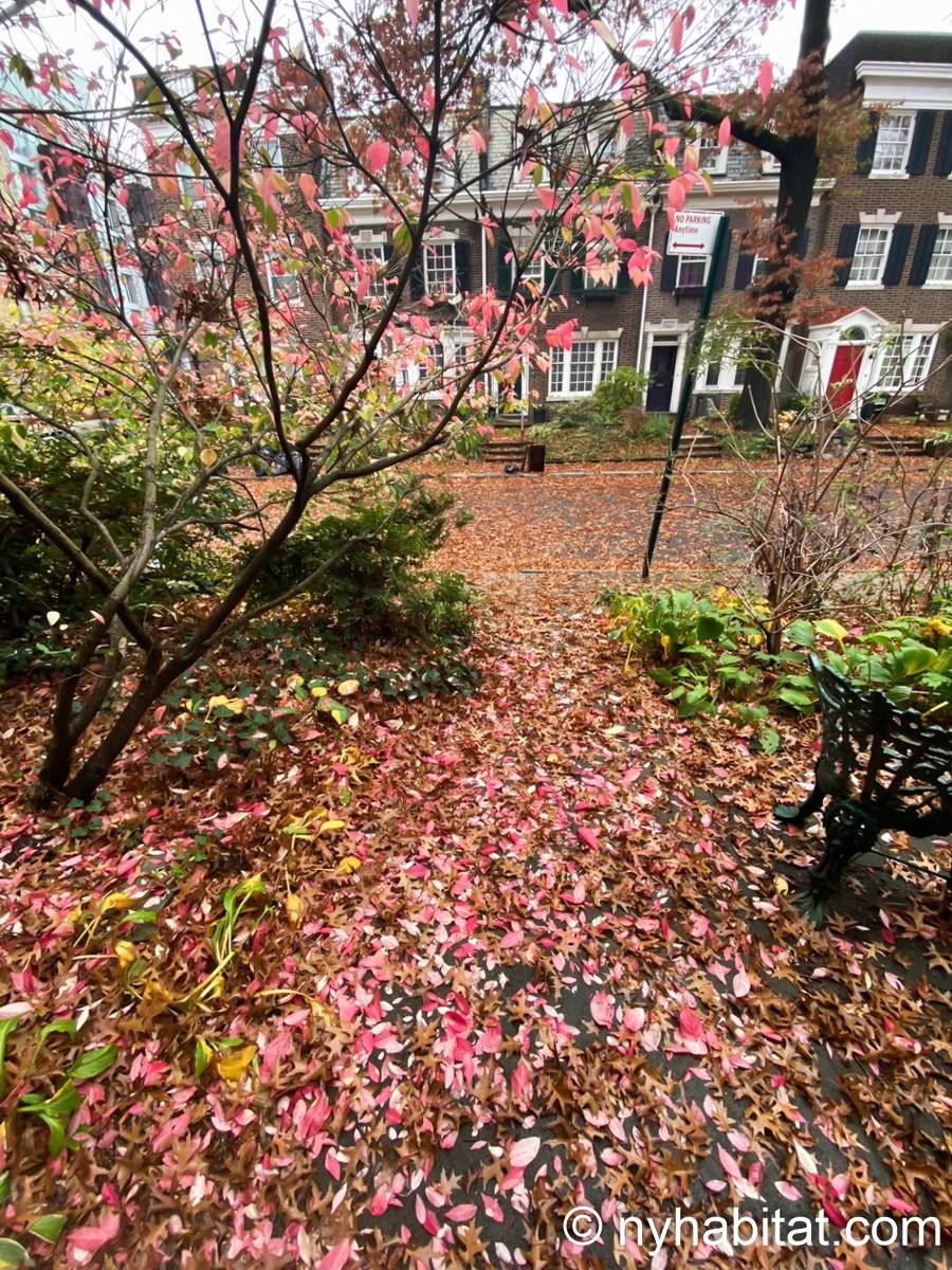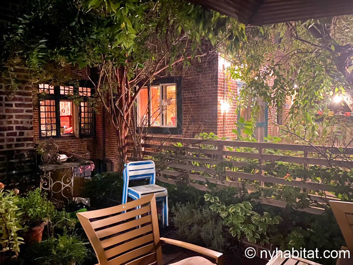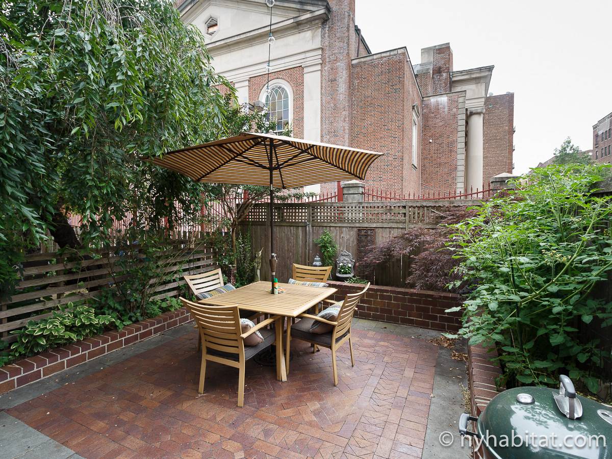 Dans la cuisine, une porte mène à un jardin commun. Vous y trouverez quelques jolies plantes ainsi qu’une table et des chaises d’extérieur pour manger dehors.