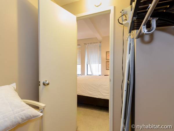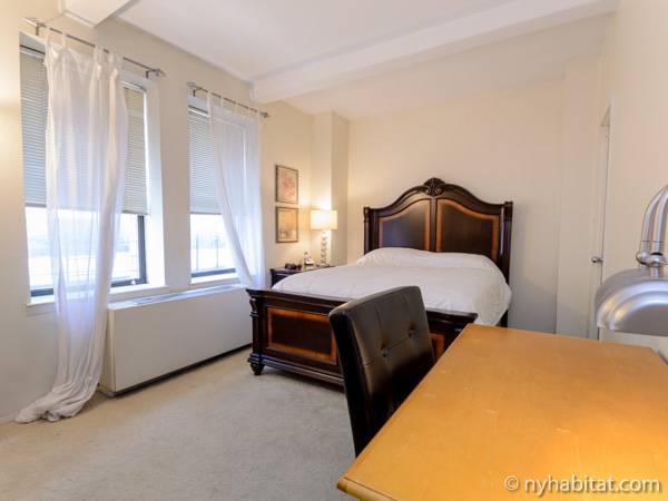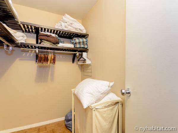 La chambre dévoile un cadre élégant et décontracté. Deux grandes fenêtres habillées de rideaux blancs donnent sur la rue. L’appartement étant situé dans les derniers étages, le bruit de la rue est presque inaudible. Il est équipé d’un lit double et d’un bureau avec une chaise. Pour un maximum d’espace de rangement, un dressing est rattaché à la chambre – un privilège à New-York ! Une commode en bois foncé avec des tiroirs et un miroir est également fournie.